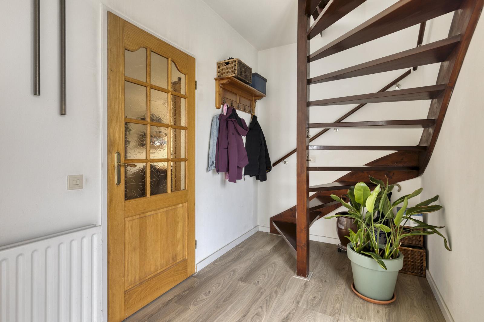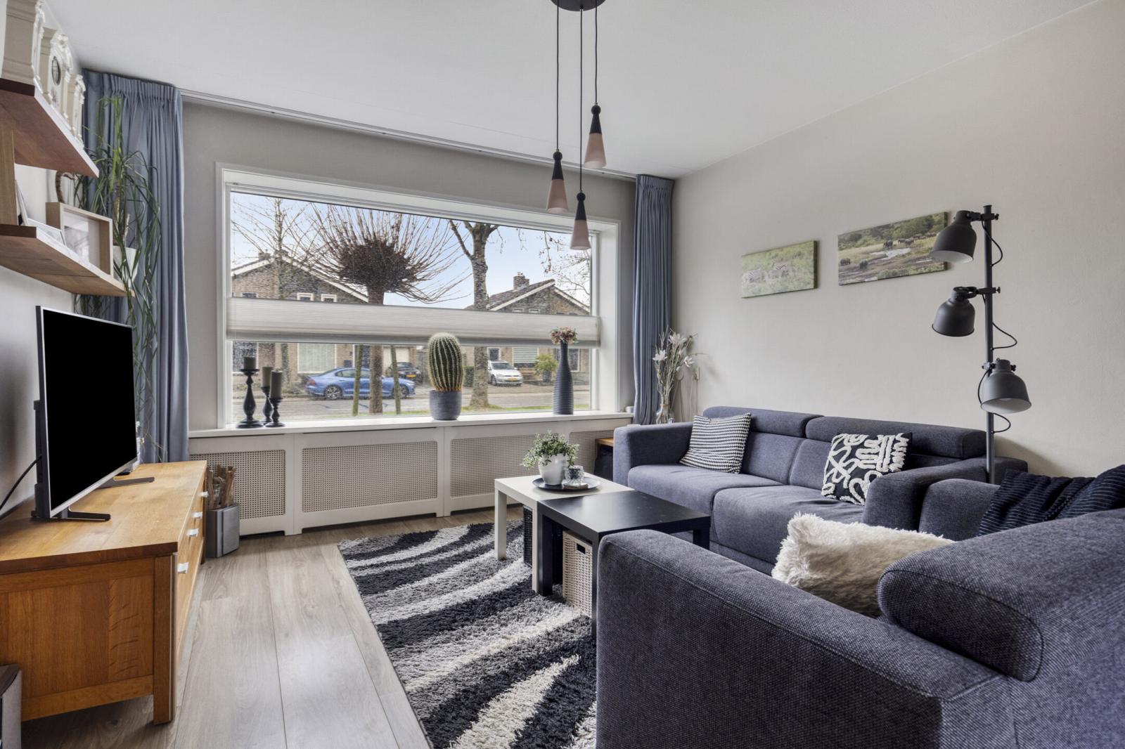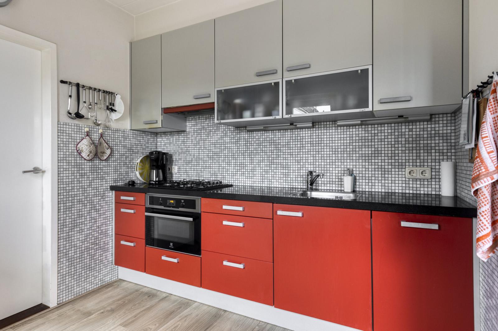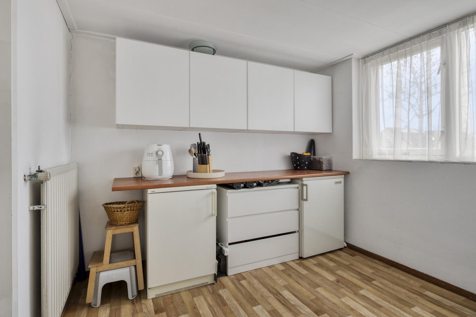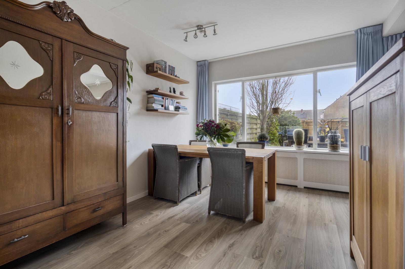 Binnenkomst in de hal met meterkast en toilet met fonteintje. Vanuit de hal stap je in de lichte woonkamer met grote raampartijen, wat zorgt voor een prettige lichtinval en een ruimtelijk gevoel. Aan de achterzijde bevindt zich de halfopen keuken, voorzien van een gasfornuis, combimagnetron, vaatwasser en afzuigkap.