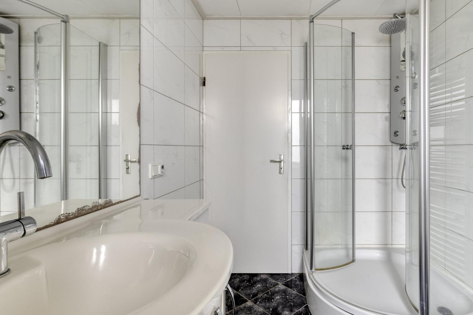 De badkamer is netjes afgewerkt en beschikt over een douche, wastafelmeubel en toilet.