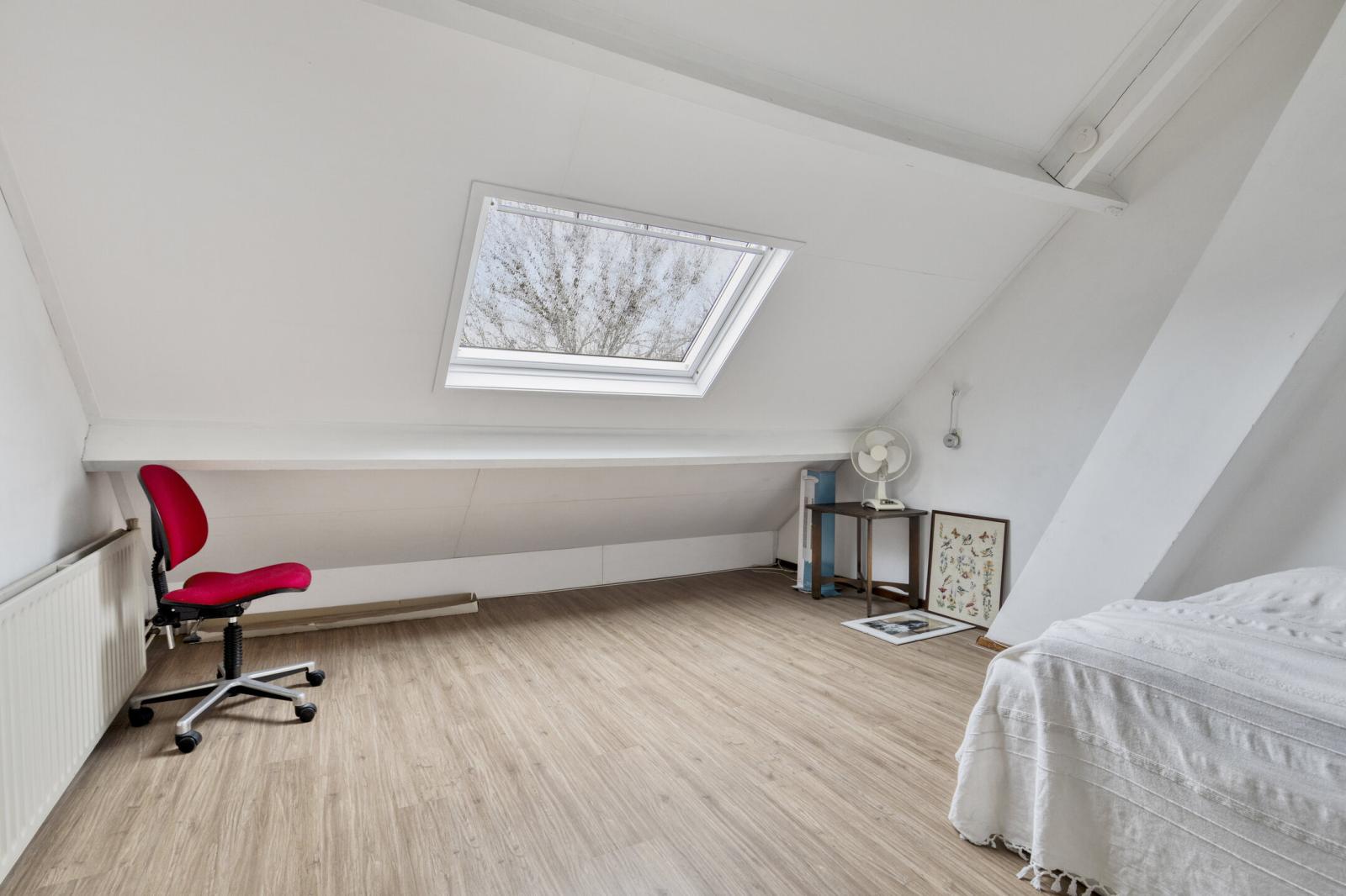 De zolderverdieping is bereikbaar via een vaste trap en beschikt over een overloop met cv-opstelling, bergruimte en een vierde slaapkamer van ca. 14 m² (gemeten binnen de 1,5 m lijn).