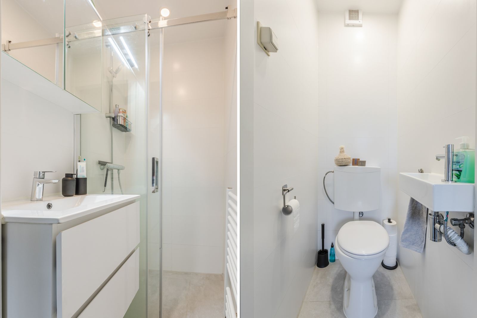 De badkamer is voorzien van een nette douche en een vaste wastafel. Daarnaast is er een apart toilet met een fontein.