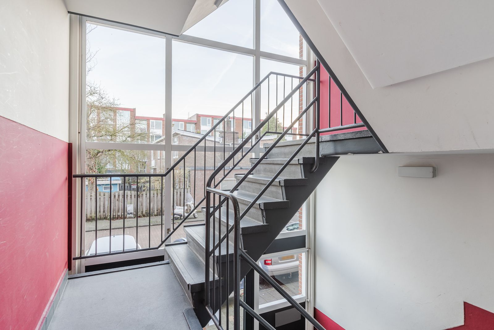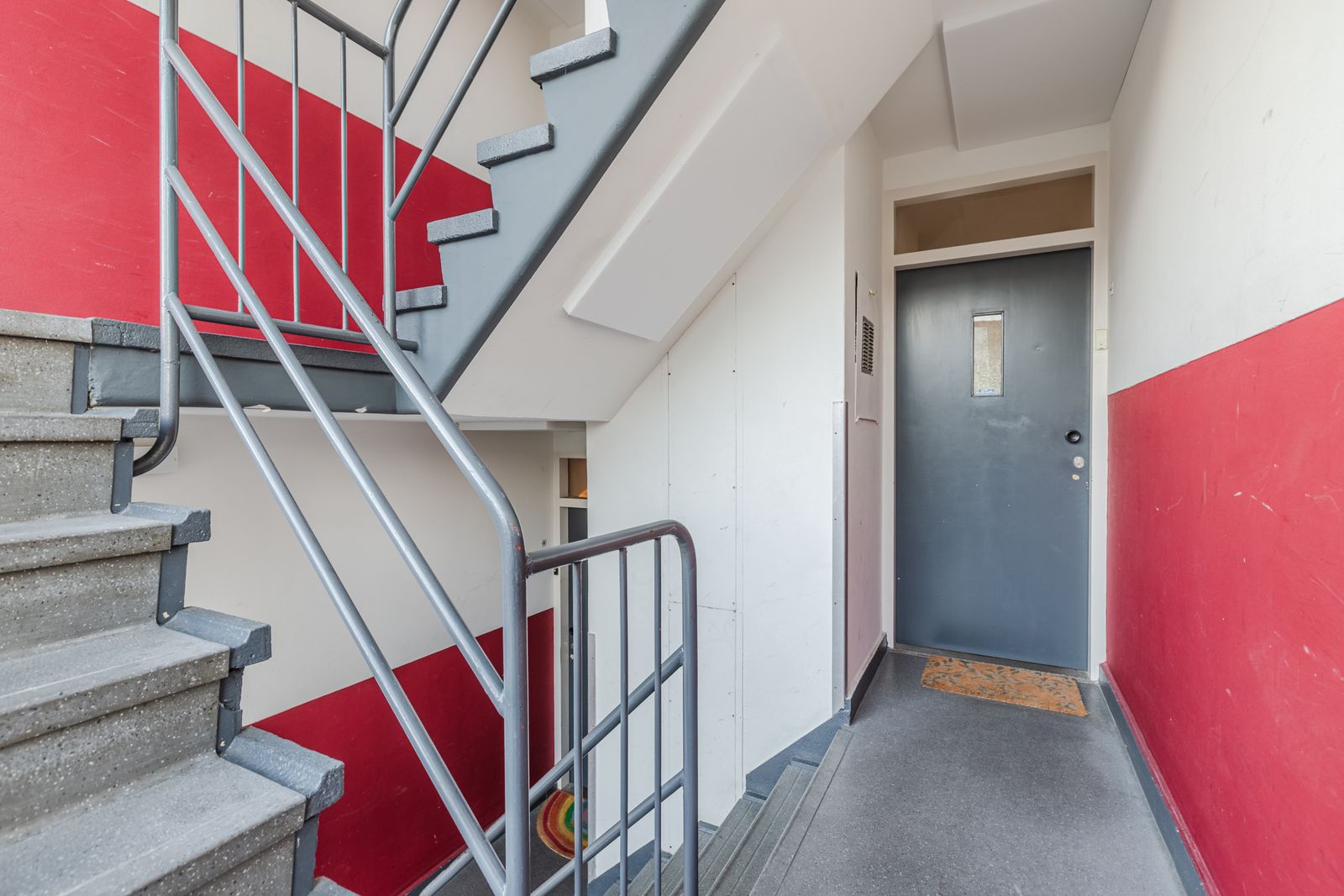 Gemeenschappelijk portiek met trappenhuis en toegang tot de bergingen.