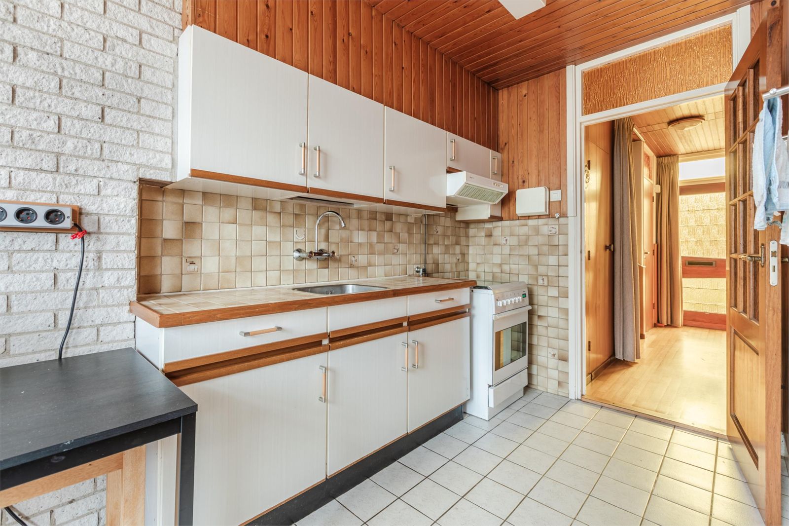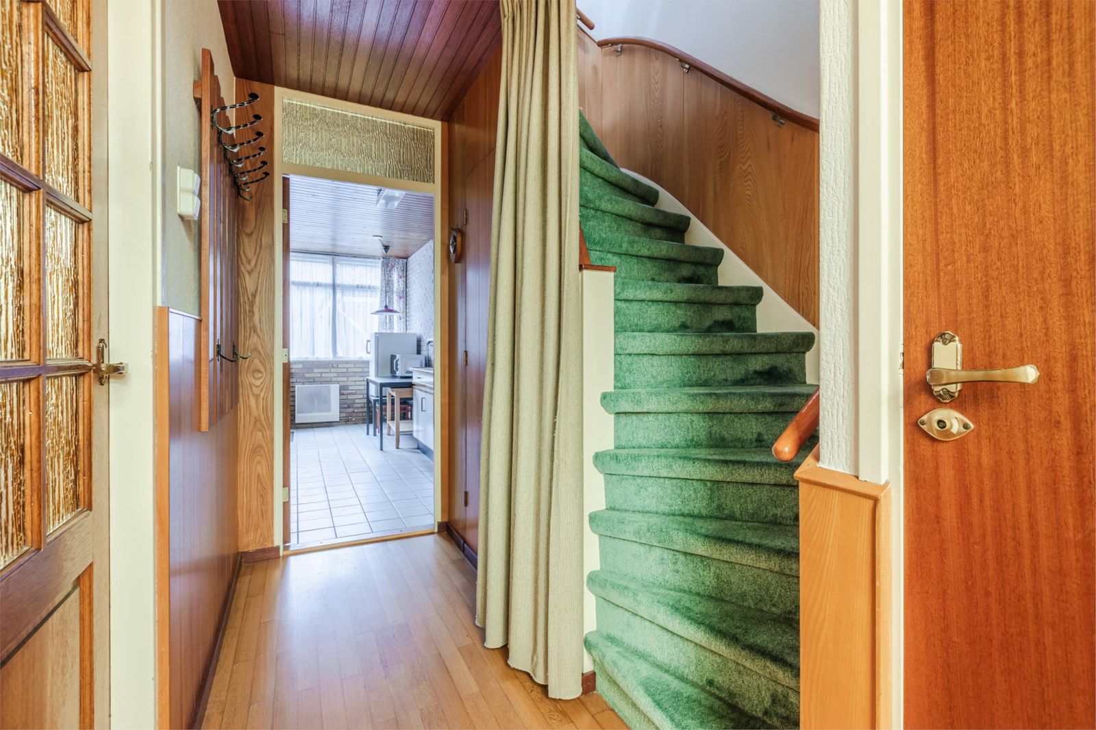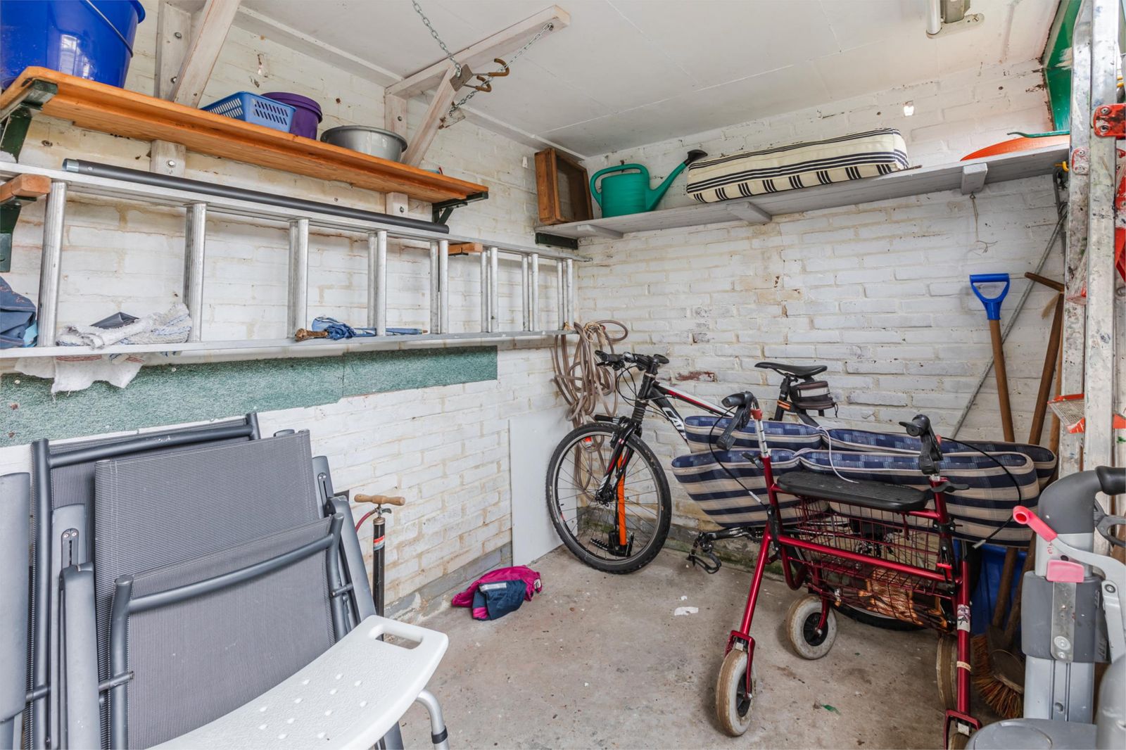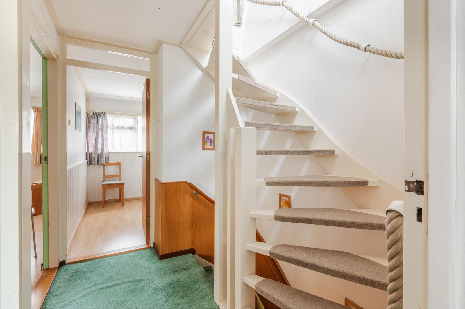 Aan de rechterzijde zijn de toiletruimte met fonteintje, de trapopgang en een ruime kelderkast. Vanuit de hal loop je links de woonkamer in, met grote ramen aan de voor- en achterzijde. Rechtdoor in de hal loop je de uitgebouwde keuken binnen en geeft de achterdeur je toegang tot het terras en de zonnige, op het zuiden gelegen, achtertuin met berging.
