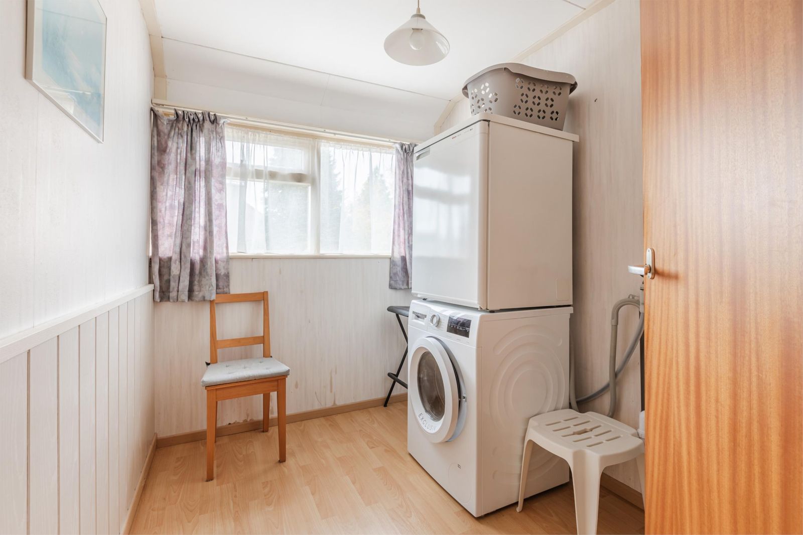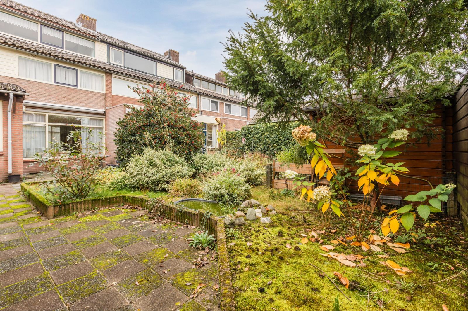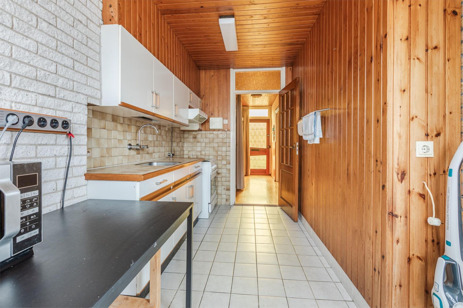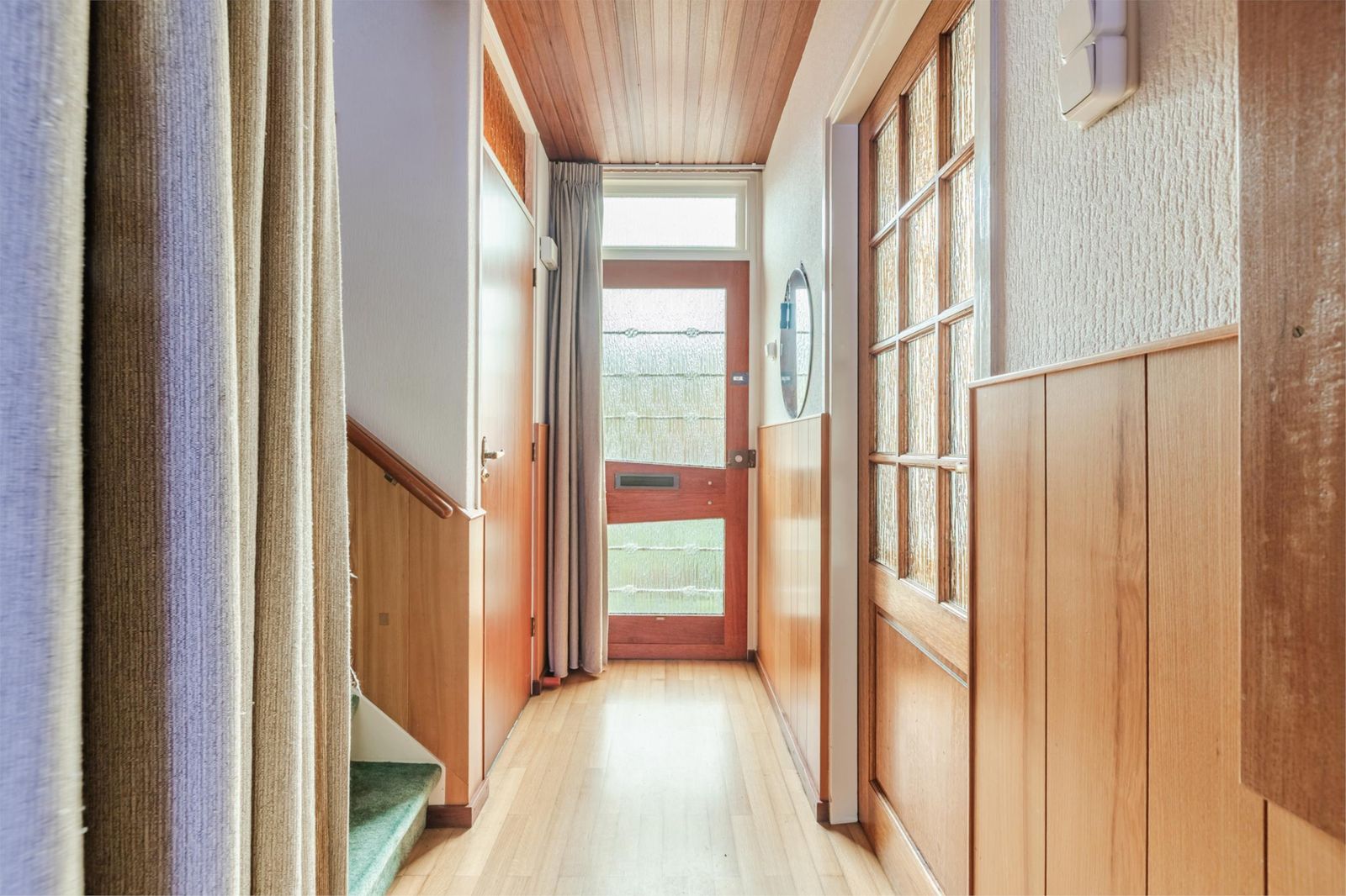 Aan de rechterzijde zijn de toiletruimte met fonteintje, de trapopgang en een ruime kelderkast. Vanuit de hal loop je links de woonkamer in, met grote ramen aan de voor- en achterzijde. Rechtdoor in de hal loop je de uitgebouwde keuken binnen en geeft de achterdeur je toegang tot het terras en de zonnige, op het zuiden gelegen, achtertuin met berging.