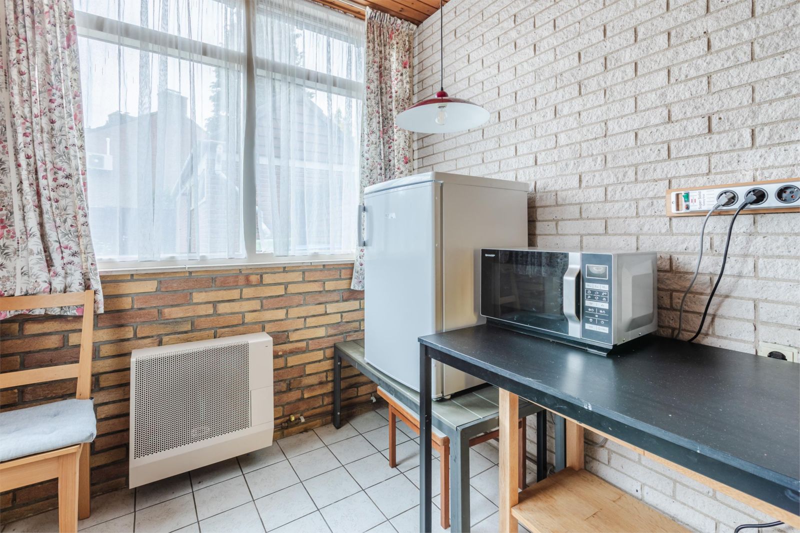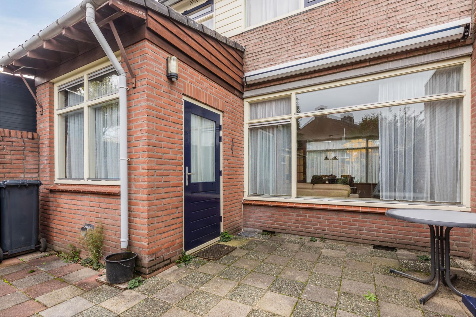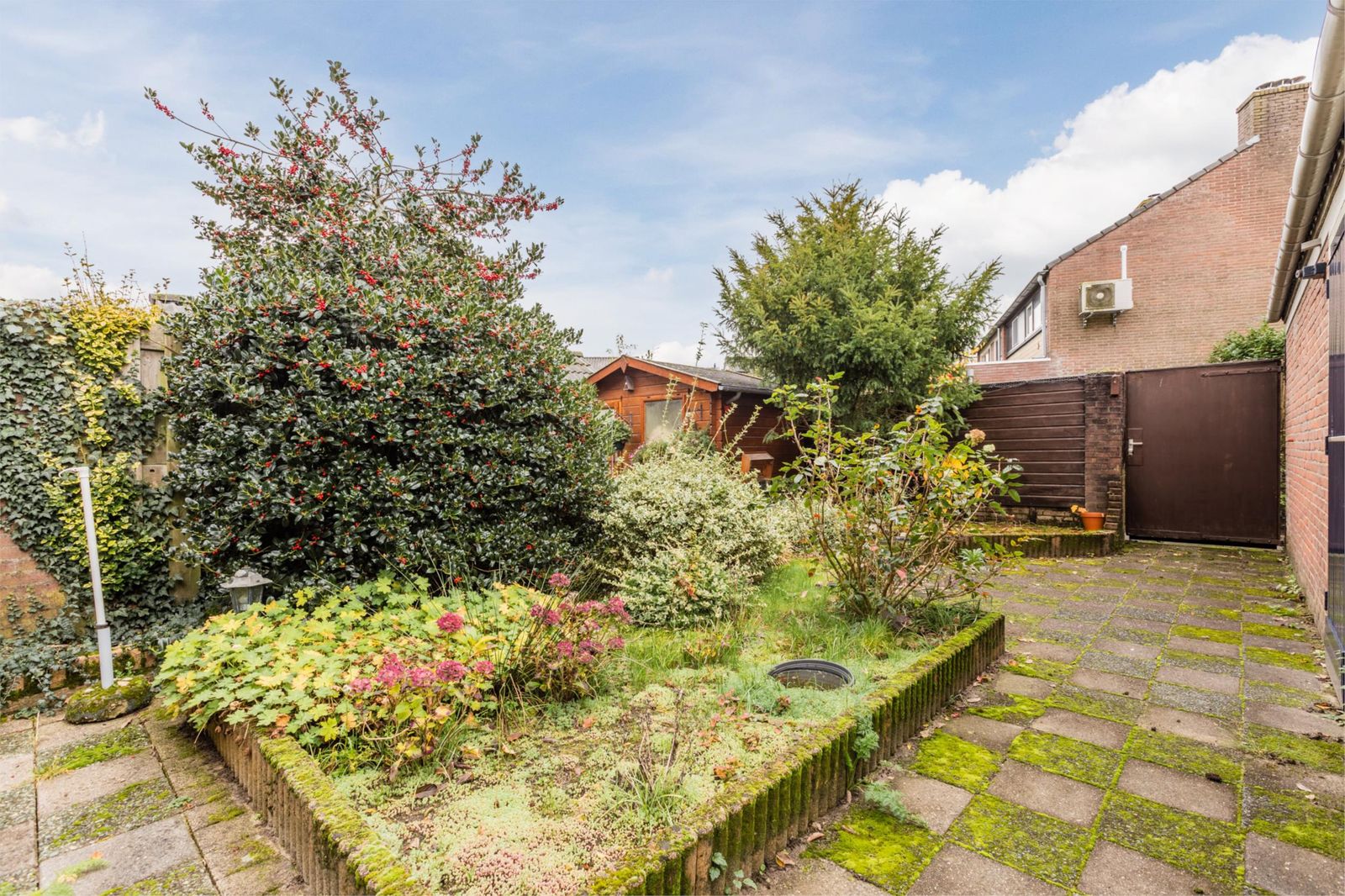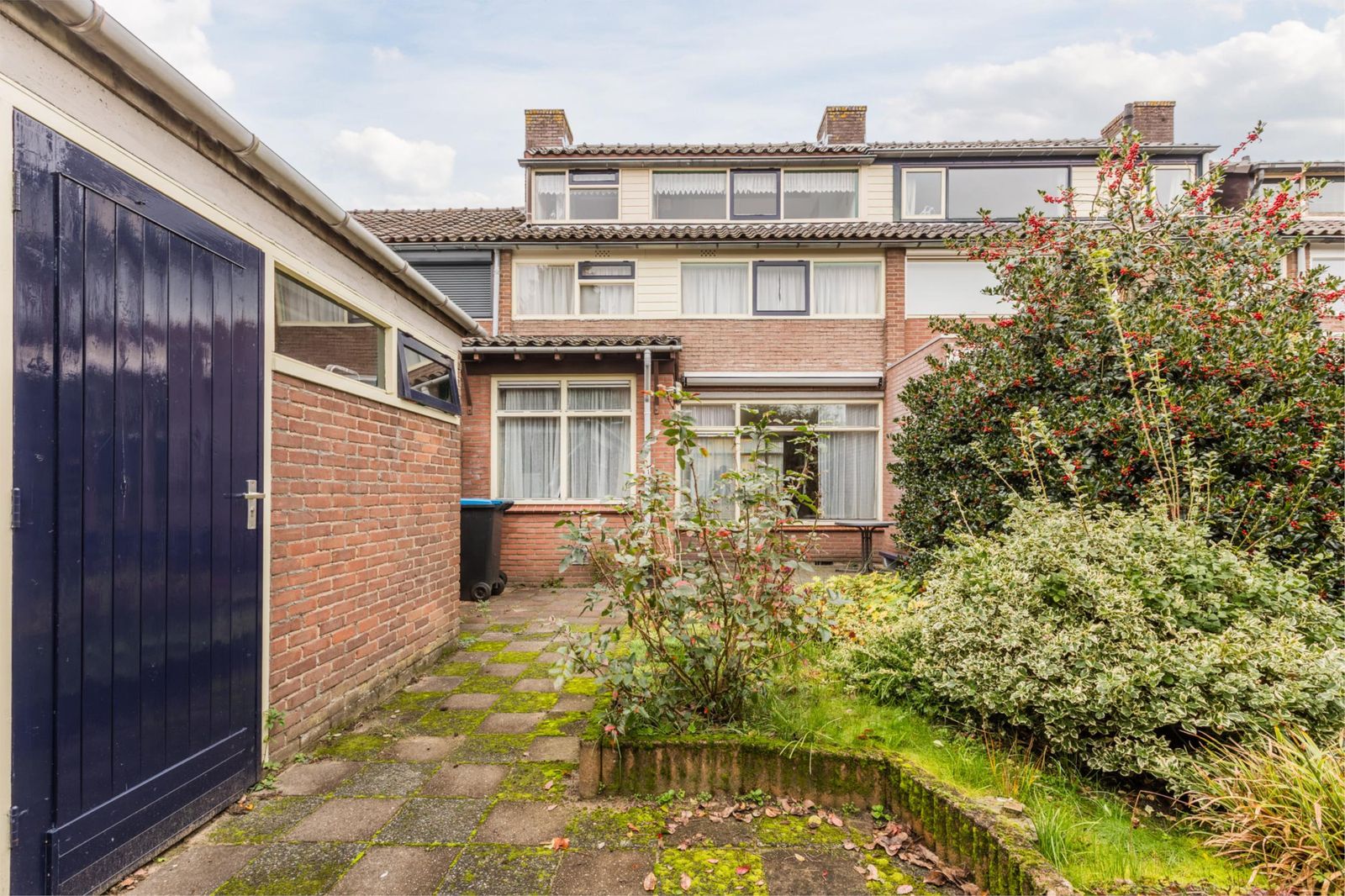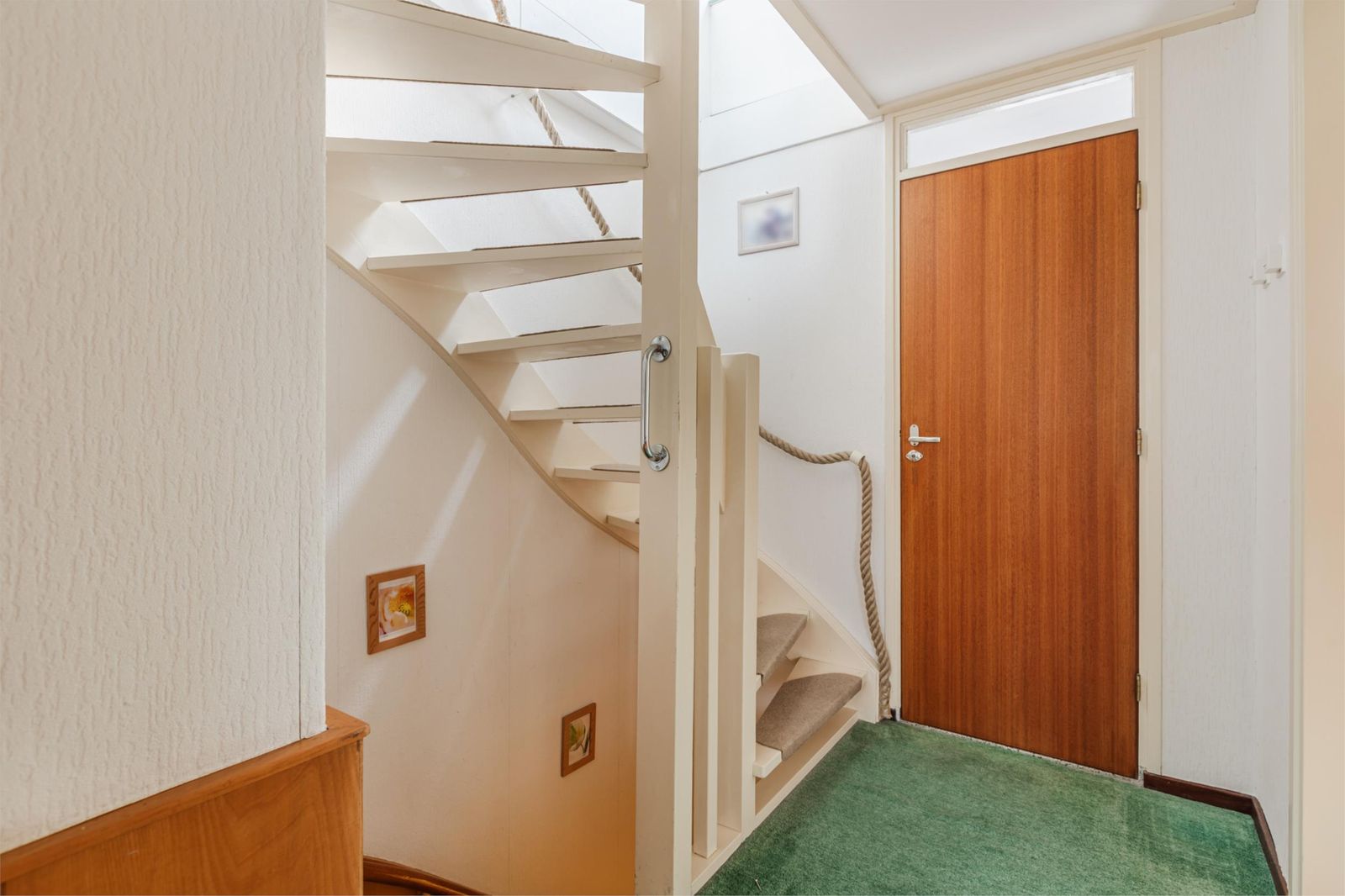 Aan de rechterzijde zijn de toiletruimte met fonteintje, de trapopgang en een ruime kelderkast. Vanuit de hal loop je links de woonkamer in, met grote ramen aan de voor- en achterzijde. Rechtdoor in de hal loop je de uitgebouwde keuken binnen en geeft de achterdeur je toegang tot het terras en de zonnige, op het zuiden gelegen, achtertuin met berging.