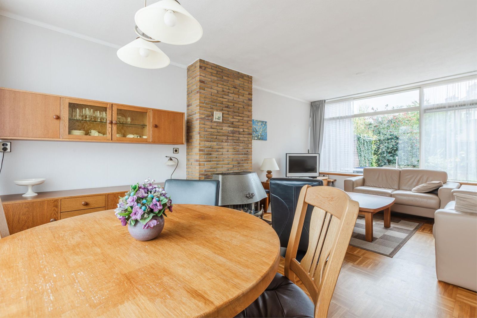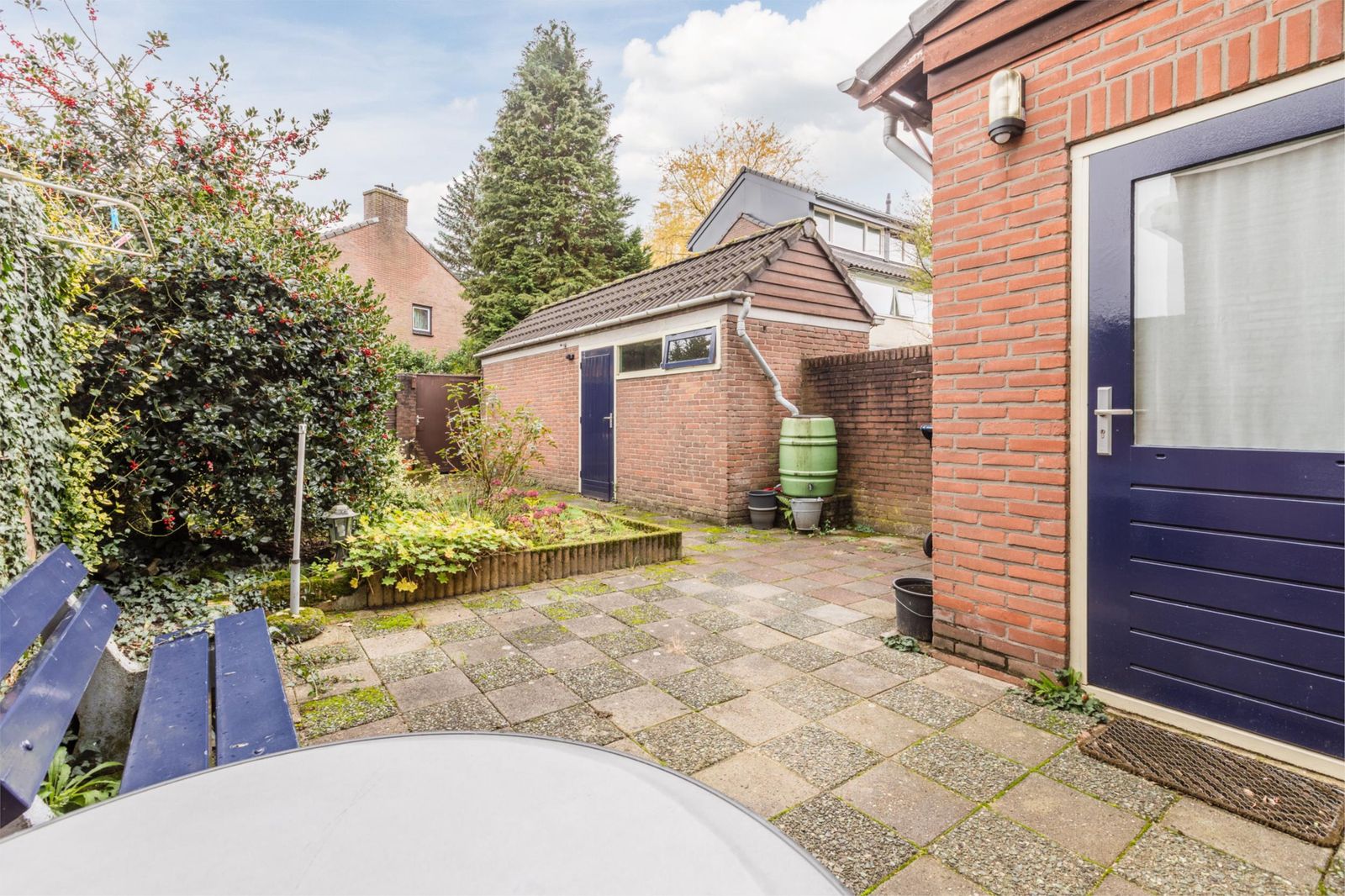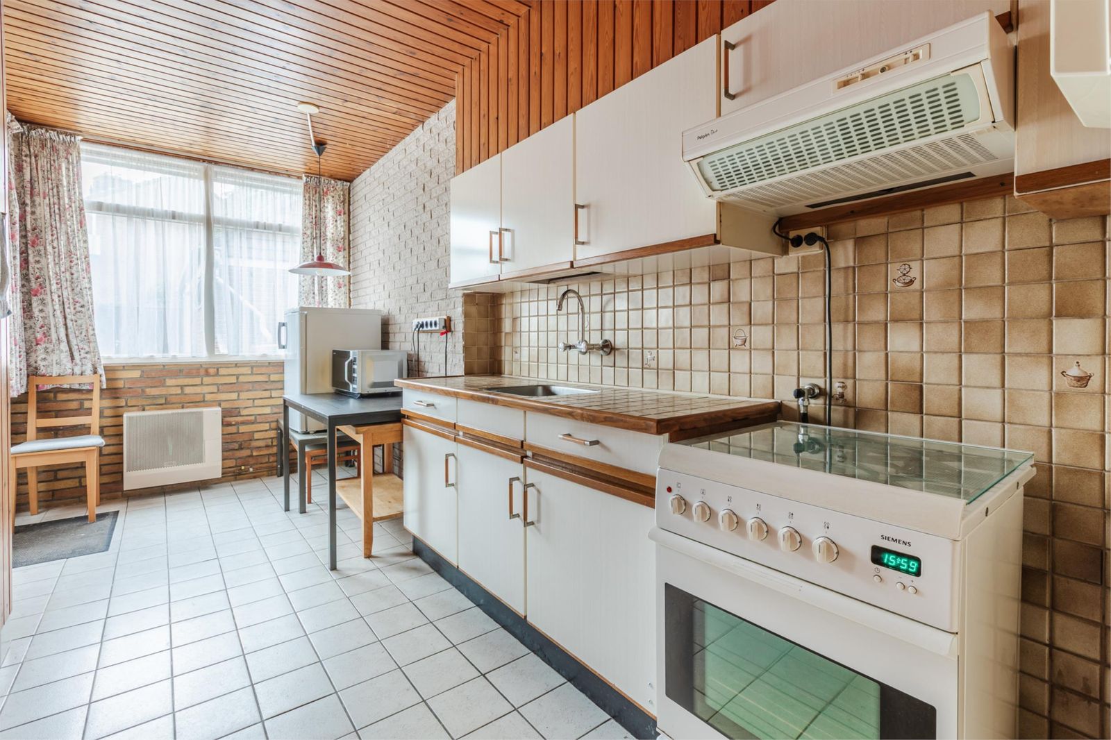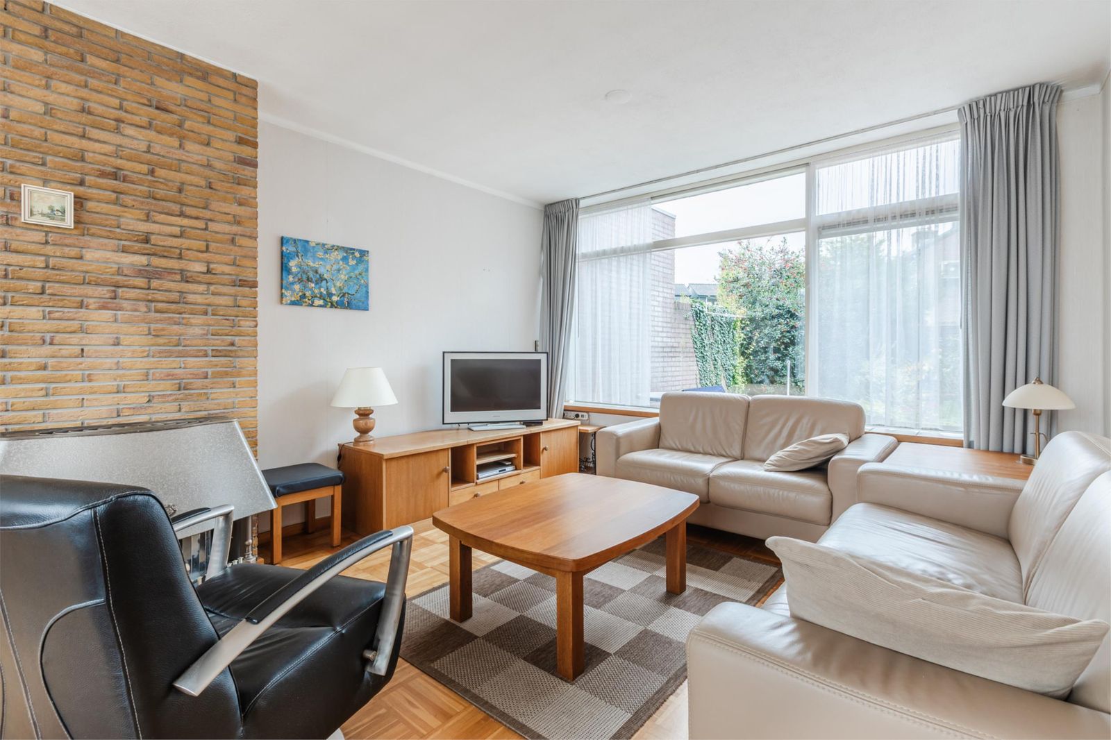 Aan de rechterzijde zijn de toiletruimte met fonteintje, de trapopgang en een ruime kelderkast. Vanuit de hal loop je links de woonkamer in, met grote ramen aan de voor- en achterzijde. Rechtdoor in de hal loop je de uitgebouwde keuken binnen en geeft de achterdeur je toegang tot het terras en de zonnige, op het zuiden gelegen, achtertuin met berging.
