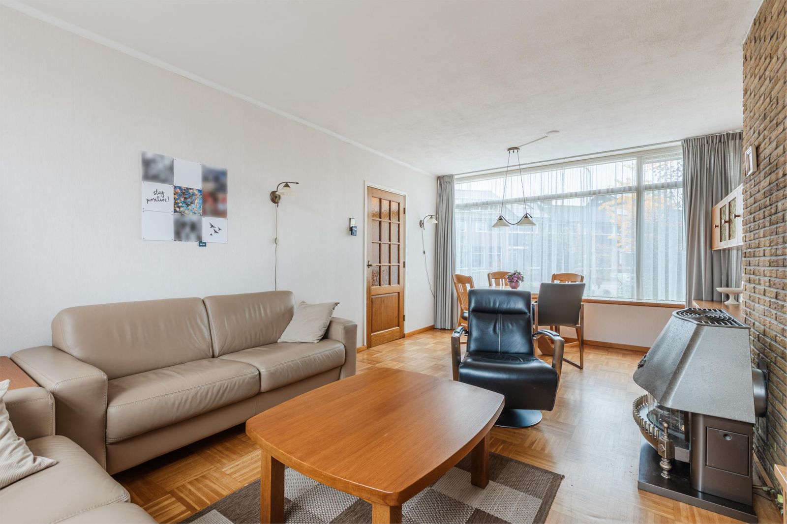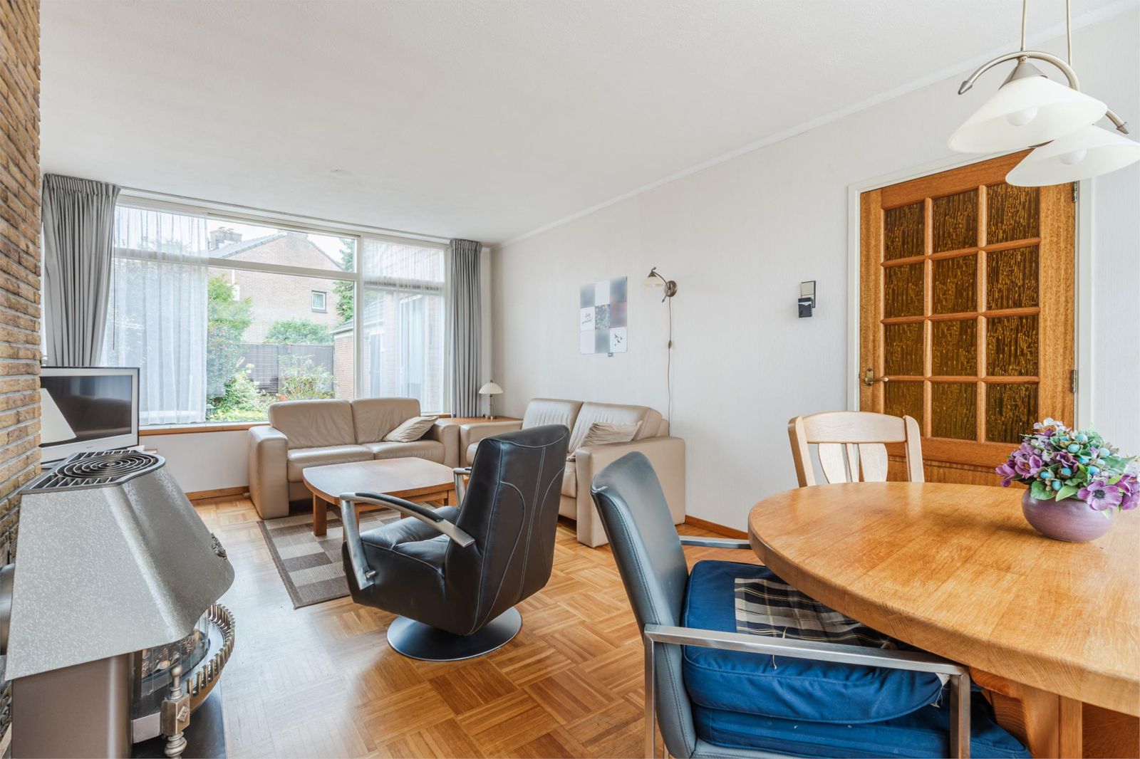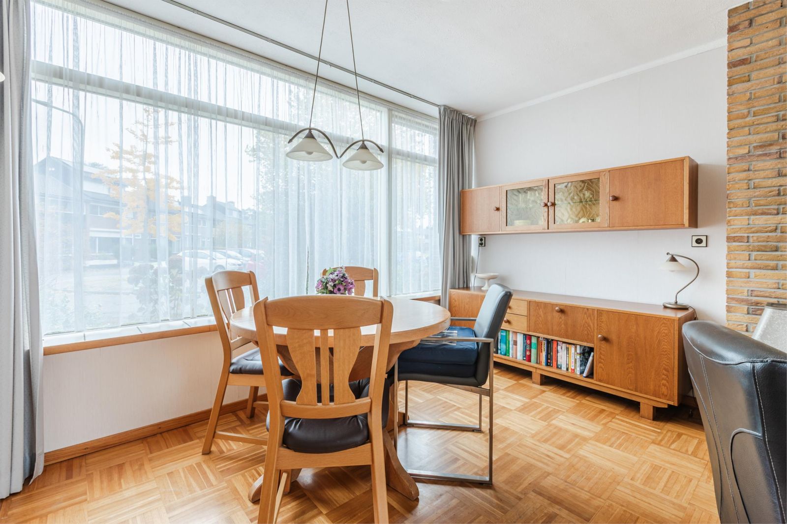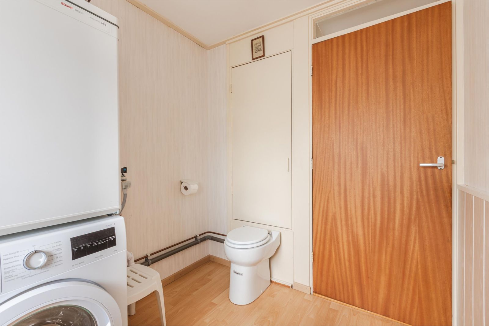 Aan de rechterzijde zijn de toiletruimte met fonteintje, de trapopgang en een ruime kelderkast. Vanuit de hal loop je links de woonkamer in, met grote ramen aan de voor- en achterzijde. Rechtdoor in de hal loop je de uitgebouwde keuken binnen en geeft de achterdeur je toegang tot het terras en de zonnige, op het zuiden gelegen, achtertuin met berging.