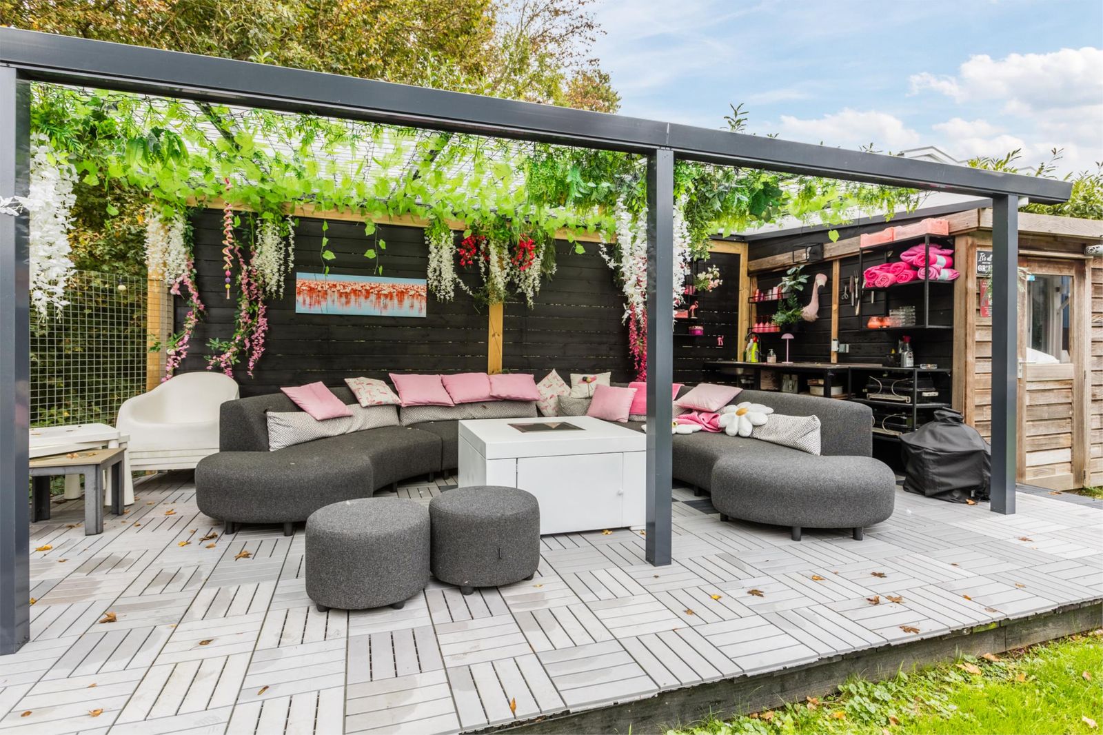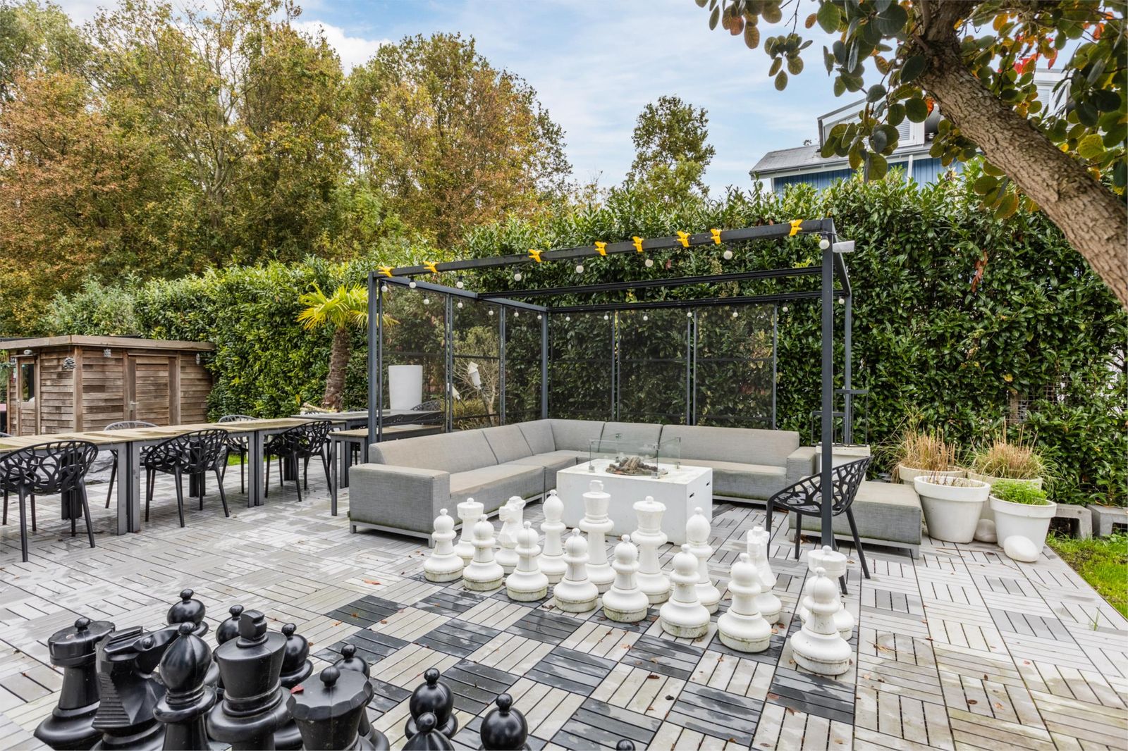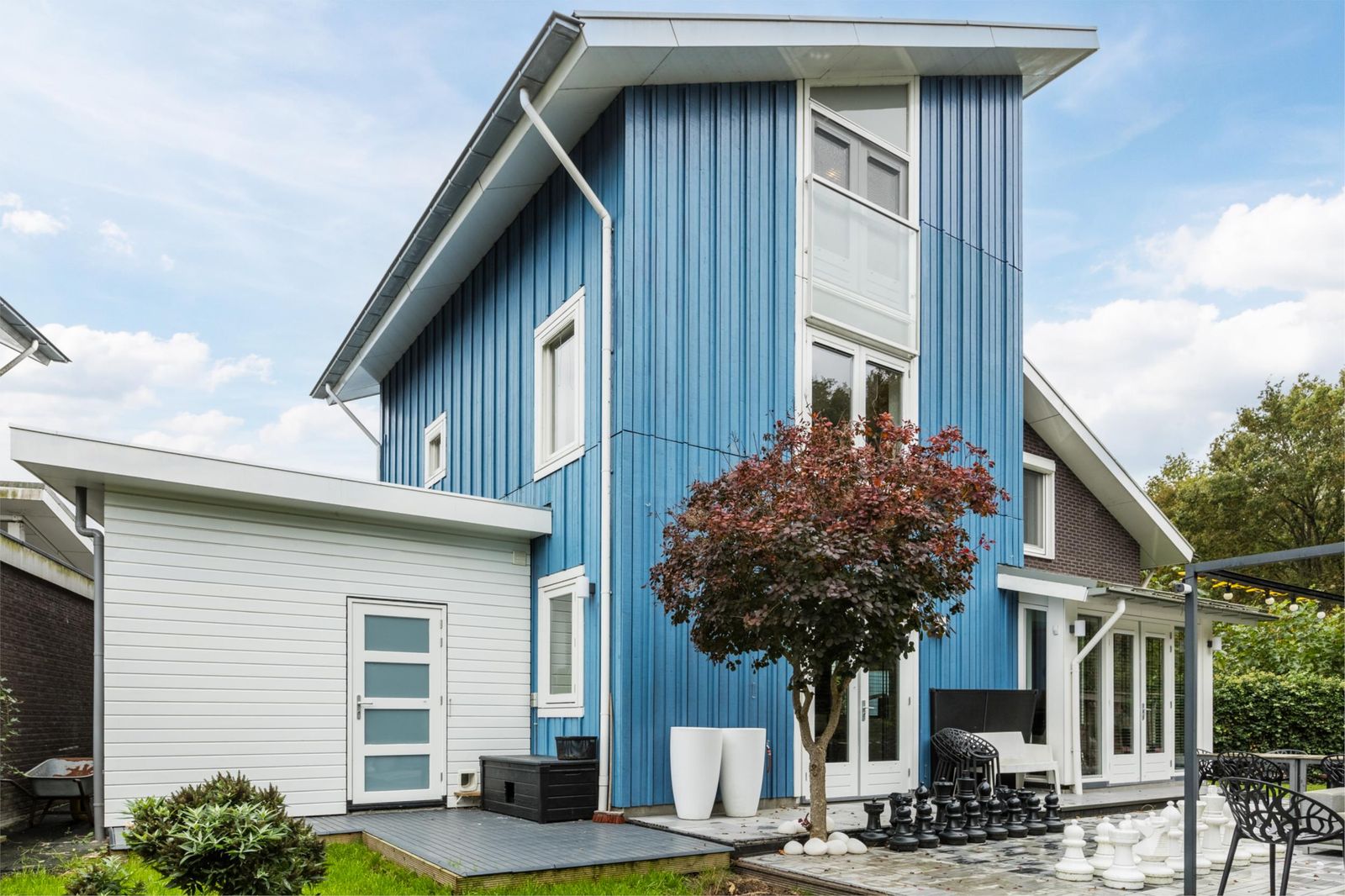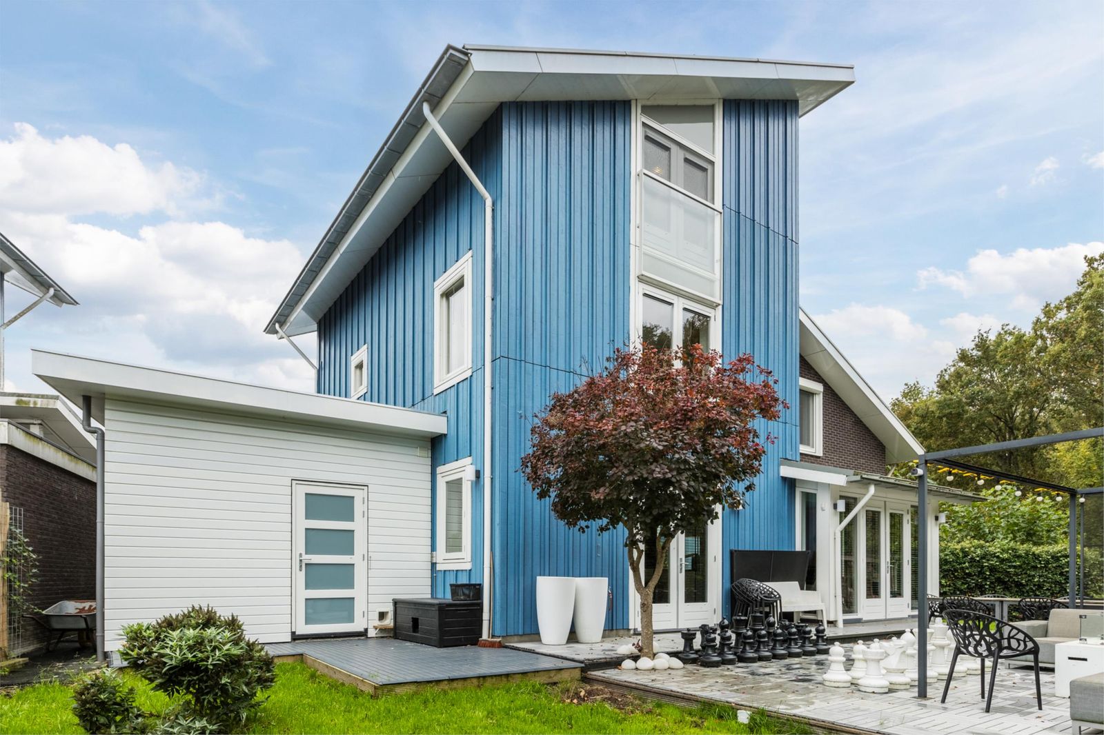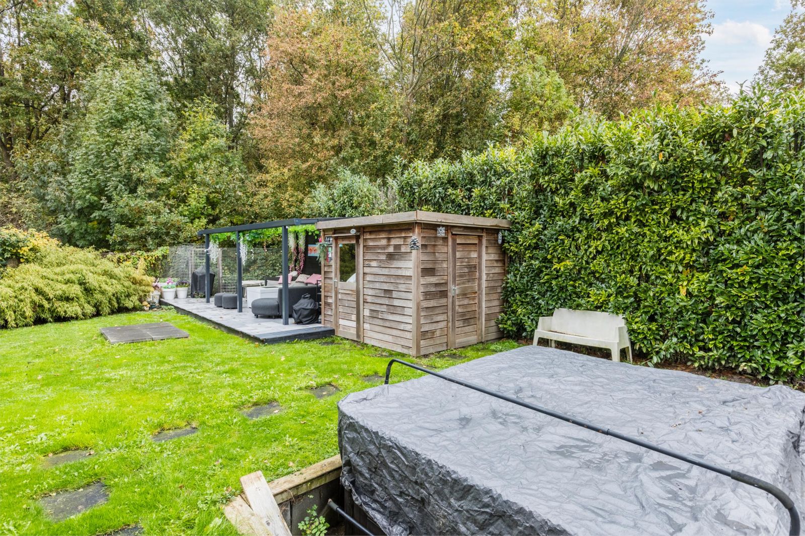 Direct aan het huis bevindt zich in de achtertuin een ruim vlonderterras, perfect om te ontspannen of te dineren met uitzicht op het groen. Verderop, aan de bosrandzijde, is nog een tweede vlonderterras met overkapping, waar eveneens ruimte is voor een loungeset en buitenkeuken.