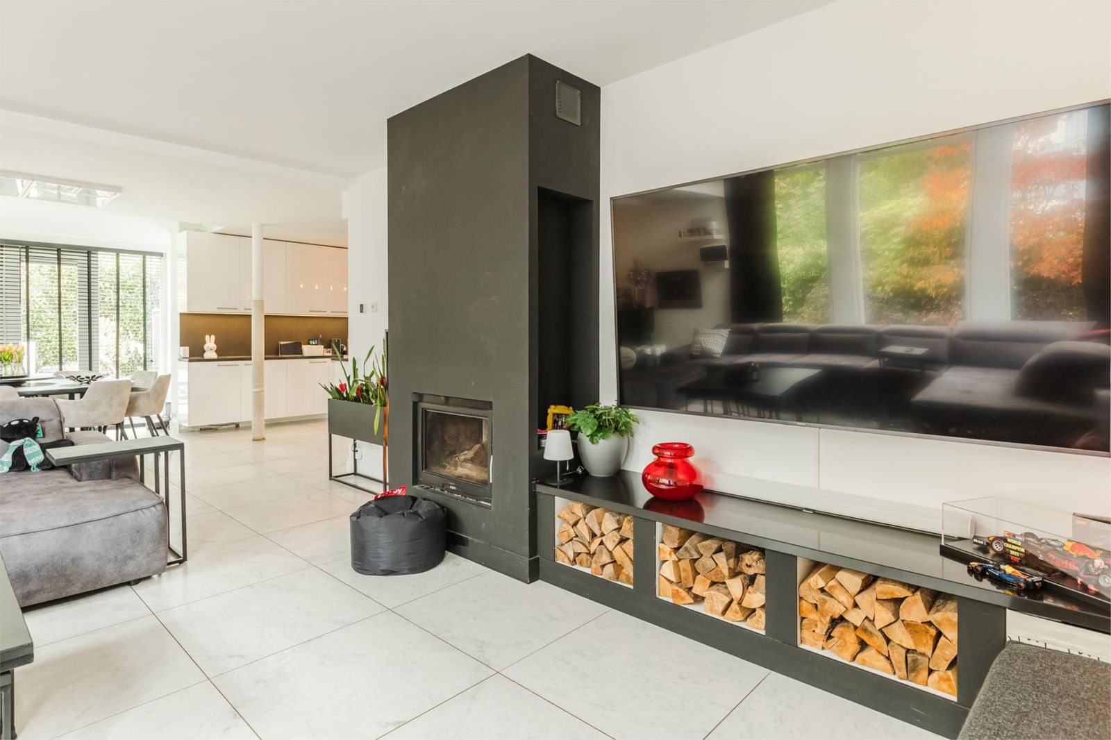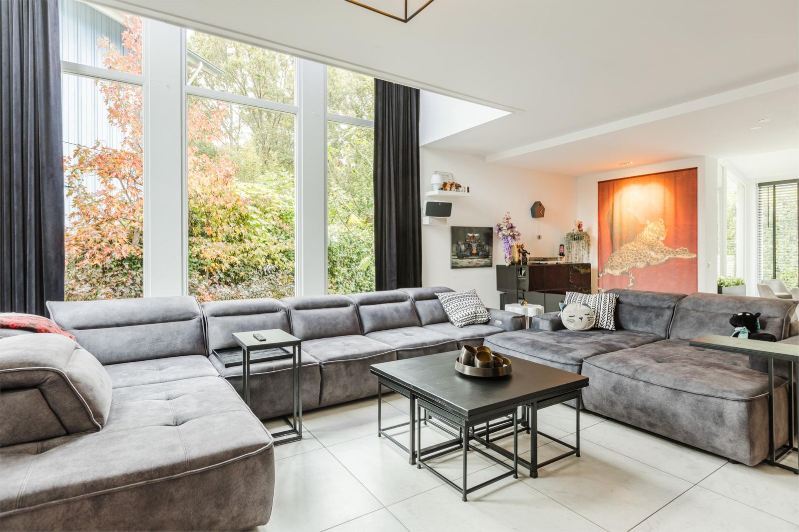 De begane grond is voorzien van vloertegels van 90×90 cm, die zorgen voor een luxe en ruimtelijke uitstraling. De woonkamer met open keuken beslaat maar liefst 73 m² en is voorzien van een sfeervolle houtkachel– de ideale combinatie van warmte, comfort en sfeer. De moderne keuken met kookeiland vormt het hart van de ruimte: een stijlvolle, praktische plek met hoogwaardige inbouwapparatuur, ideaal voor wie houdt van koken en gezelligheid.