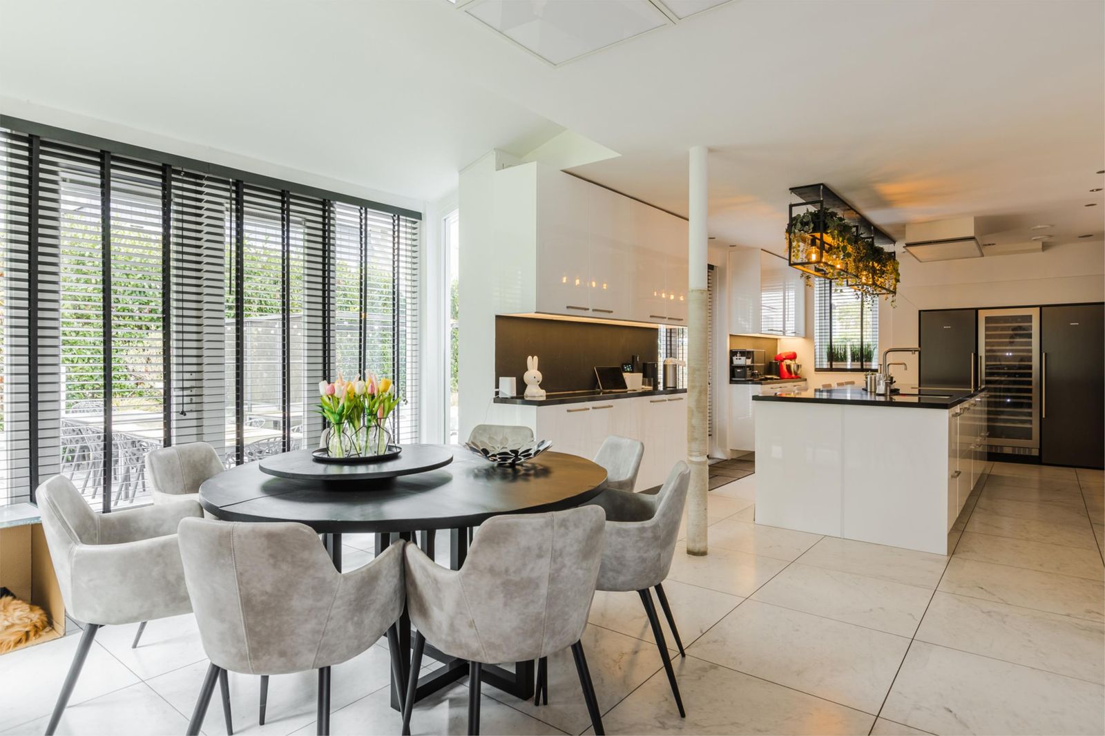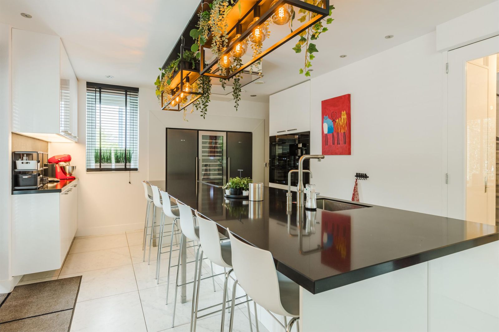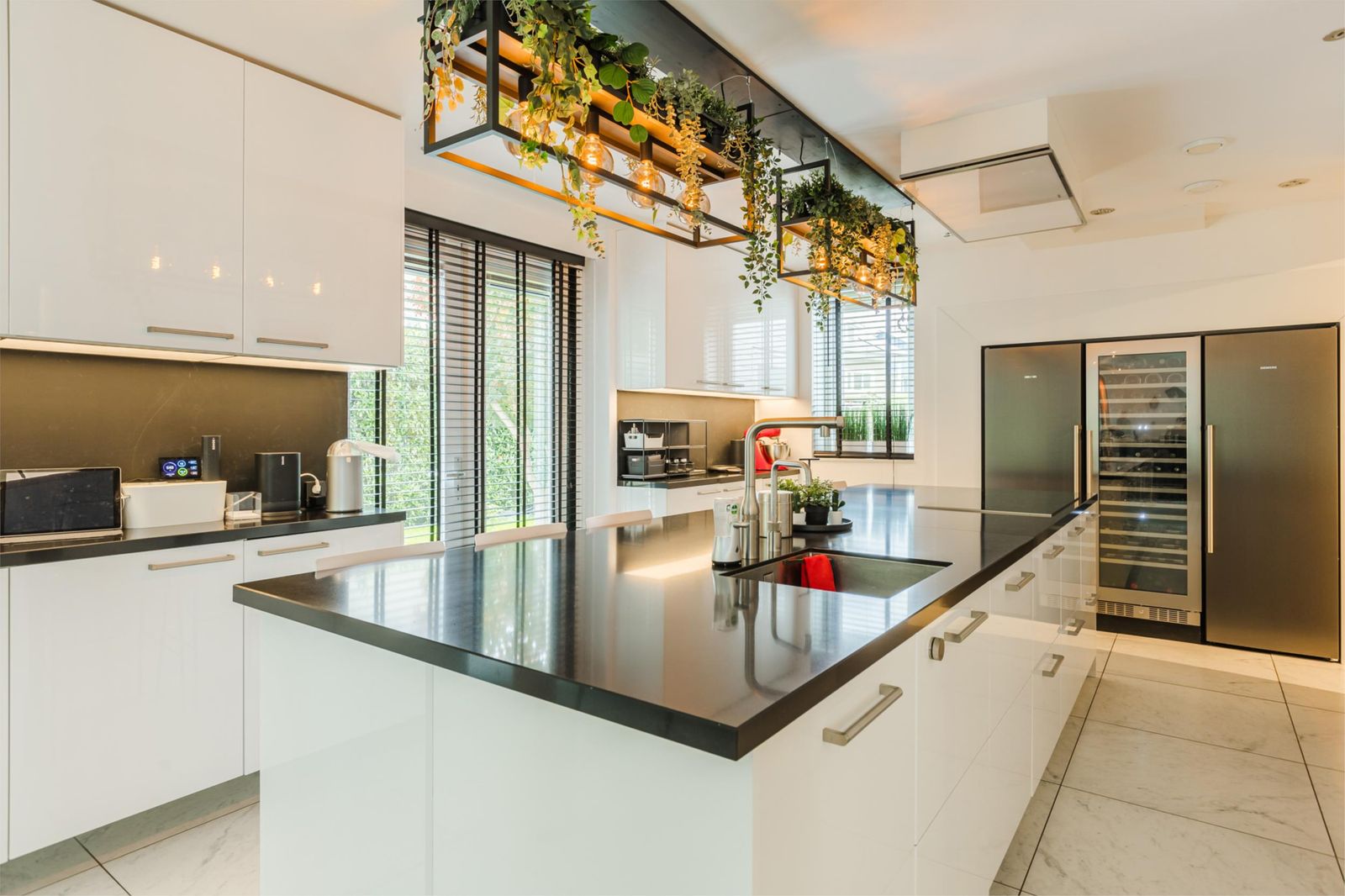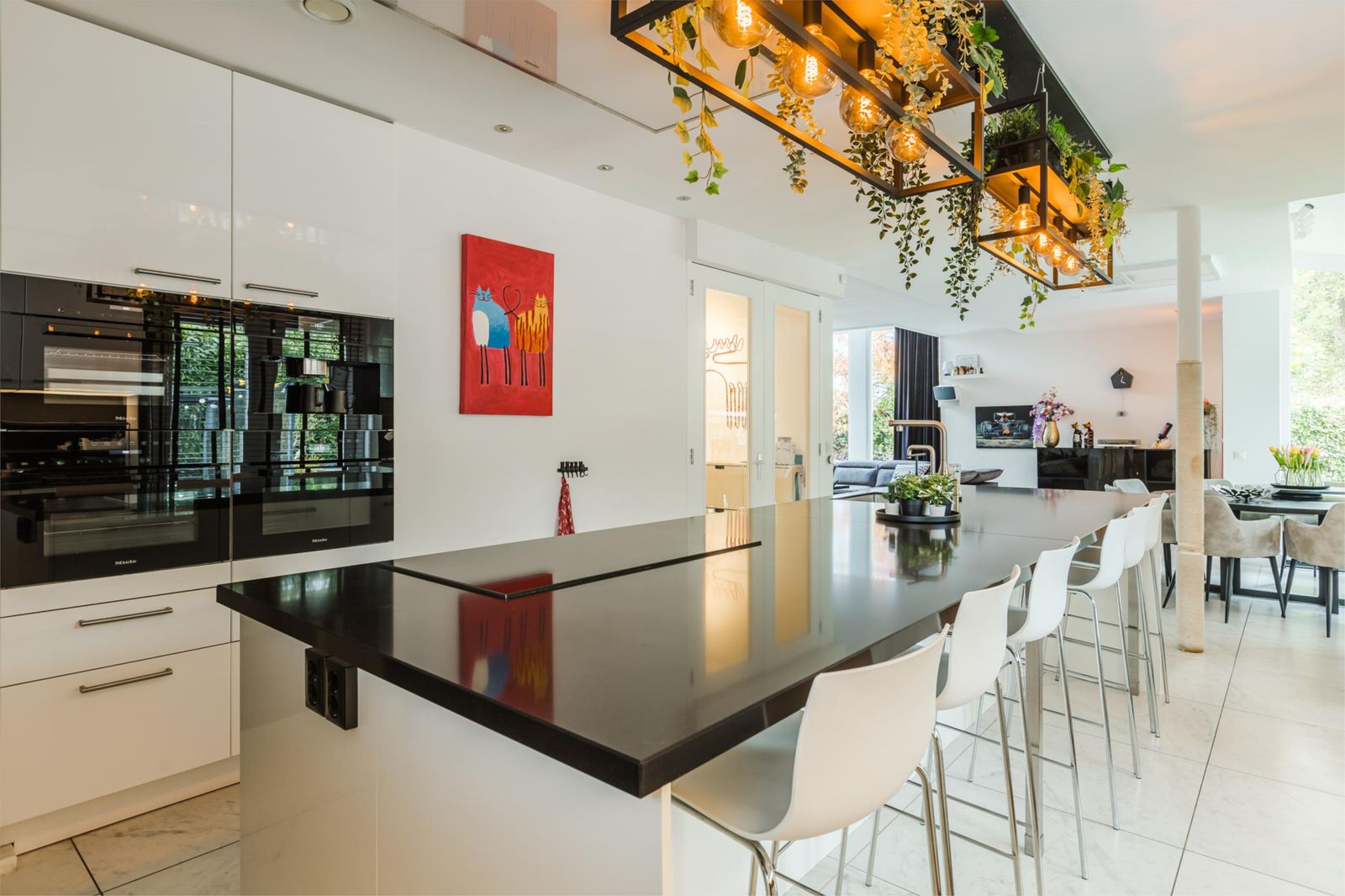 Vanuit de woonkamer is de open keuken te bereiken. De woonkeuken met kookeiland is van alle benodigdheden en luxe voorzien. De ingebouwde keukenapparaten zijn een koffiemachine, combi-oven, het lucht oven en stoomoven van het merk Miele. Een ATAG-inductie 6 pits kookplaat, koelkast en vriezer van Siemens, 3 zone wijnklimaatkast van Boretti en een heetwaterkraan van Quooker. Aan het kookeiland is plaats voor uw medehuisgenoten en of gasten. Door middel van de openslaande deuren in de keuken en in de woonkamer is de enorme achtertuin te betreden.