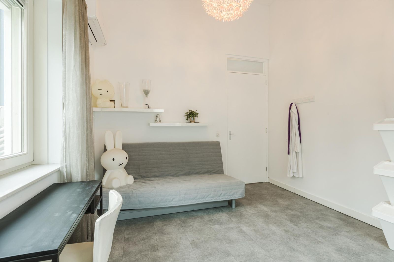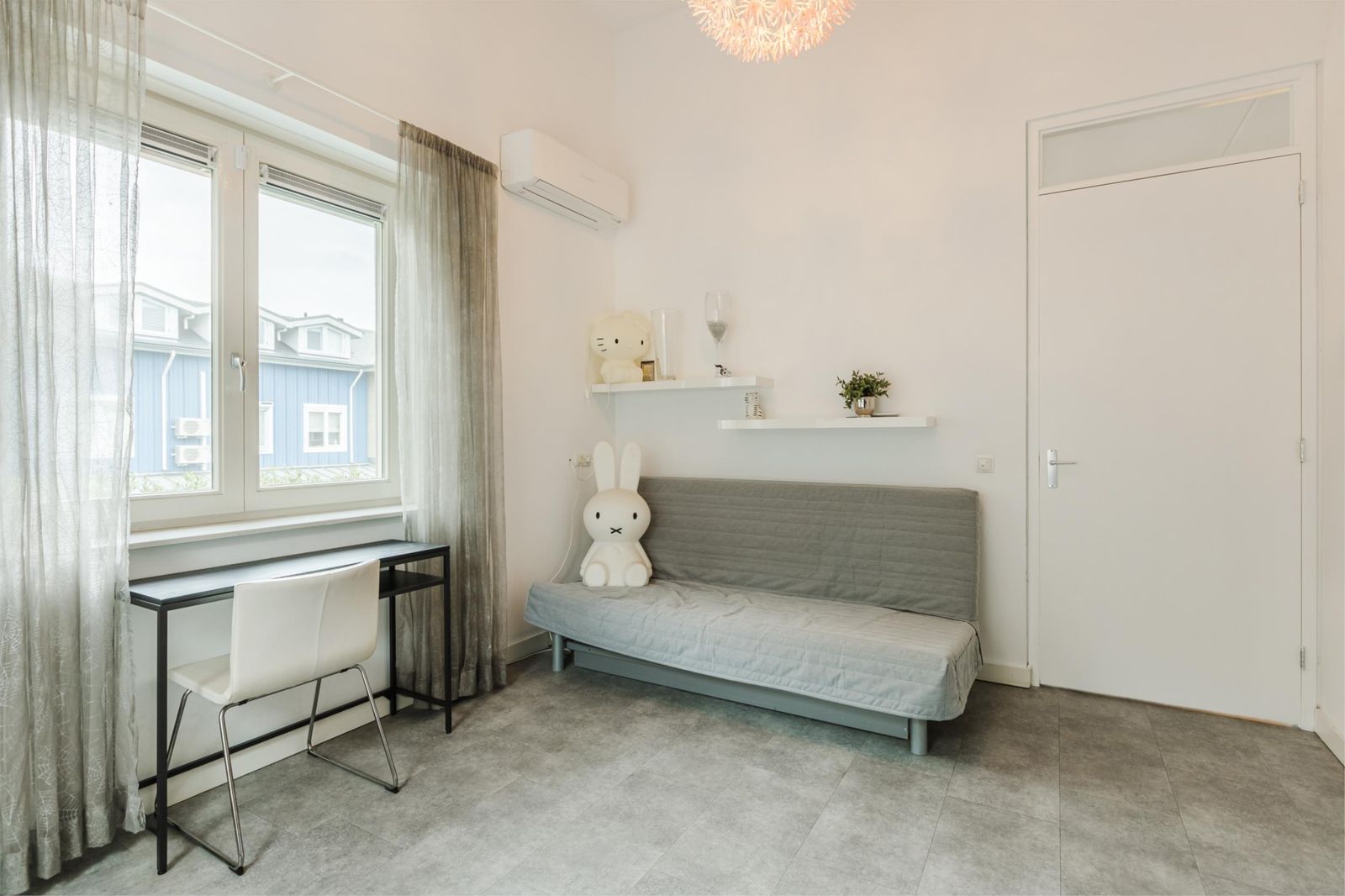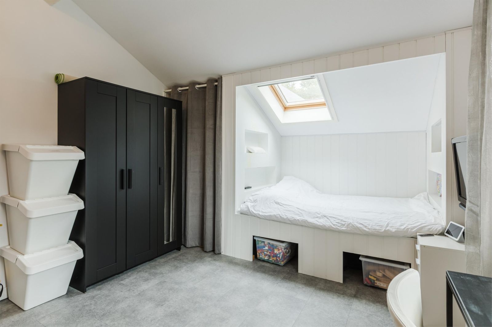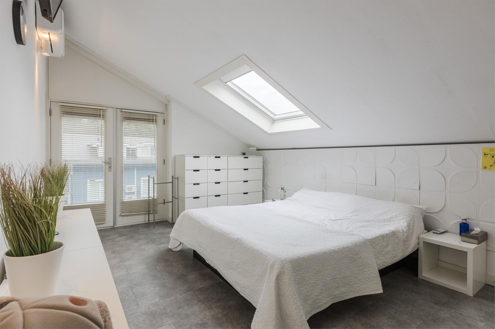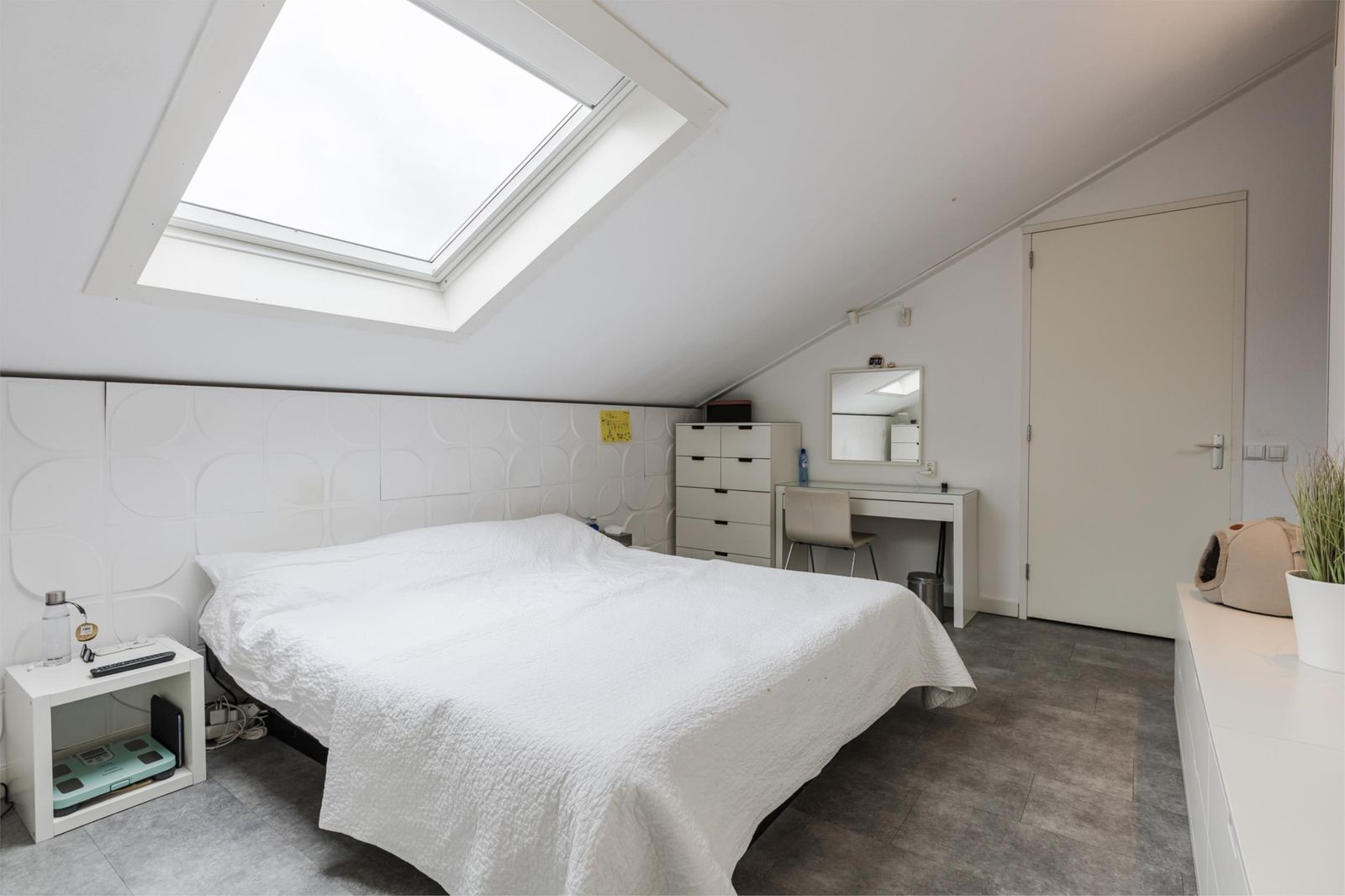 De eerste slaapkamer heeft twee deuren naar de vide die zicht biedt op de woonkamer. Door de vide is ook hier veel lichtinval. De andere twee slaapkamers voorzien van airco zijn gelegen aan de achterzijde van de woning en beschikken net als de rest van de verdieping over een mooie pvc-vloer. De tweede slaapkamer heeft net zoals de eerste slaapkamer een oplopend plafond tot bijna 4 meter. De derde slaapkamer is zeer ruim en voorzien van een eigen badkamer met inloopdouche, wastafel en hangend toilet.