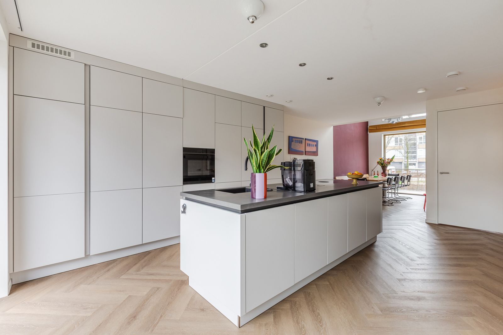 Moderne woonkeuken met een stijlvol kookeiland voorzien van koelkast, vriezer, vaatwasser, oven, Quooker en Bora inductiekookplaat met geïntegreerde afzuiging.