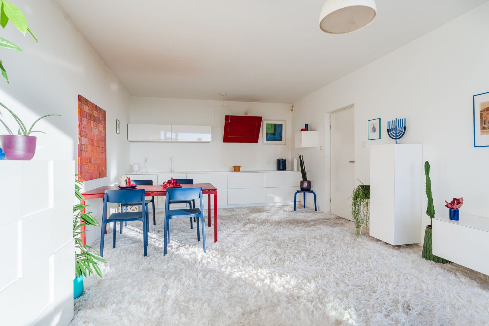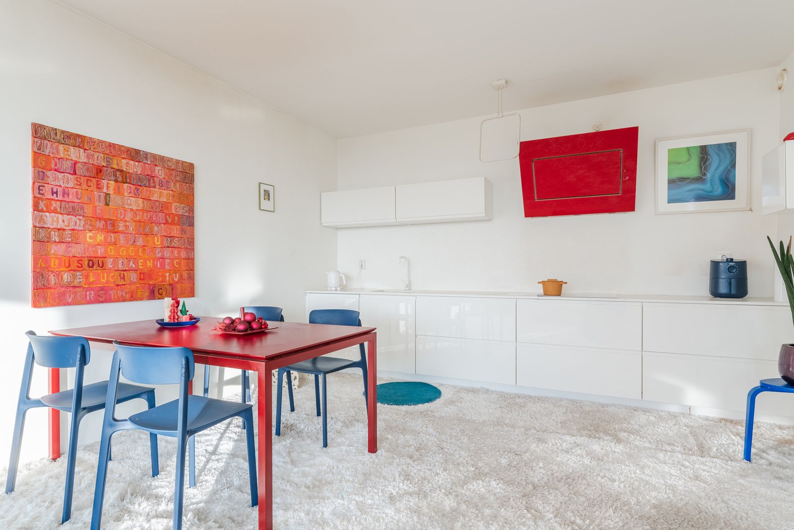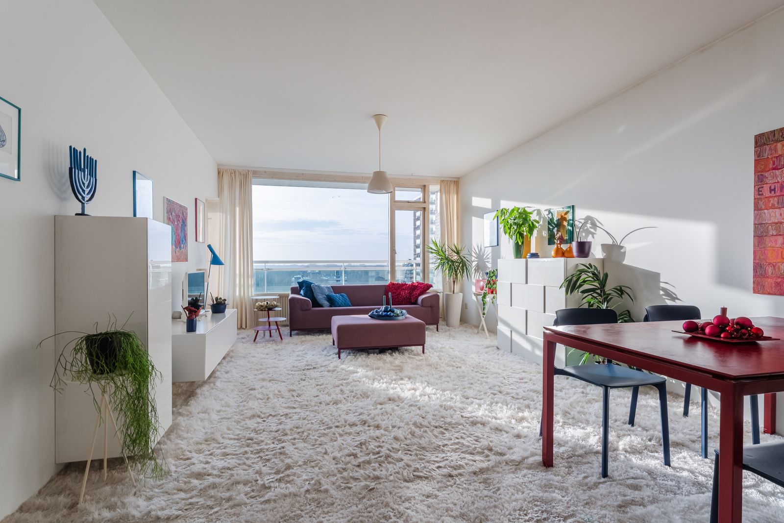 De lichte woonkamer heeft een open keuken, een deur naar het balkon en een wow-uitzicht. Als de zon schijnt zie je in de verte een reep zee glinsteren.