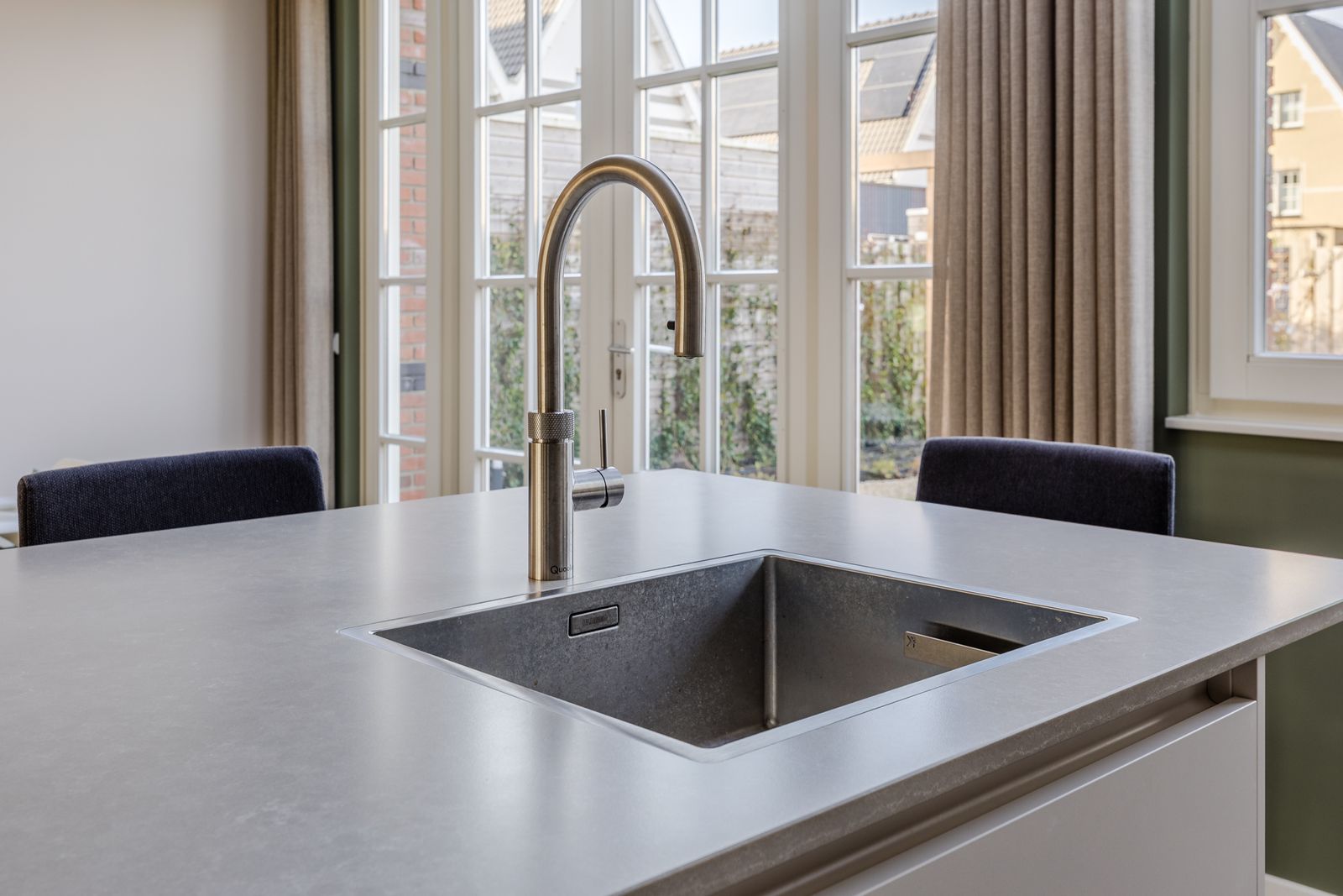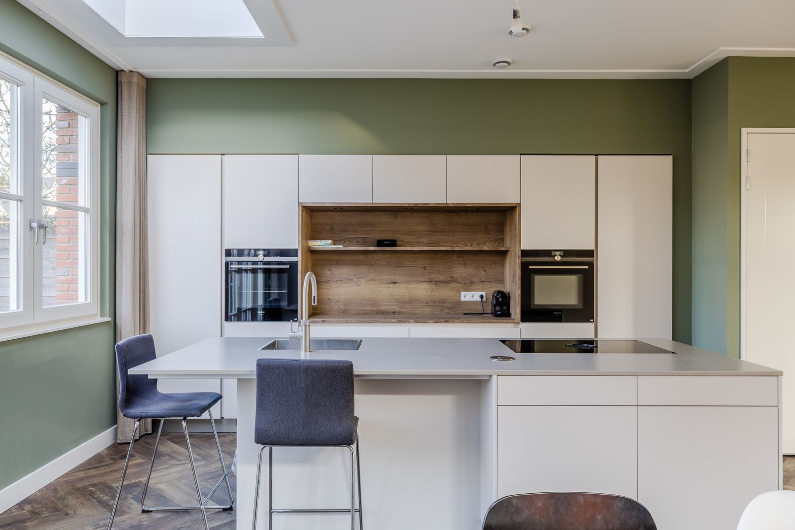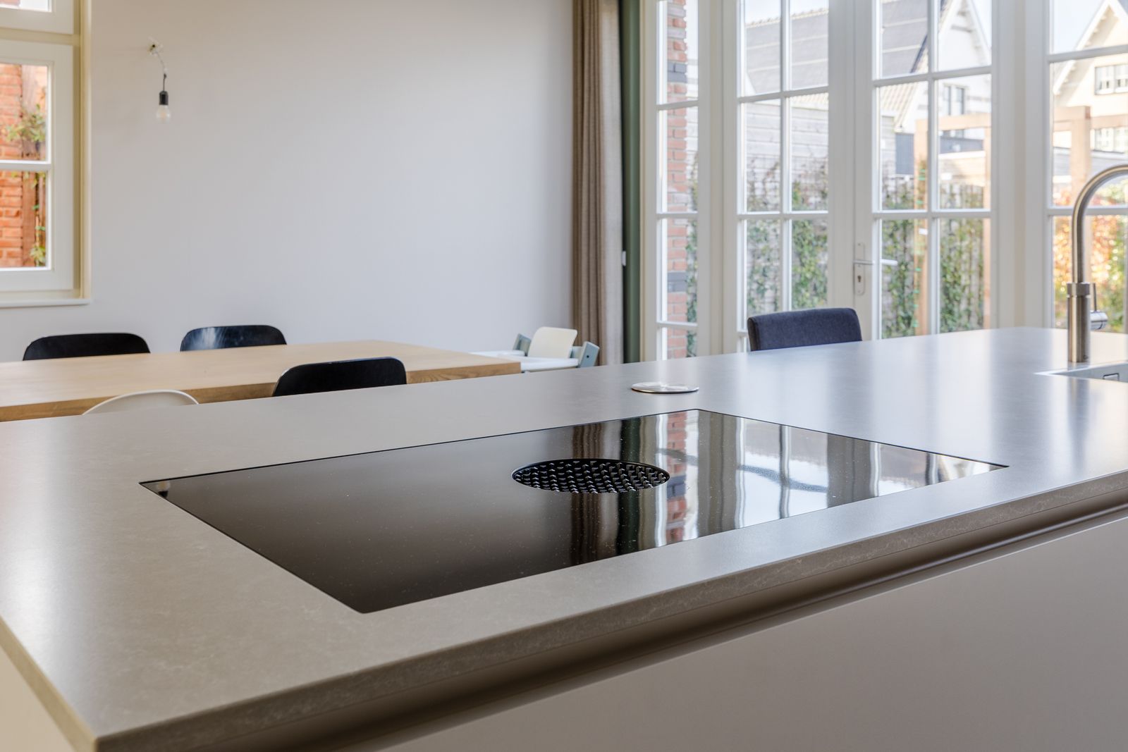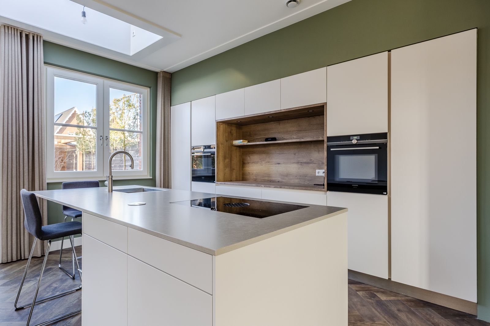 Begane grond: Voortuin, entree, hal met meterkast, modern toilet met fonteintje en trap naar boven. De open keuken met apart eiland bevindt zich aan de achterzijde en is voorzien van verschillende inbouwapparatuur waaronder een koel/vriescombinatie, een combi-oven, vaatwasser en inductiekookplaat met geïntegreerde afzuigkap en uiteraard Quooker. Er zijn openslaande deuren naar de tuin. Aan de voorzijde van het huis vind je de woonkamer met meerdere ramen die uitkijken op het park.
