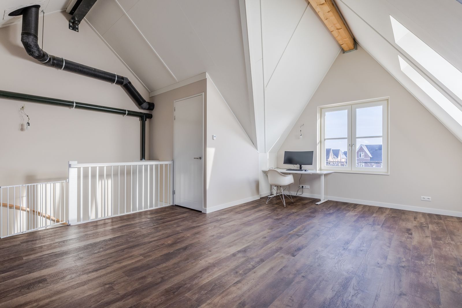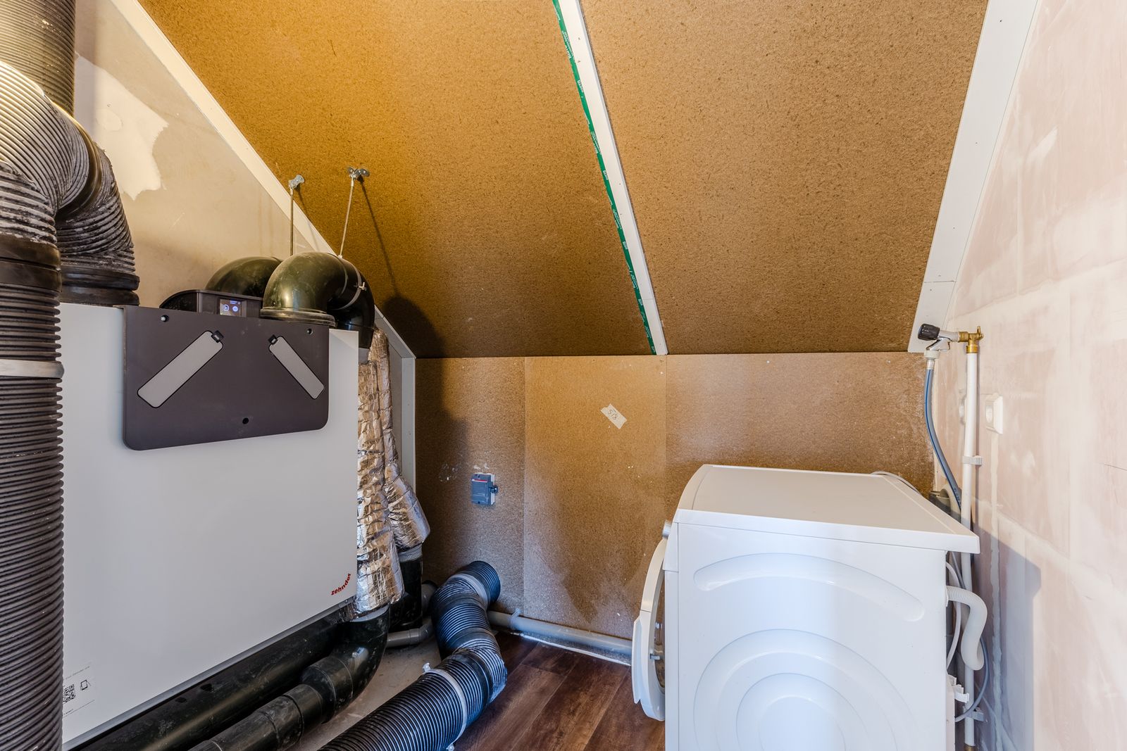 Tweede verdieping: Een technische ruimte waarin zich de WTW, omvormer van de zonnepanelen en de aansluiting voor wasmachine en droger. De rest is een open ruimte maar wel in zijn geheel afgewerkt. Dit maakt het een heerlijke grote open ruimte met de optie tot verschillende functionaliteiten.