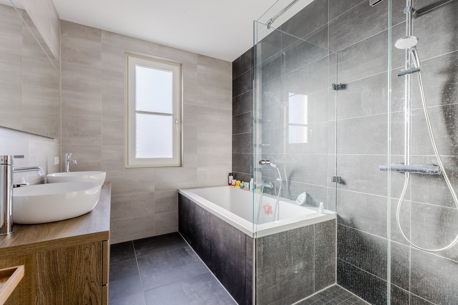 Eerste verdieping: Overloop met drie in grootte variërende slaapkamers. De grote raampartijen zorgen voor veel licht. De moderne badkamer is voorzien van een inloopdouche, een wastafelmeubel en vloerverwarming. Er is een separaat toilet.