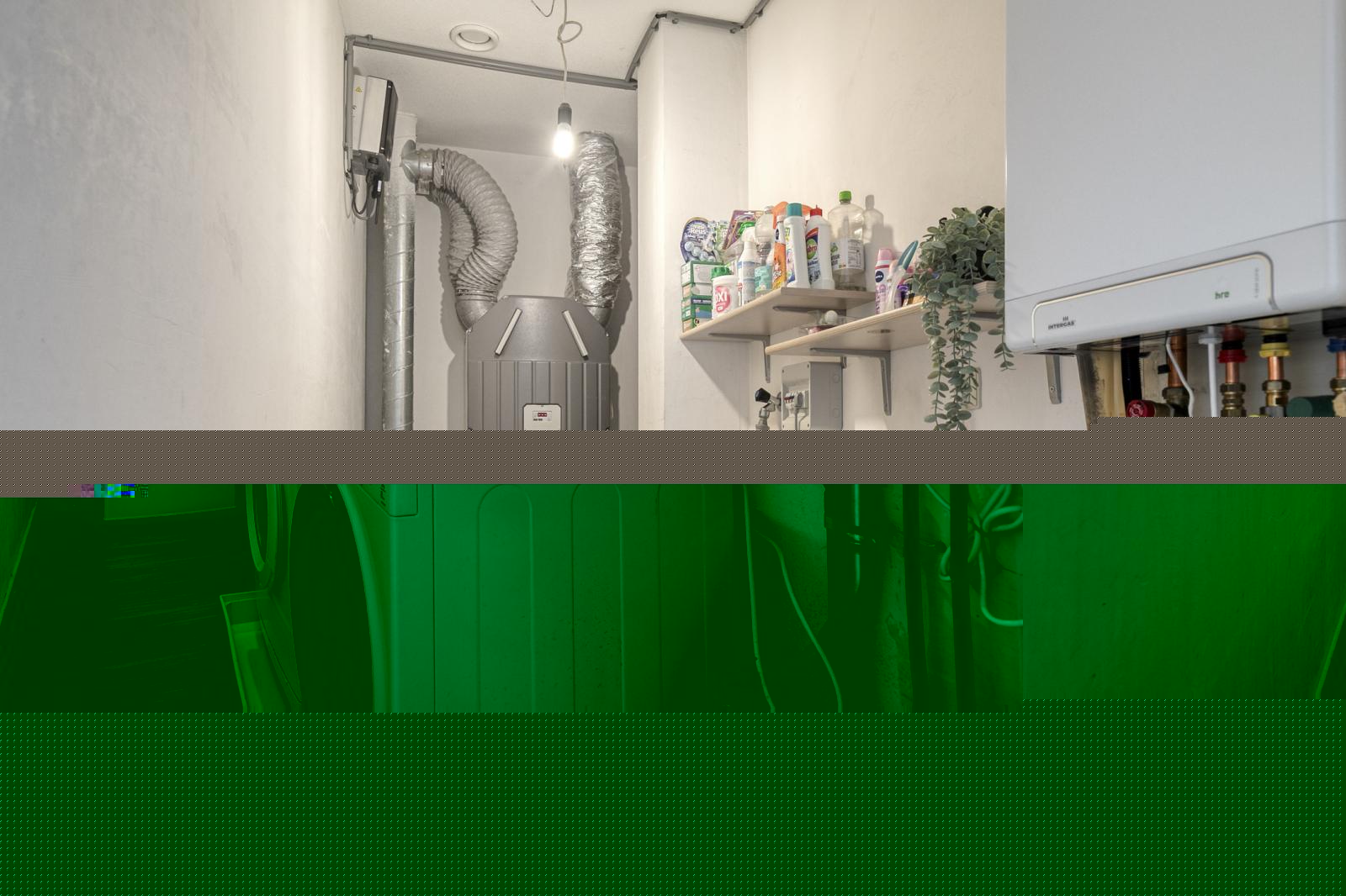 Overloop, grote berging met de opstelling voor de wasmachine-/ droger, CV combiketel en de WTW-installatie.
