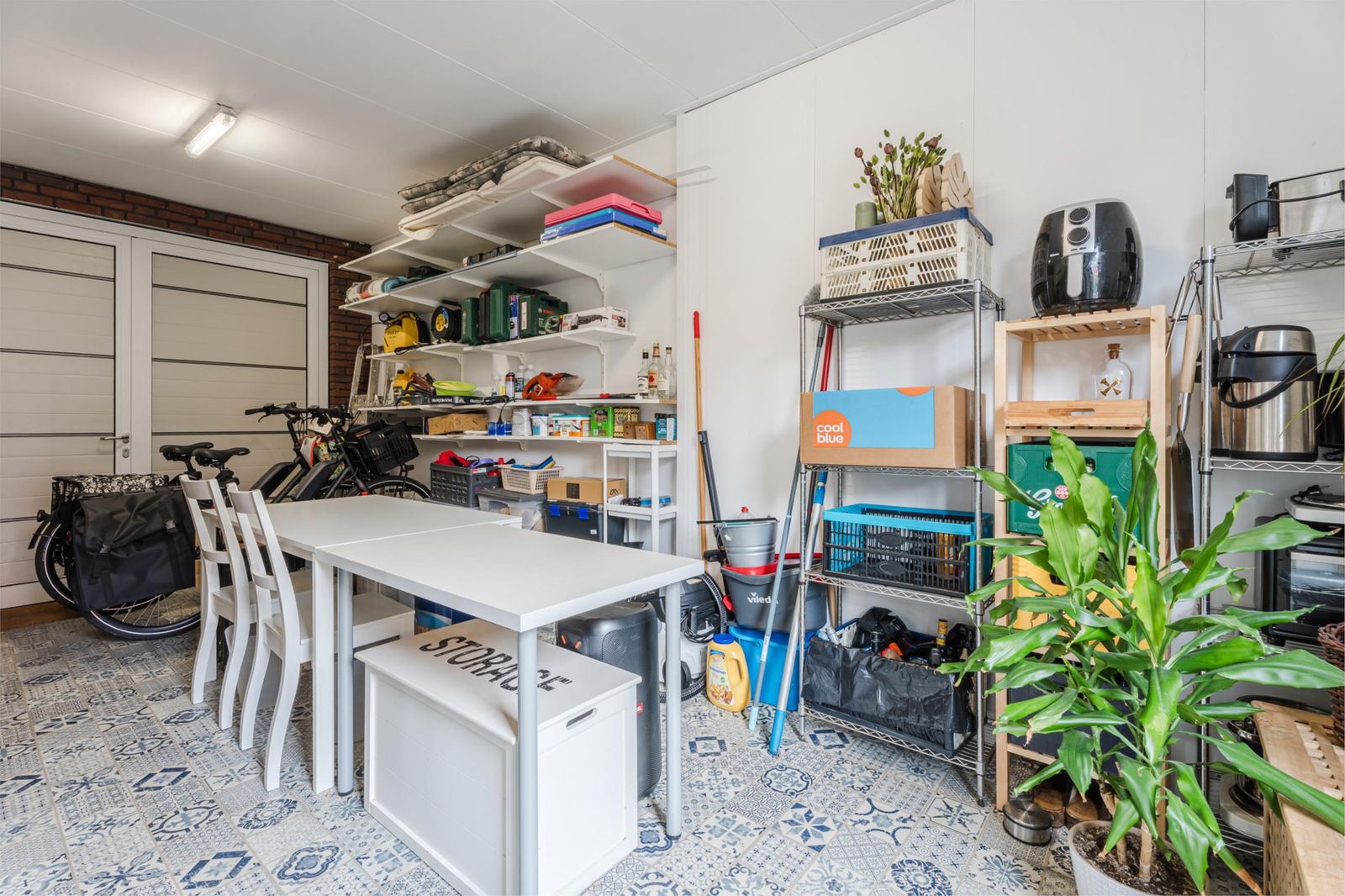 De inpandig bereikbare garage heeft dubbele geïsoleerde deuren, een betonnen vloer, verlichting en elektra. Ideaal als berging, bijkeuken of klusruimte.