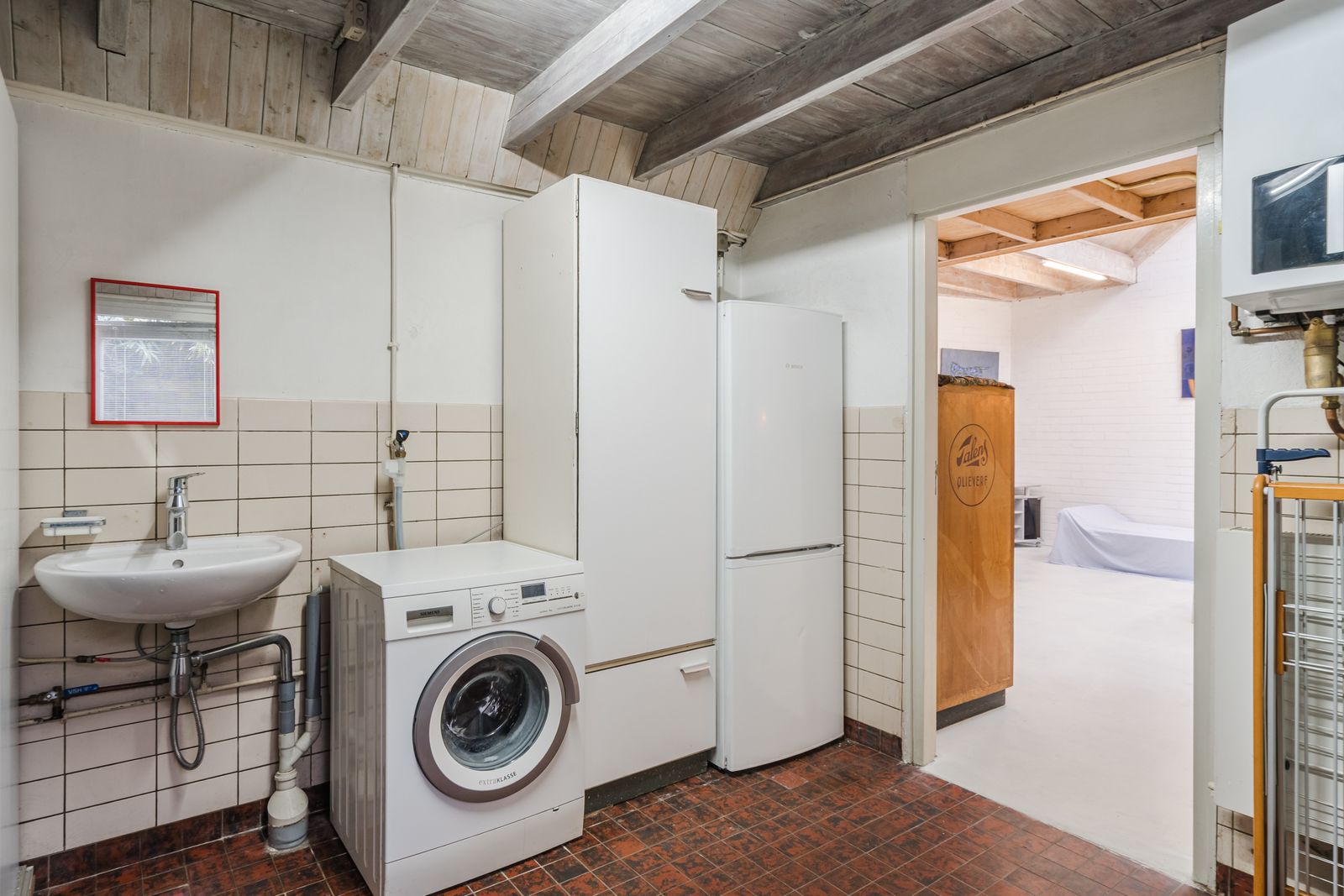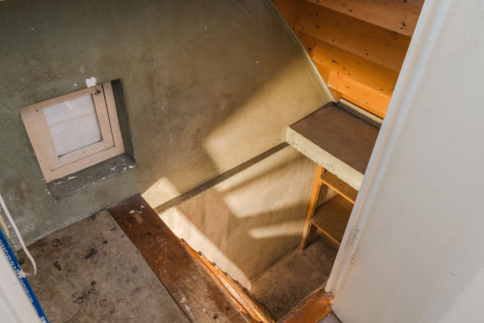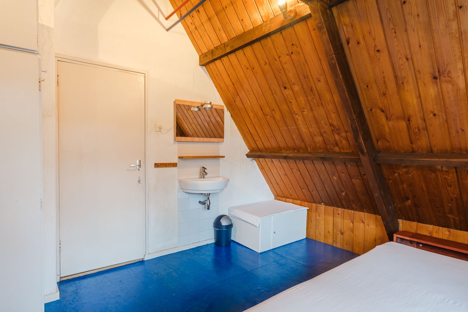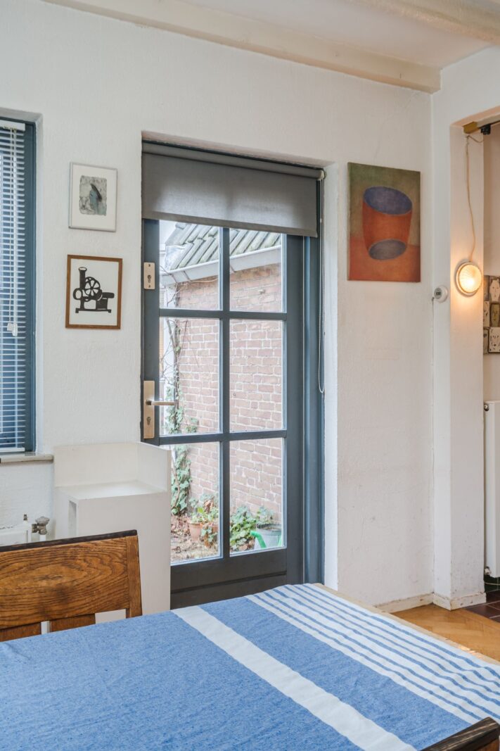Indeling: de woning bestaat uit vier kamers. Beneden is een gang met toegang tot een toilet, trappenhuis en toegang tot een kleine kelder (circa 1.40 hoog en 3m2 oppervlak). Via 1 deur is er toegang tot de woonkamer en via de andere deur toegang tot de open keuken. De aangebouwde bijkeuken dient tevens als natte ruimte voor een wasmachine, droger of vaatwasmachine. Tevens is hier een magnetron, opbergruimte en een wastafel met afneembare handdouche. Via een afsluitbare deur is er toegang tot het aangebouwde atelier dat tevens te gebruiken zou zijn als levensbestendige slaapkamer of wooneenheid met water, licht en dubbel glas.