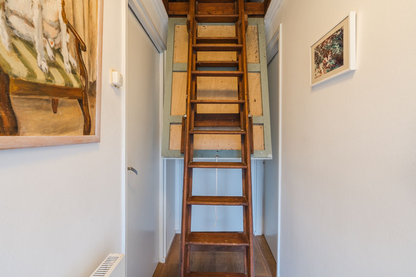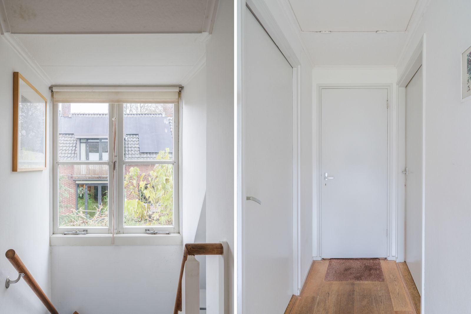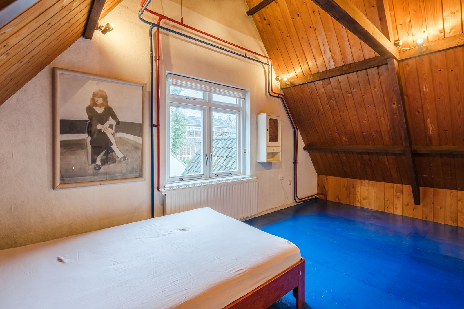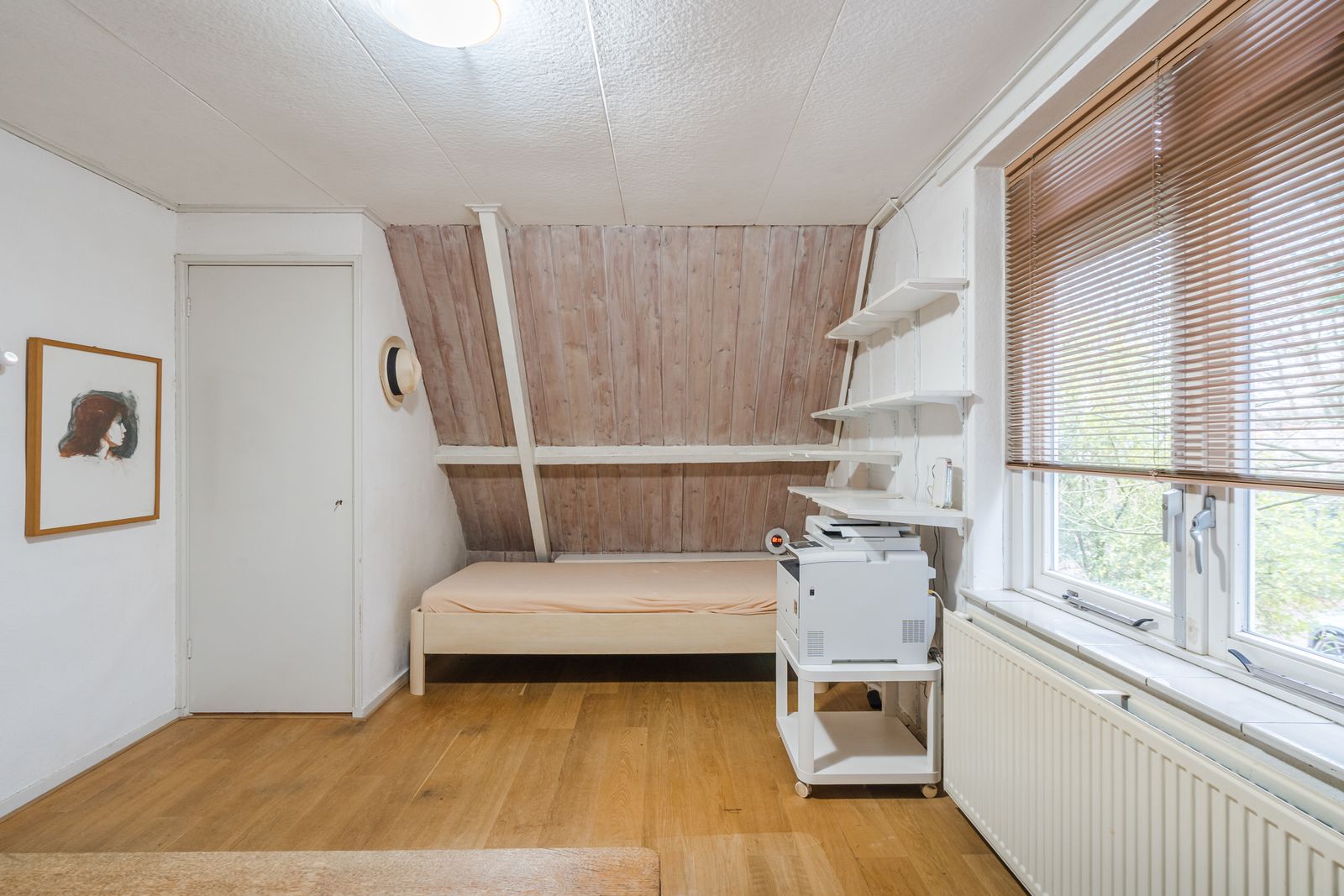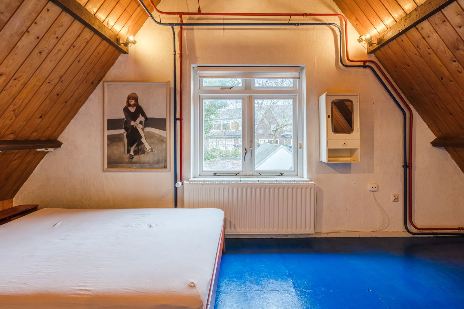 Op de eerste etage van de hoofdwoning bevinden zich een grote en wat kleinere slaapkamer. Boven de kleinere slaapkamer die geschikt is als logeerkamer of werkkamer, bevindt zich een vliering op de tweede etage die toegankelijk is via een luik in de gang met uitklapbare trap. Daarnaast is er een badkamer met douche en toilet op de eerste etage.
