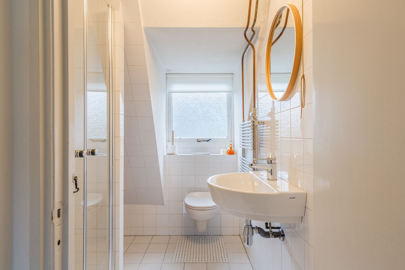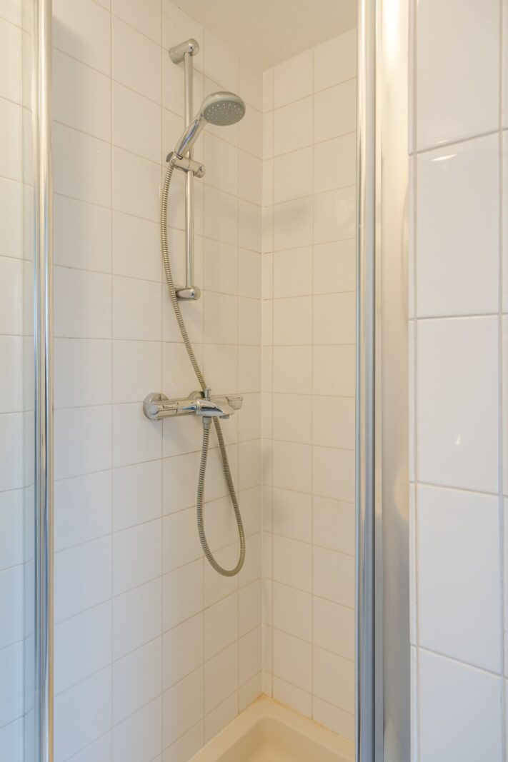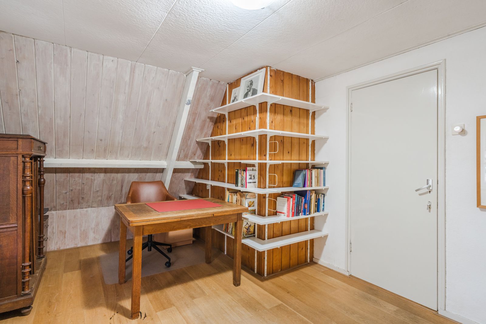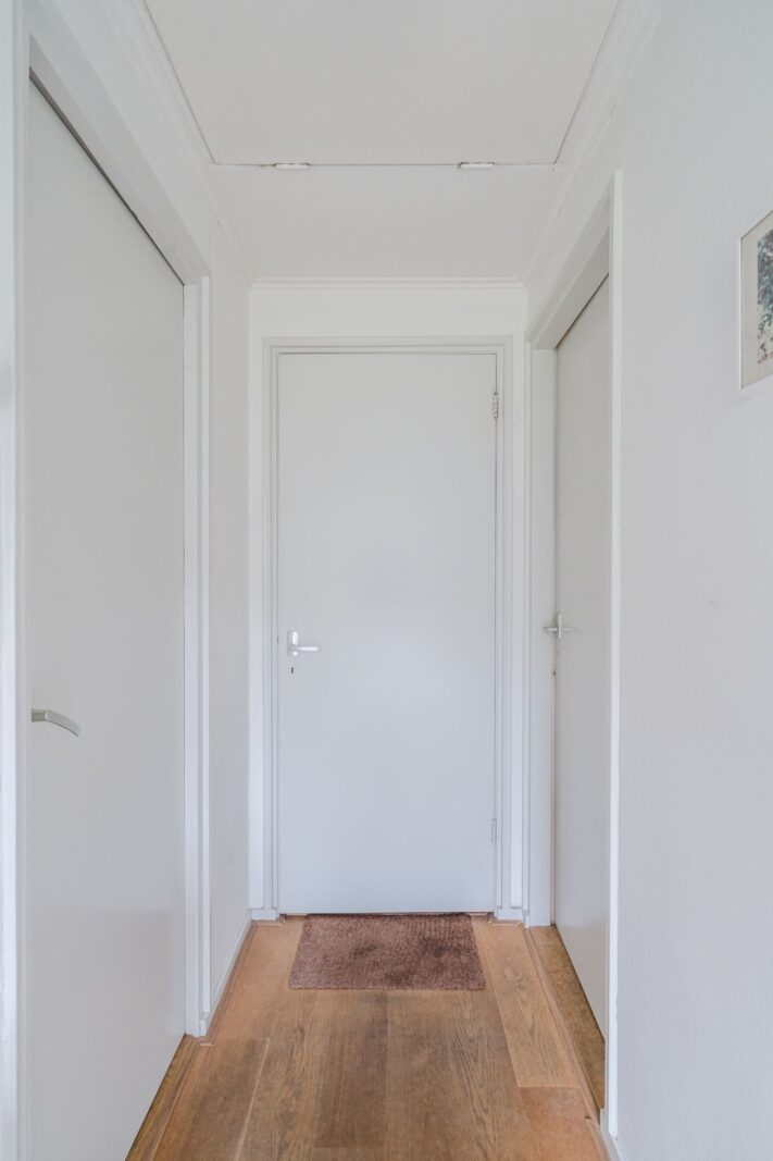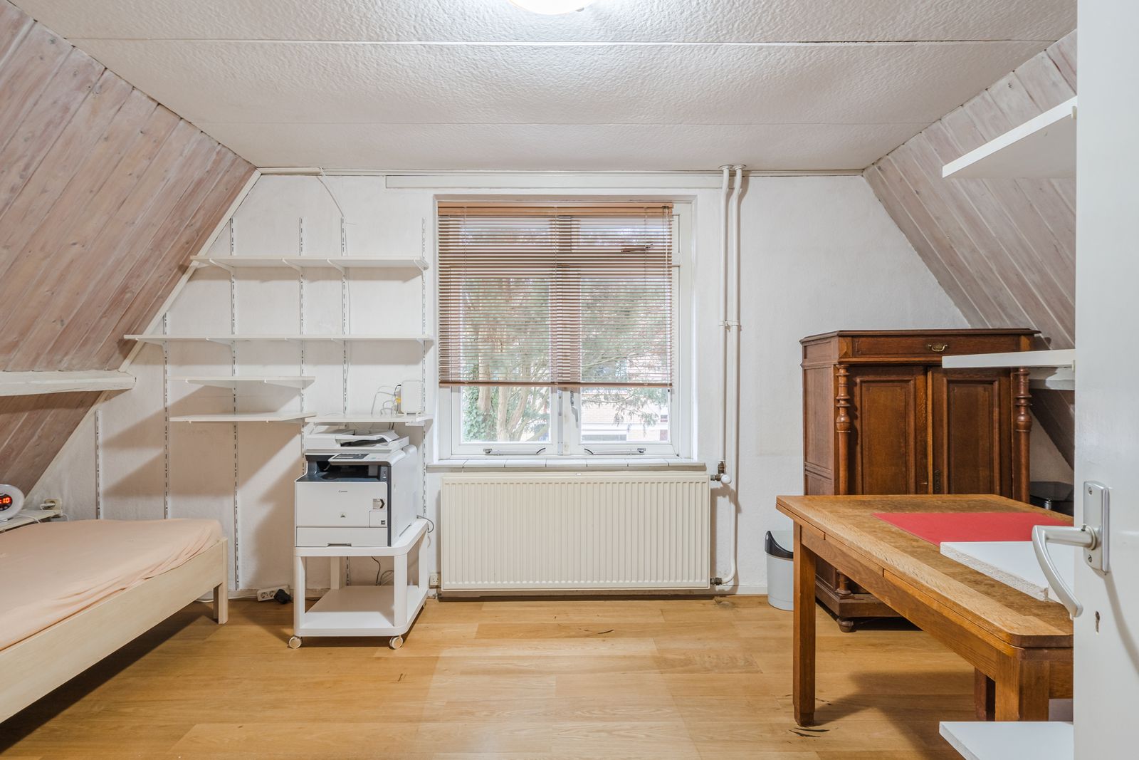 Op de eerste etage van de hoofdwoning bevinden zich een grote en wat kleinere slaapkamer. Boven de kleinere slaapkamer die geschikt is als logeerkamer of werkkamer, bevindt zich een vliering op de tweede etage die toegankelijk is via een luik in de gang met uitklapbare trap. Daarnaast is er een badkamer met douche en toilet op de eerste etage.