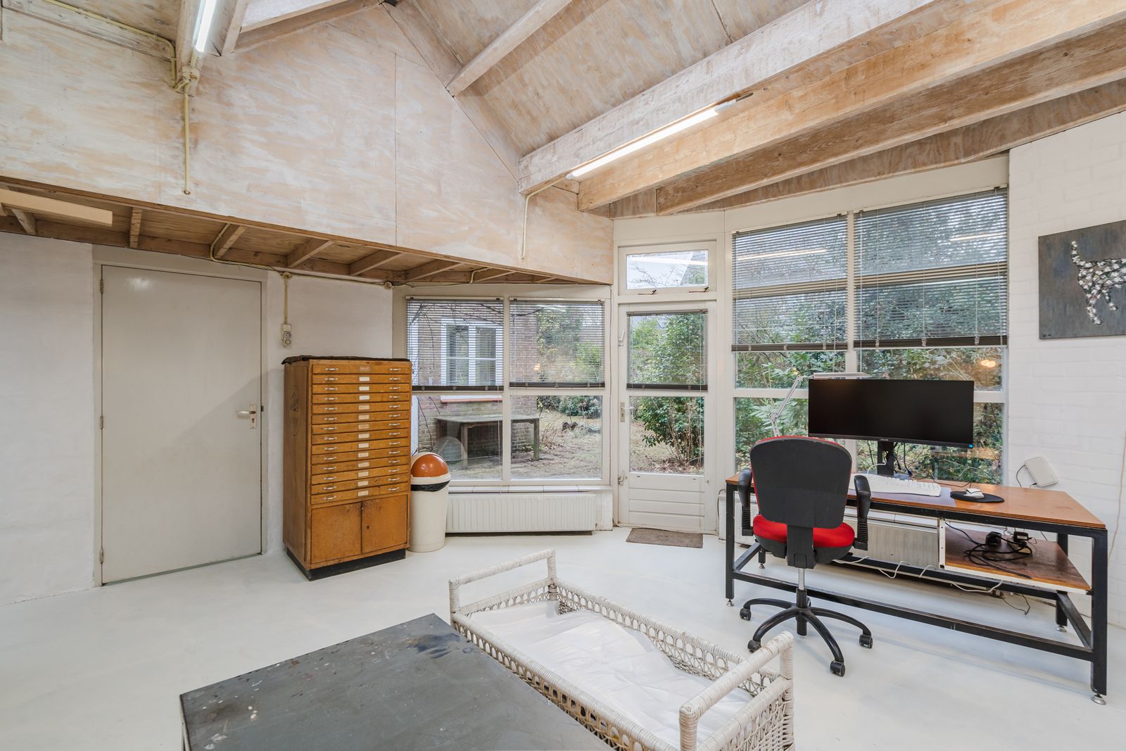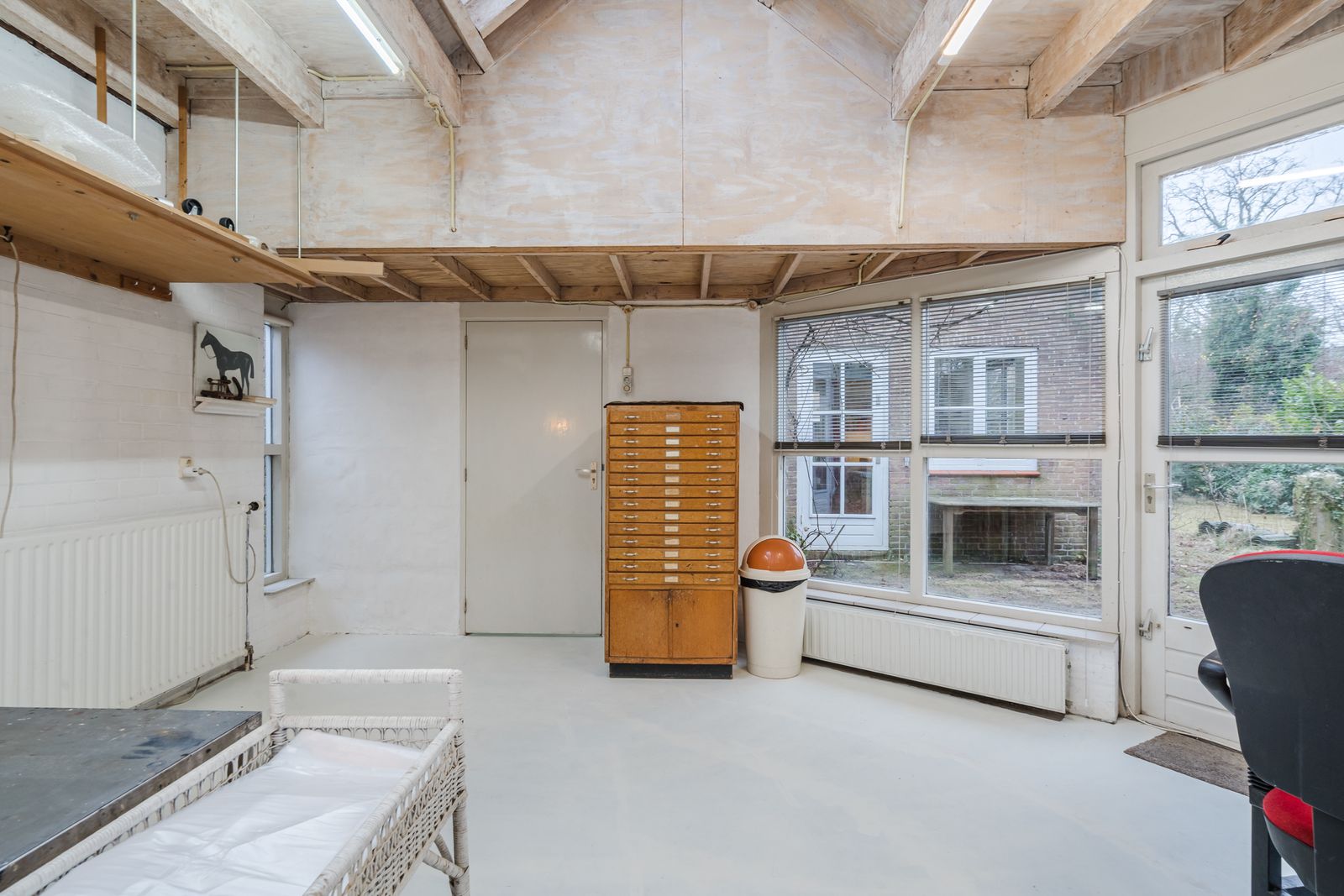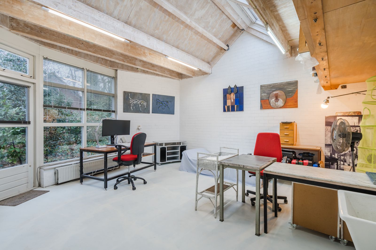 Achter de hoofdwoning is rond 1995 een aan de woning gebouwd atelier geplaatst (ca. 30 m2) met een schitterend uitzicht op de tuin. Het atelier is verwarmd en van water en licht voorzien en beschikt over dubbele beglazing. Het atelier is toegankelijk via de bijkeuken van de hoofdwoning en heeft een eigen deur naar de tuin. Naast een geweldig uitzicht op de tuin beschikt deze ruimte over een rij tuimel-dakramen die een heel bijzonder lichteffect geven vanuit het Noorden.