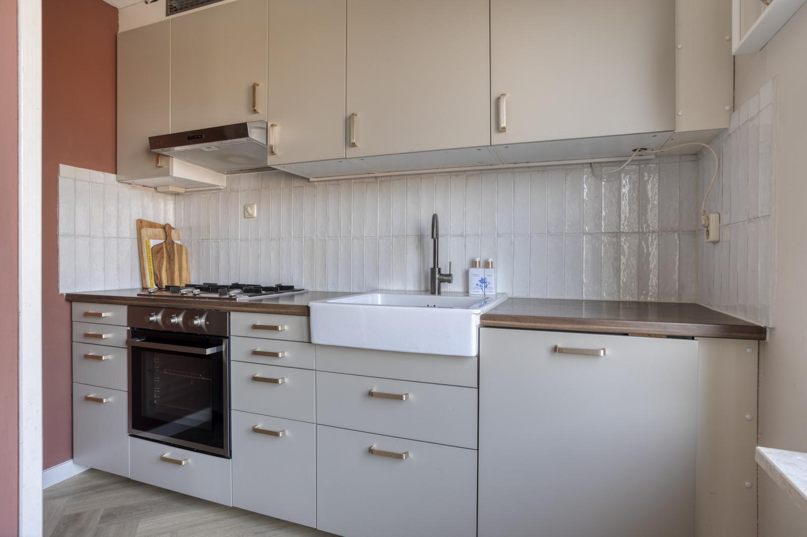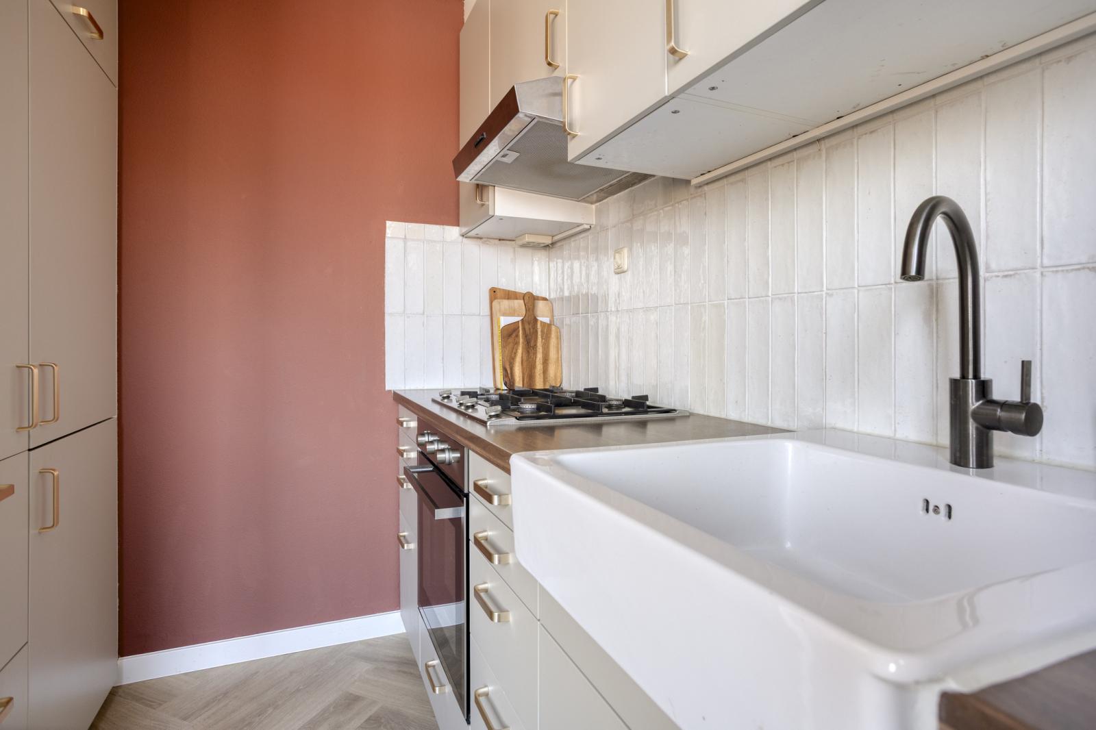 Indeling: entree met lichte hal, vanuit de hal bereik je de de slaapkamer aan de voorzijde van het appartement, deze slaapkamer is ca. 10,7 m² groot. Vanuit de hal kan je naar het toilet en de woonkamer. De ruime woonkamer en keuken zijn stijlvol ingericht en zijn gezamenlijk ca. 31 m². De keuken is van diverse inbouwapparatuur voorzien o.a. vaatwasser, koelkast, vriezer, gaskookplaat, oven en een afzuigkap. Het balkon is vanuit de woonkamer te bereiken. De 2e slaapkamer is ca. 12 m² groot en geeft toegang tot een prachtig gemoderniseerde badkamer welke is voorzien van een ligbad, inloopdouche en wastafel(meubel). De wasmachine aansluiting bevindt zich in de badkamer.