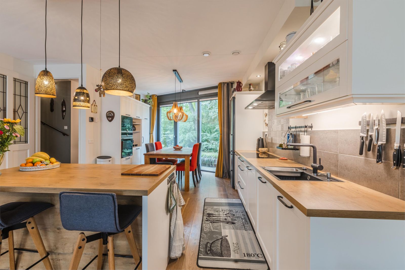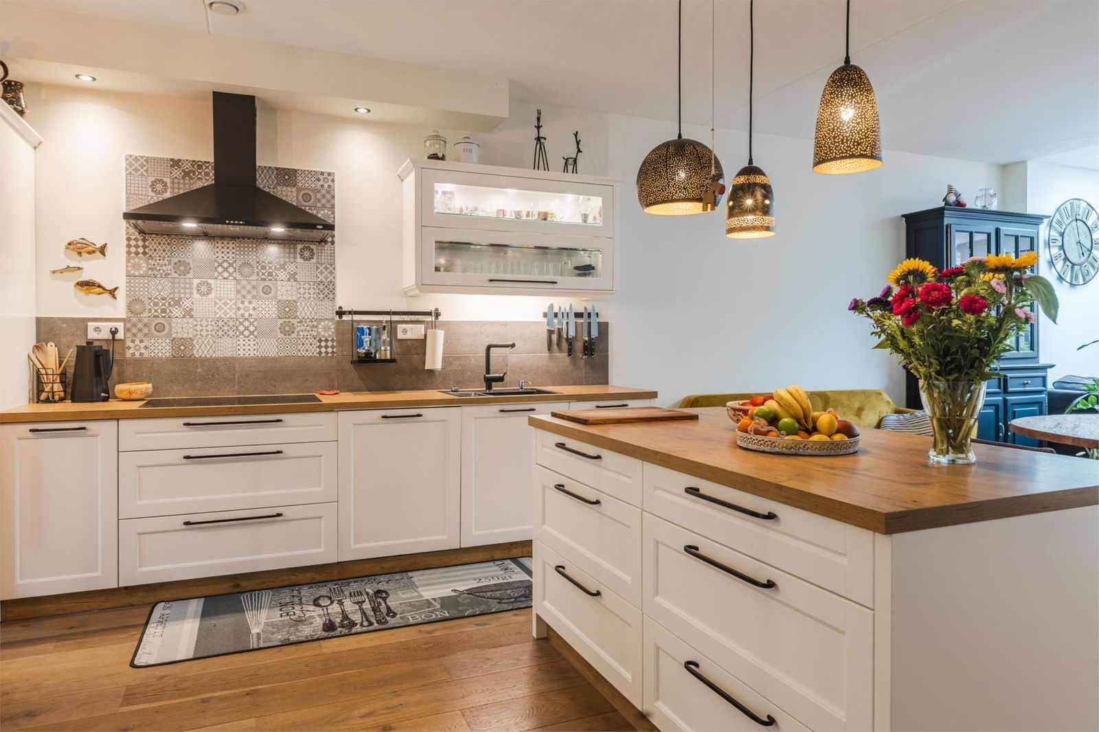 De nette keuken, voorzien van kwalitatieve apparatuur zoals een inductiekookplaat, oven, magnetron, vaatwasser, koel-/vriescombinatie en afzuigkap, biedt voldoende aanrecht en kastruimten en is van alle gemakken voorzien.