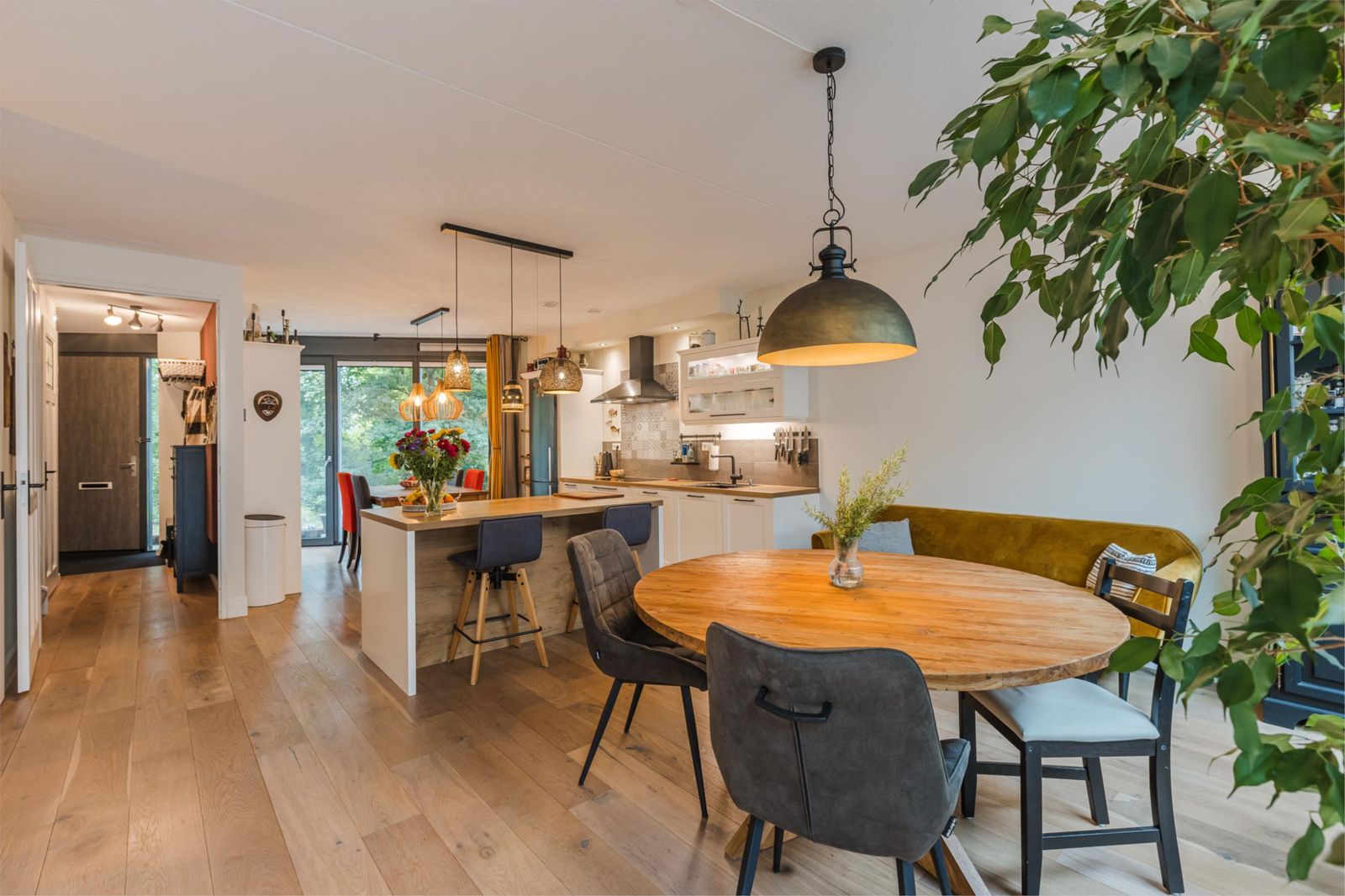 De ruime woon-/eetkamer met open keuken is voorzien van een prachtige houten vloer en meet 77 m². Dit biedt volop mogelijkheden voor het creëren van een comfortabele zithoek en een aparte eethoek. Met grote ramen aan beide zijden van de kamer en de 5 m brede lichtstraat in de woonkamer uitbouw kunt u dit gerust een woning met veel licht noemen. Met de schuifpui naar de ruime tuin haalt u buiten naar binnen.