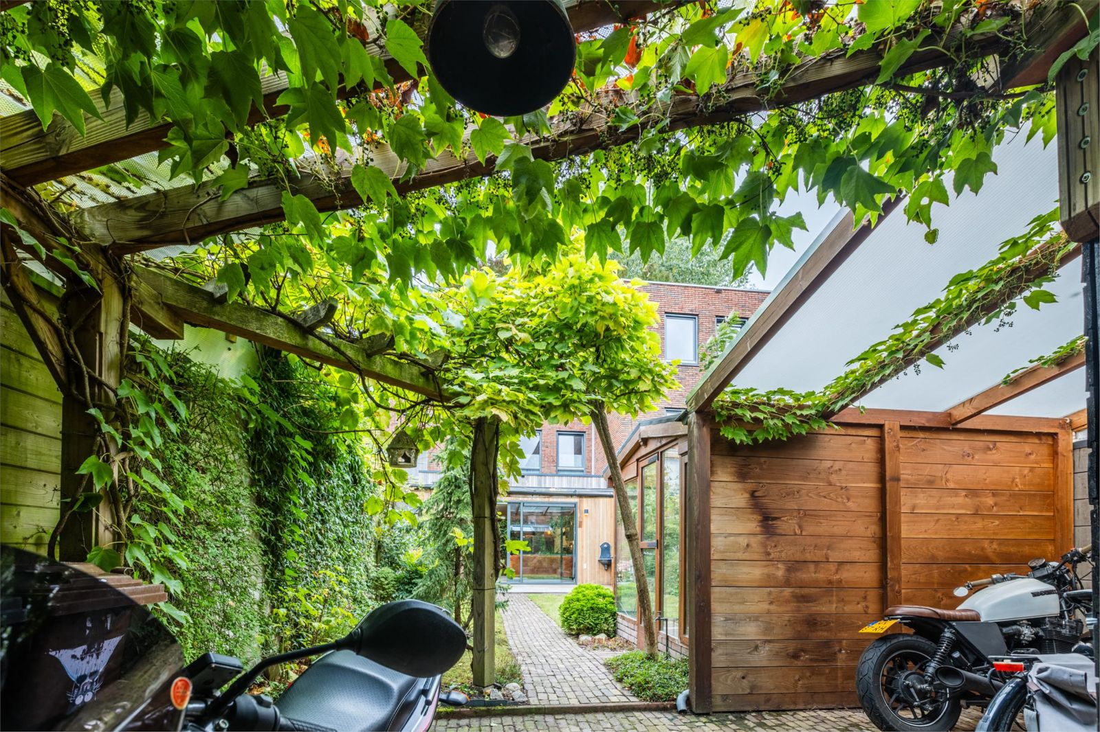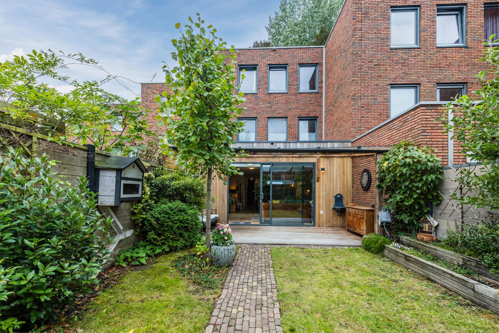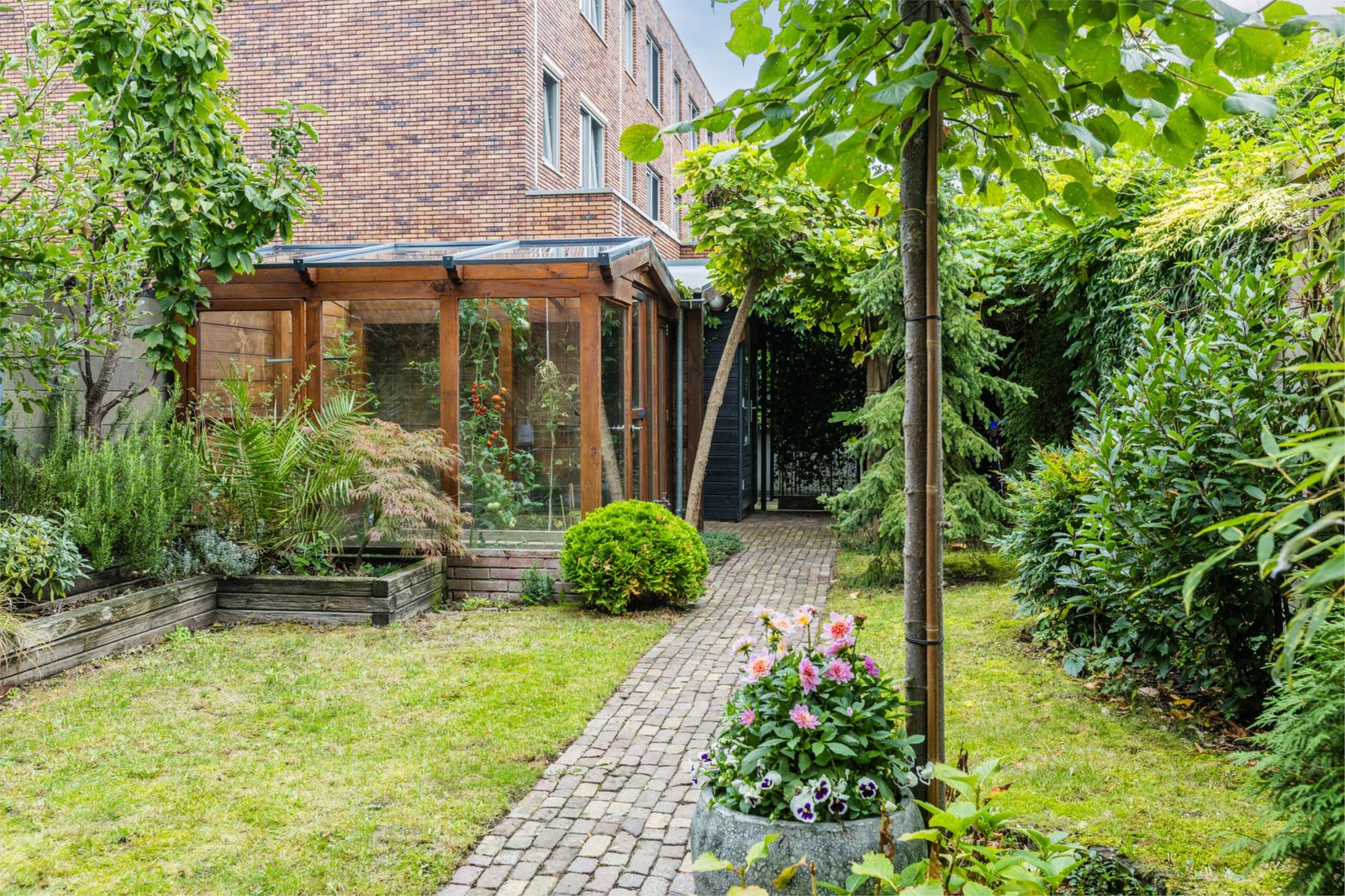De tuin is bijna 95 m² groot (16,4 m lang en 5,8 m breed) en beschikt over een hobbykas, houten schuur en een bedekte fietsenstalling, die bereikbaar is via de achterom.