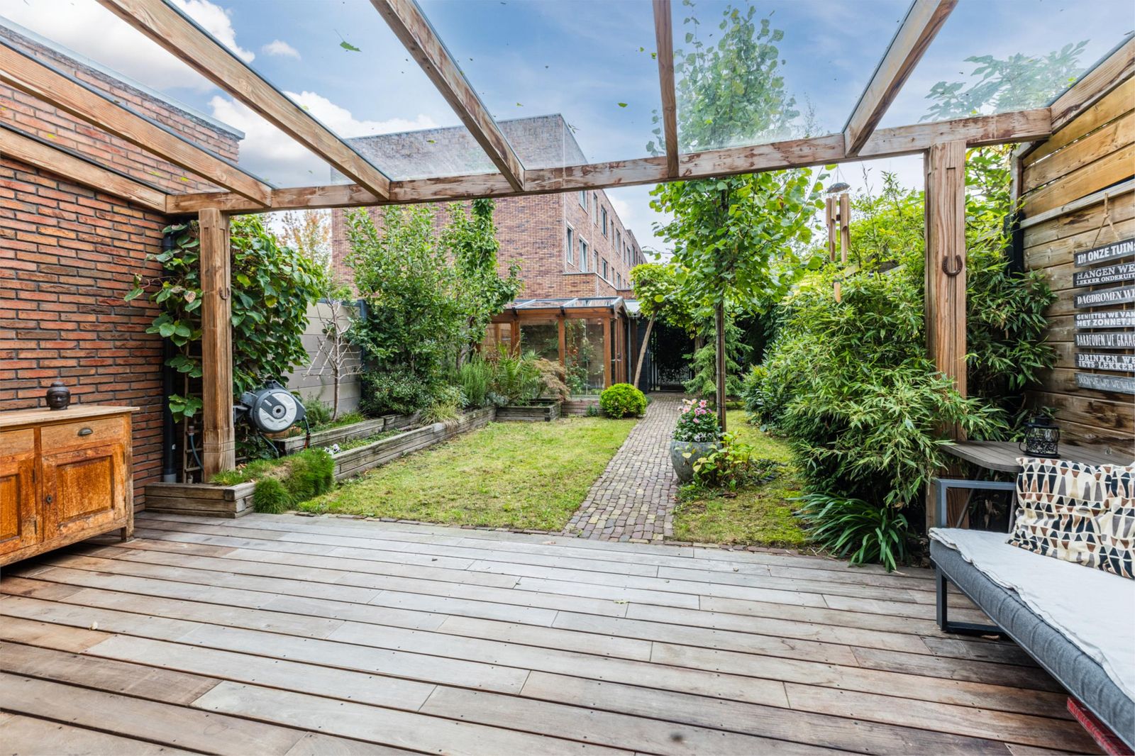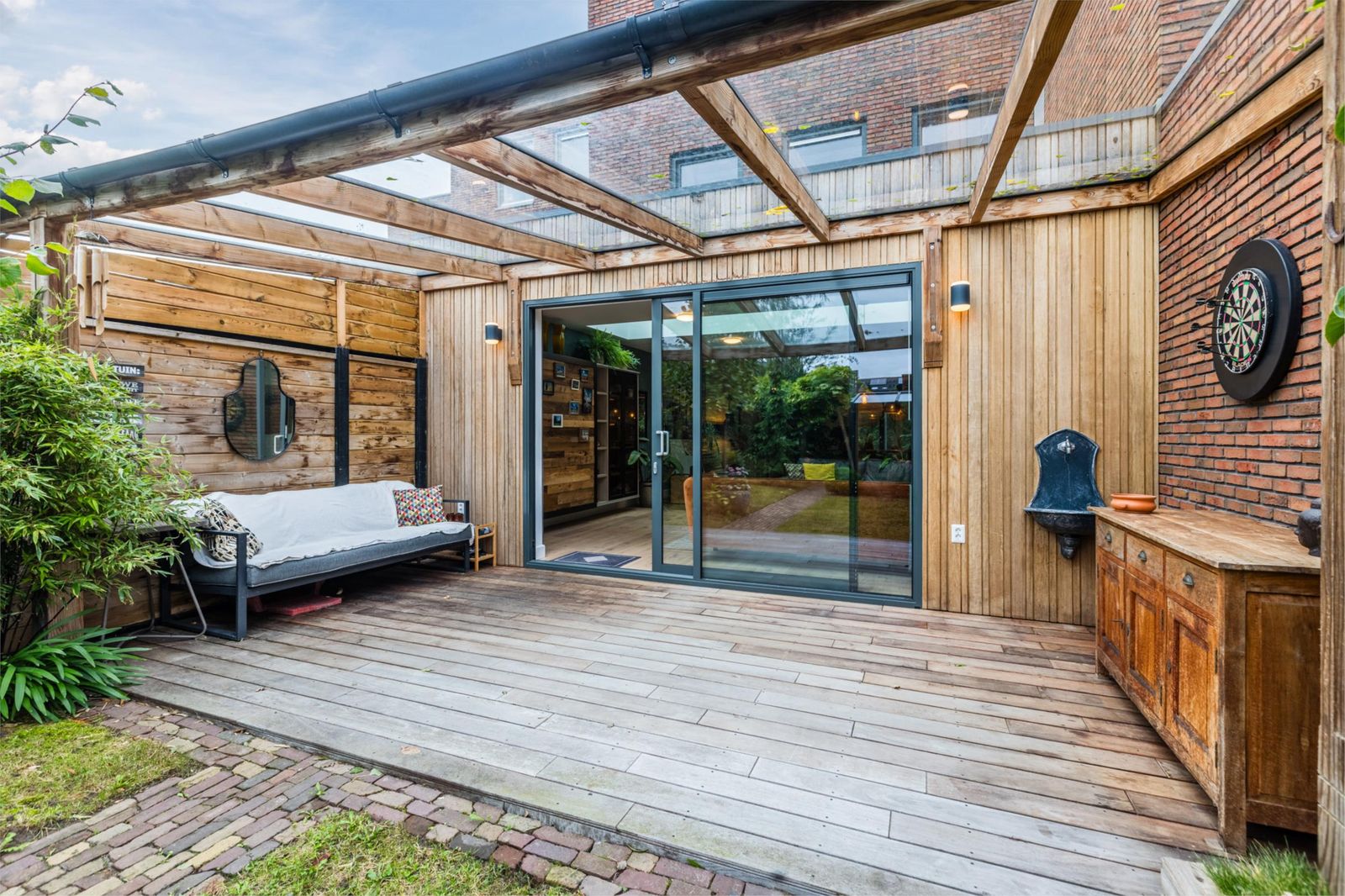 De heerlijke achtertuin op het oosten is voorzien van een terras met houten vloer en overkapping.