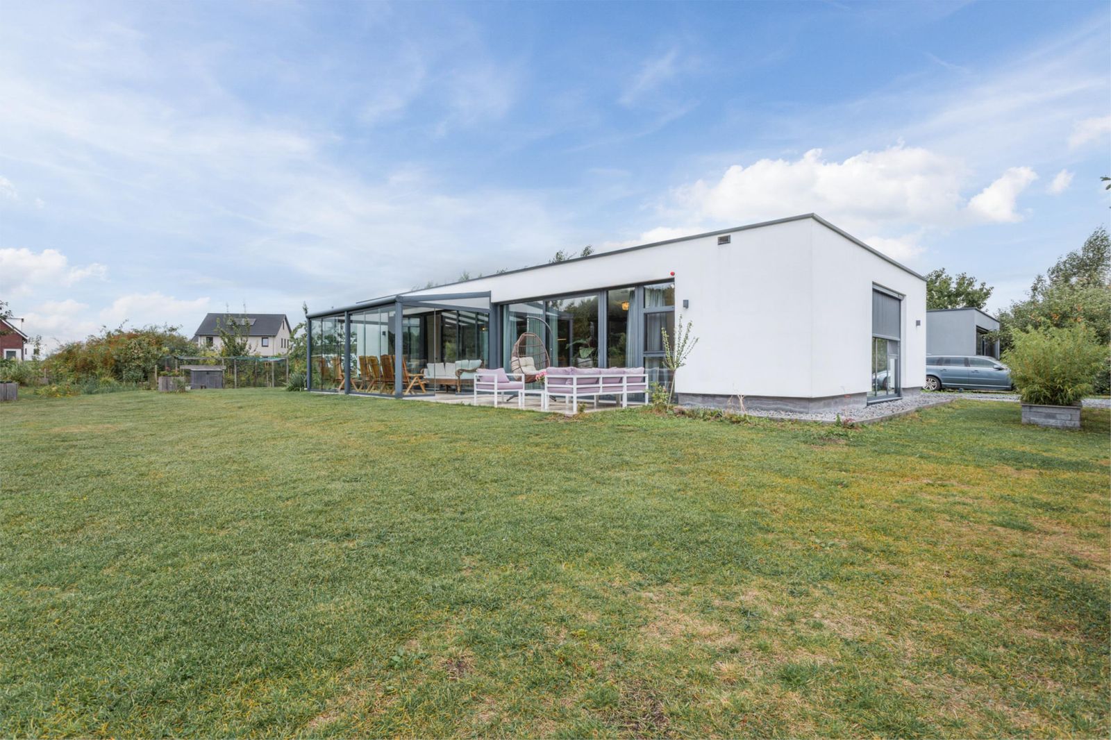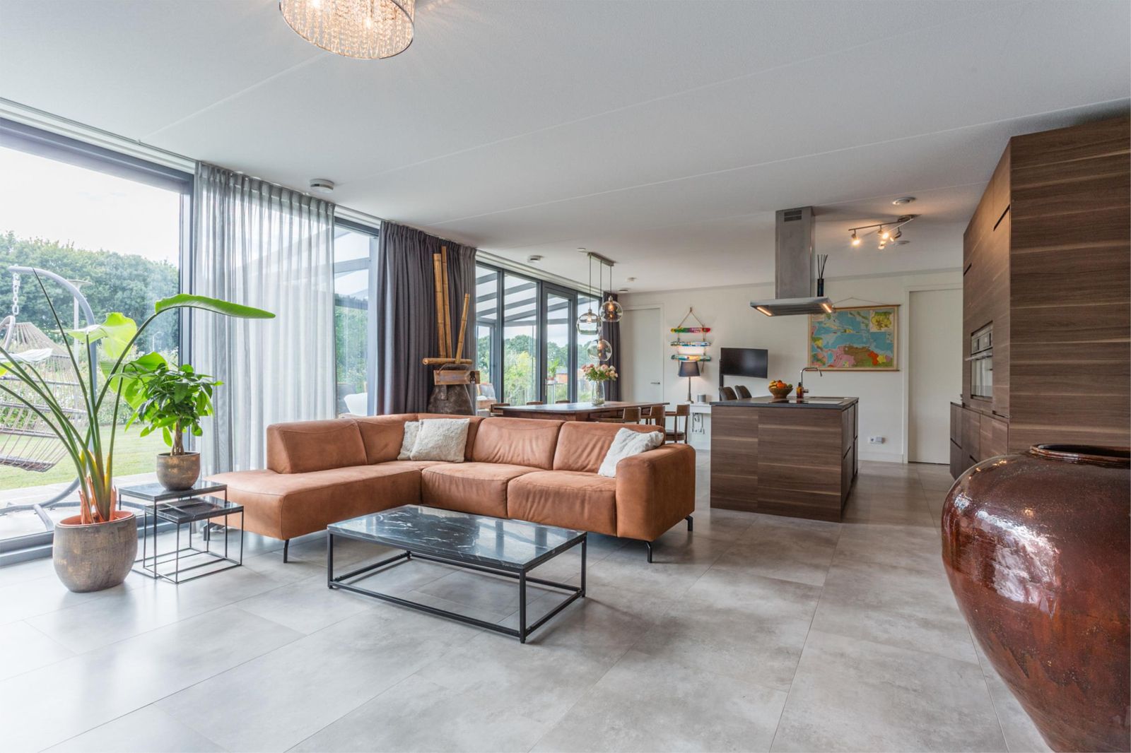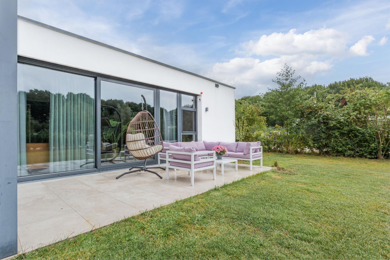 De woning is ontworpen rondom de zonnige, centraal gelegen woonkamer van circa 50 m², met veel glas, waardoor je geniet van een prachtig uitzicht over je eigen groene perceel. De ligging aan een straat zonder doorgaand verkeer garandeert optimale rust en privacy.