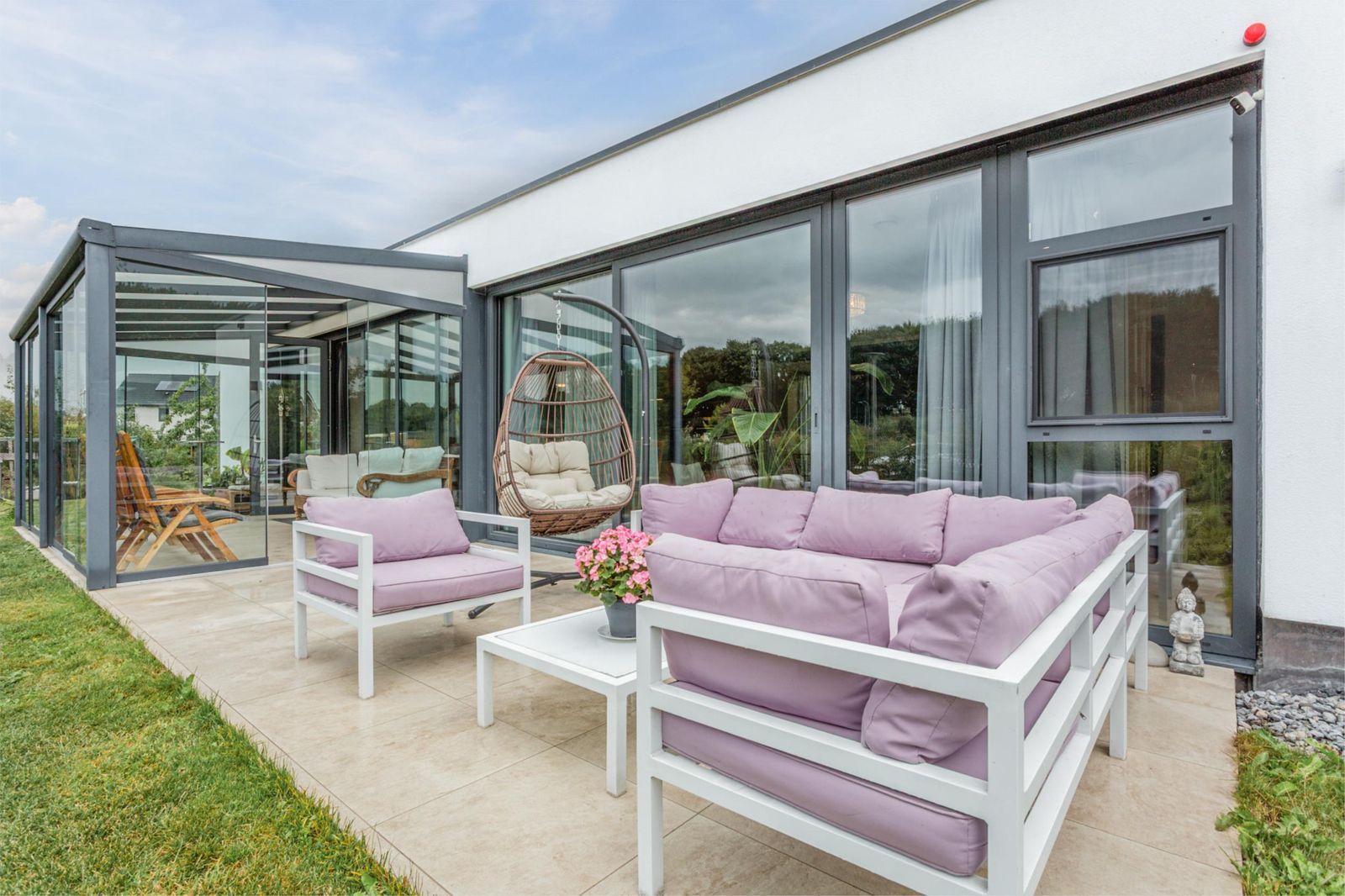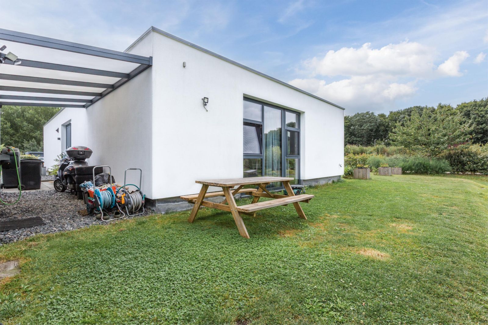 * De tuin beschikt over een breed, onderheid terras en een overkapping.