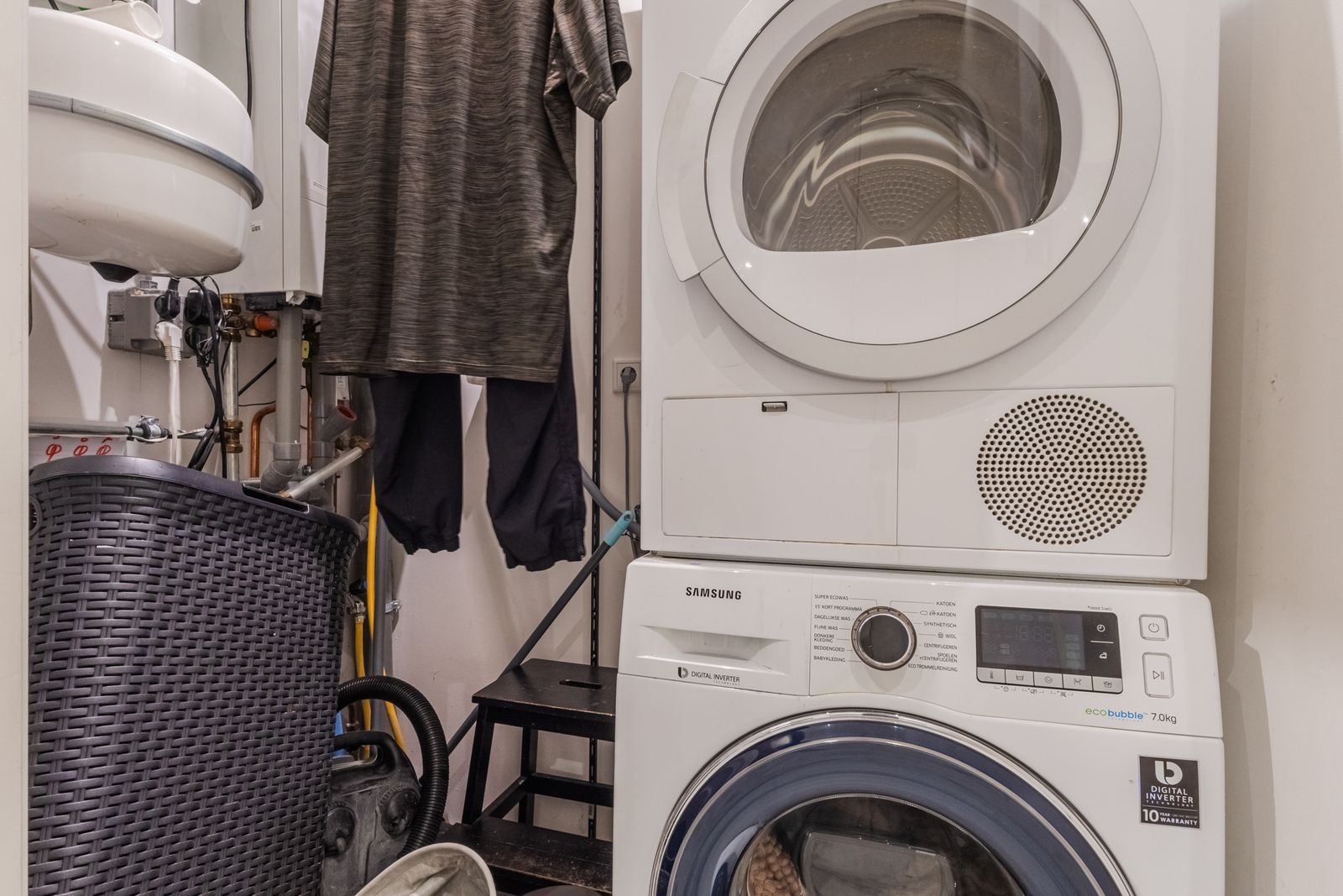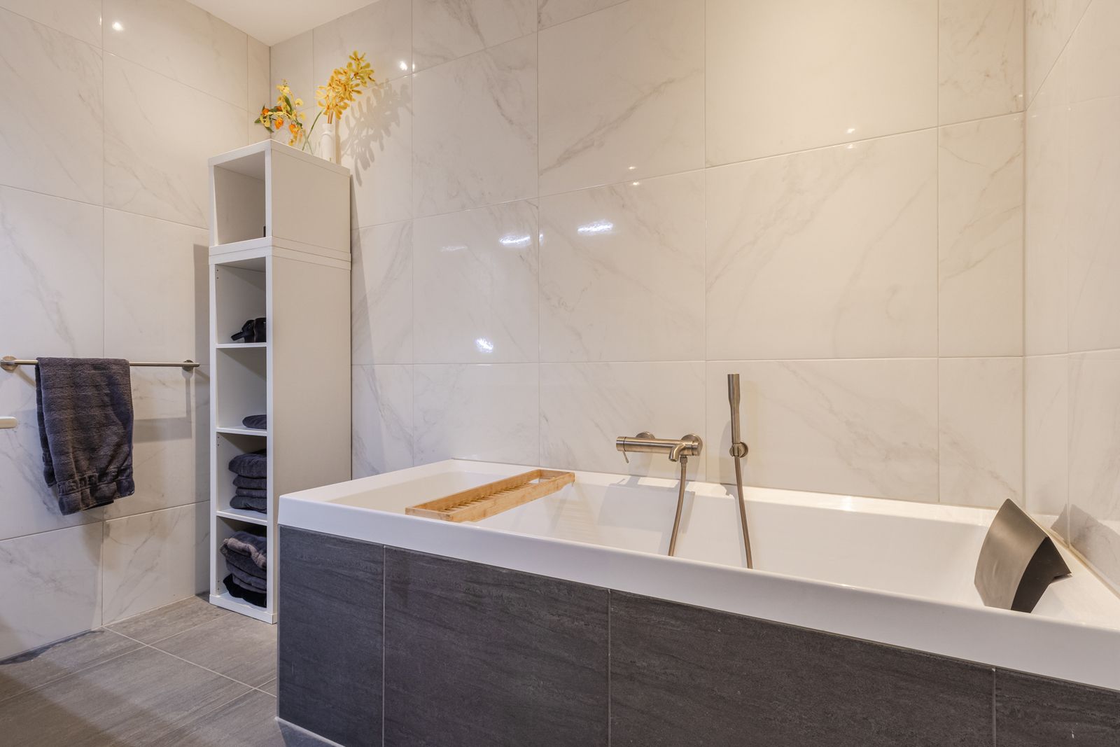 Achterin de woning bevinden zich twee ruime slaapkamers, waarvan één met garderobenis. De moderne badkamer is uitgerust met ligbad, inloopdouche en dubbele wastafel. Separate toiletruimte en aparte wasruimte met wasmachine/droger, cv-installatie, mechanische ventilatie en verdeler vloerverwarming.