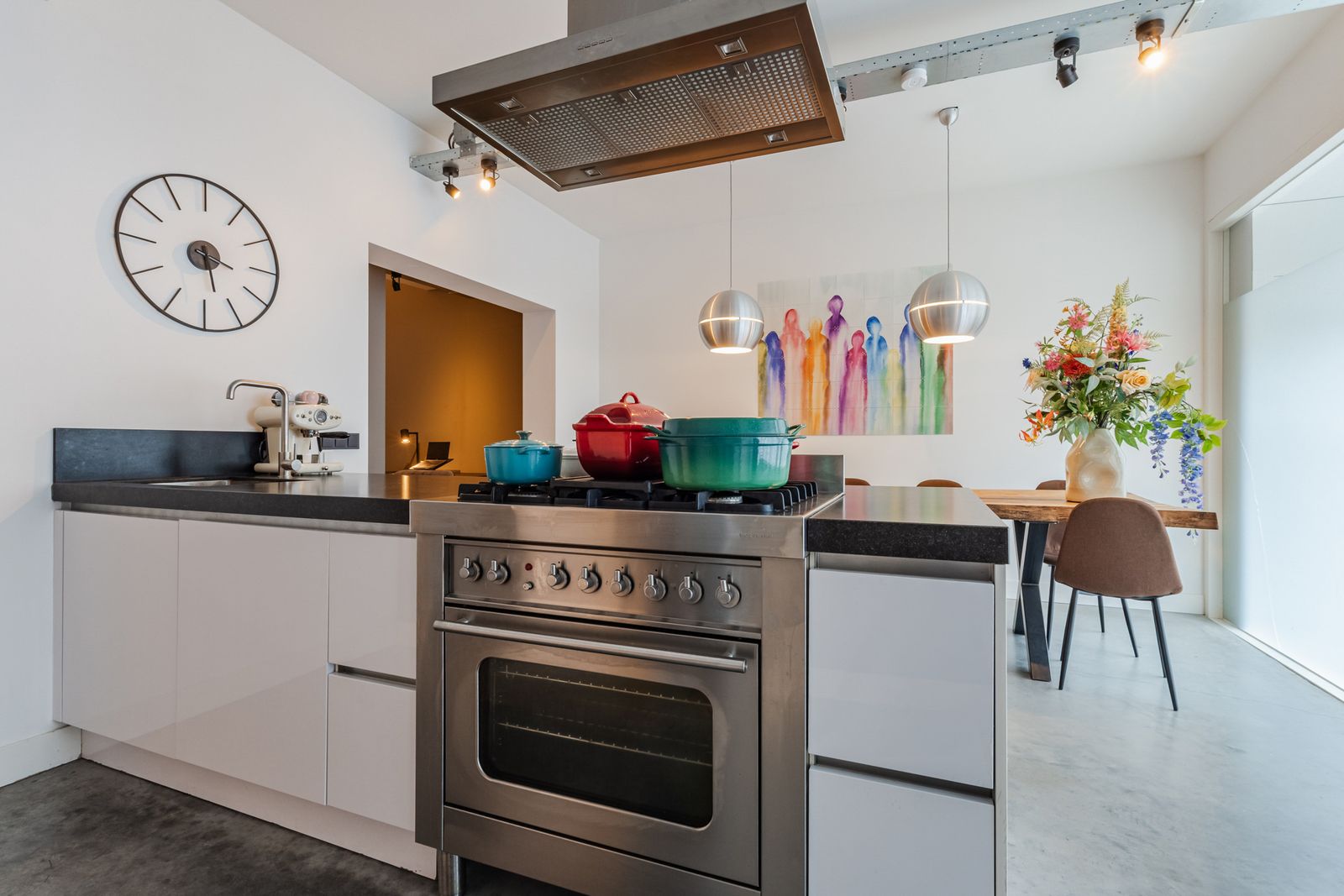 De open keuken met schiereiland is voorzien van 5-pits gasfornuis met bakplaat, oven, vaatwasser, afzuigschouw en koel-/vriescombinatie. De keuken en royaal opgezette woonkamer bieden volop ruimte voor diners en het ontvangen van gasten. De woonkamer heeft een praktische, deels afgeschermde werkhoek en extra bergruimte in provisiekast en vaste kast.