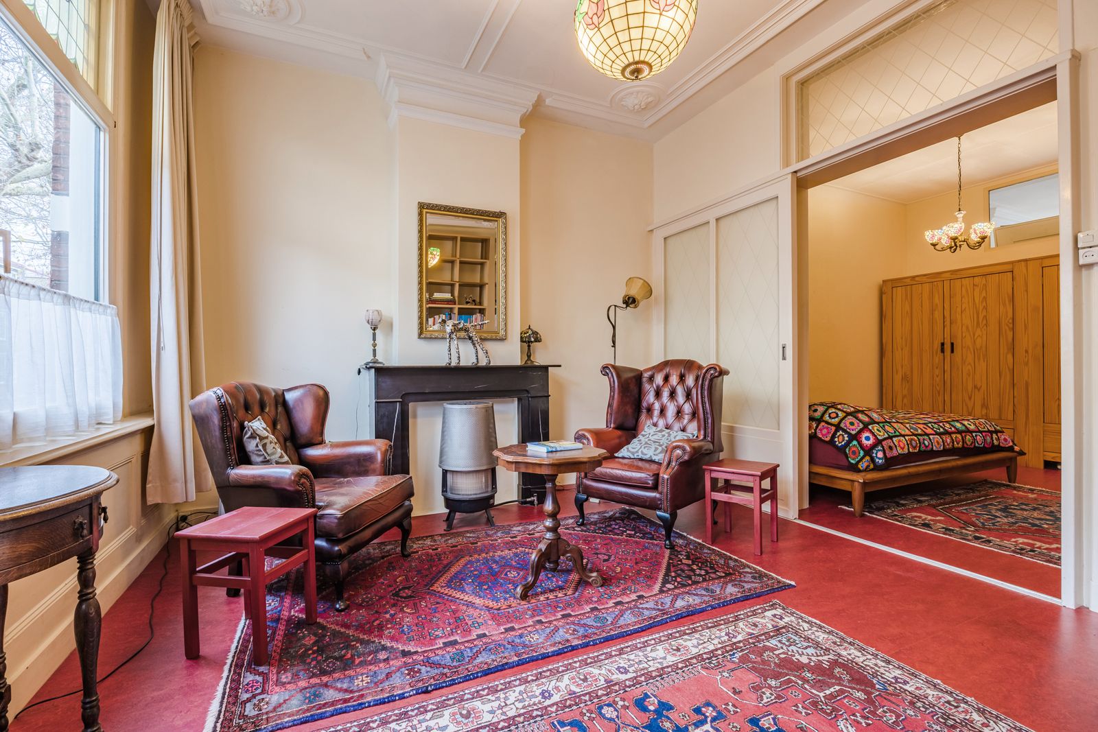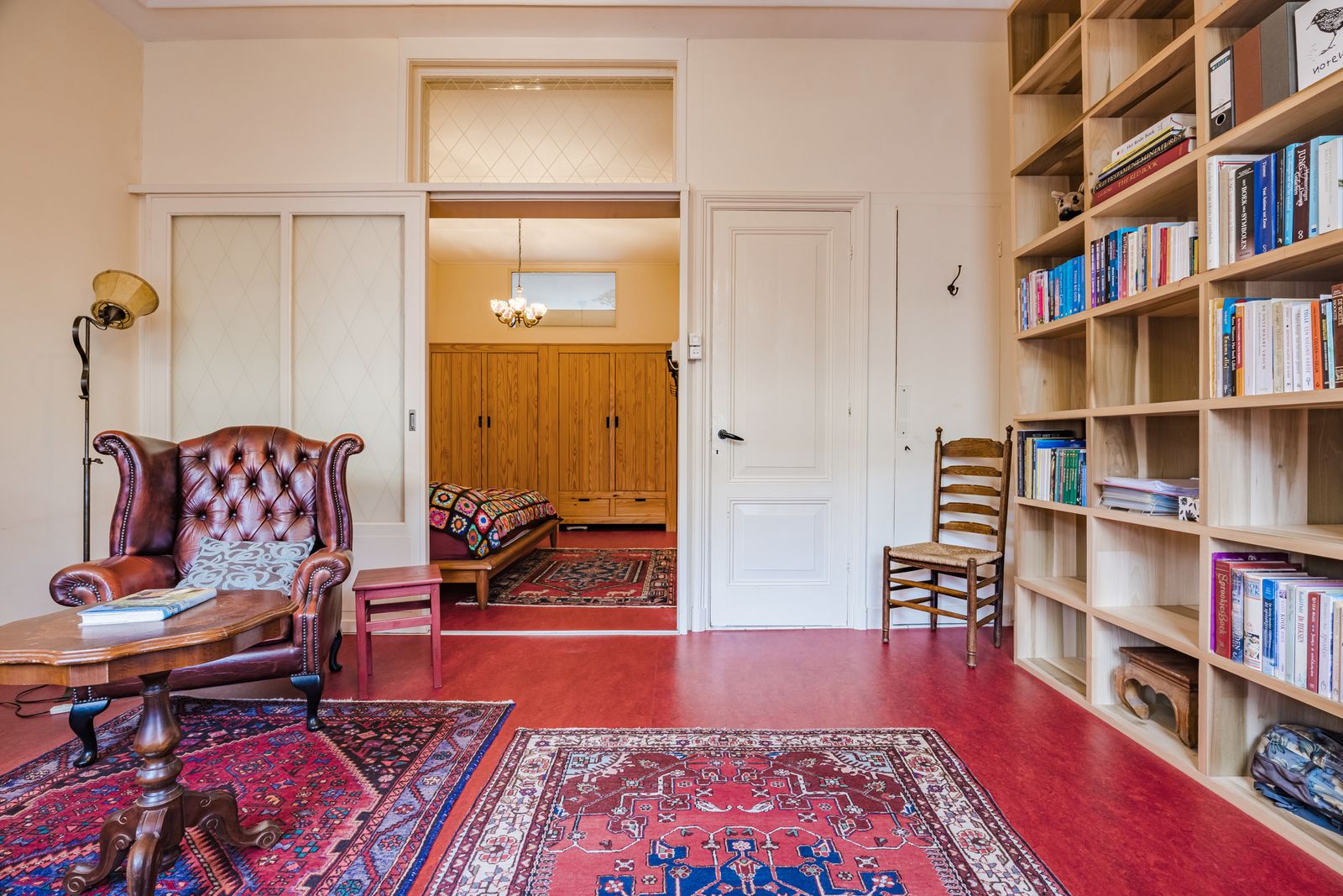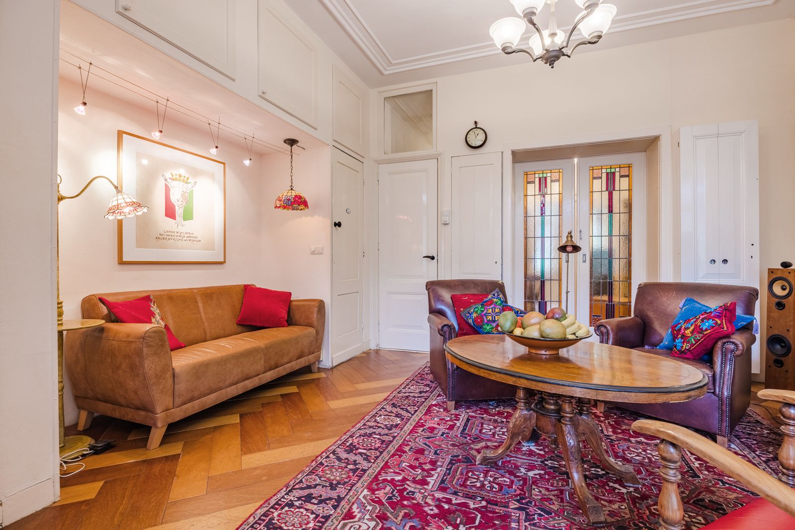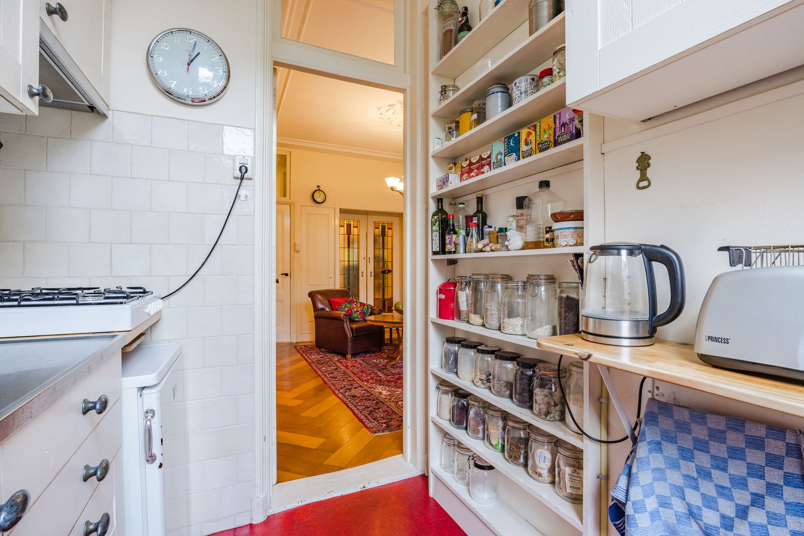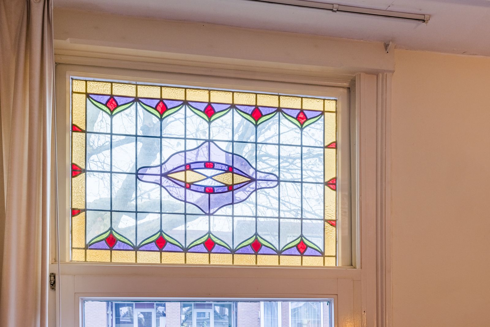 De ornamentenplafonds, gezandstraalde glazen tussendeur, originele paneeldeuren, inbouwkasten en glas-in-lood-schuifdeuren brengen de sfeer van vroeger op een bijzondere manier tot leven. Zelfs het karaktervolle hang- en sluitwerk verdient de aandacht. Ook de buitenzijde van de woning draagt nog de oorspronkelijke ornamenten, waardoor het geheel zijn historische uitstraling volledig behouden heeft.