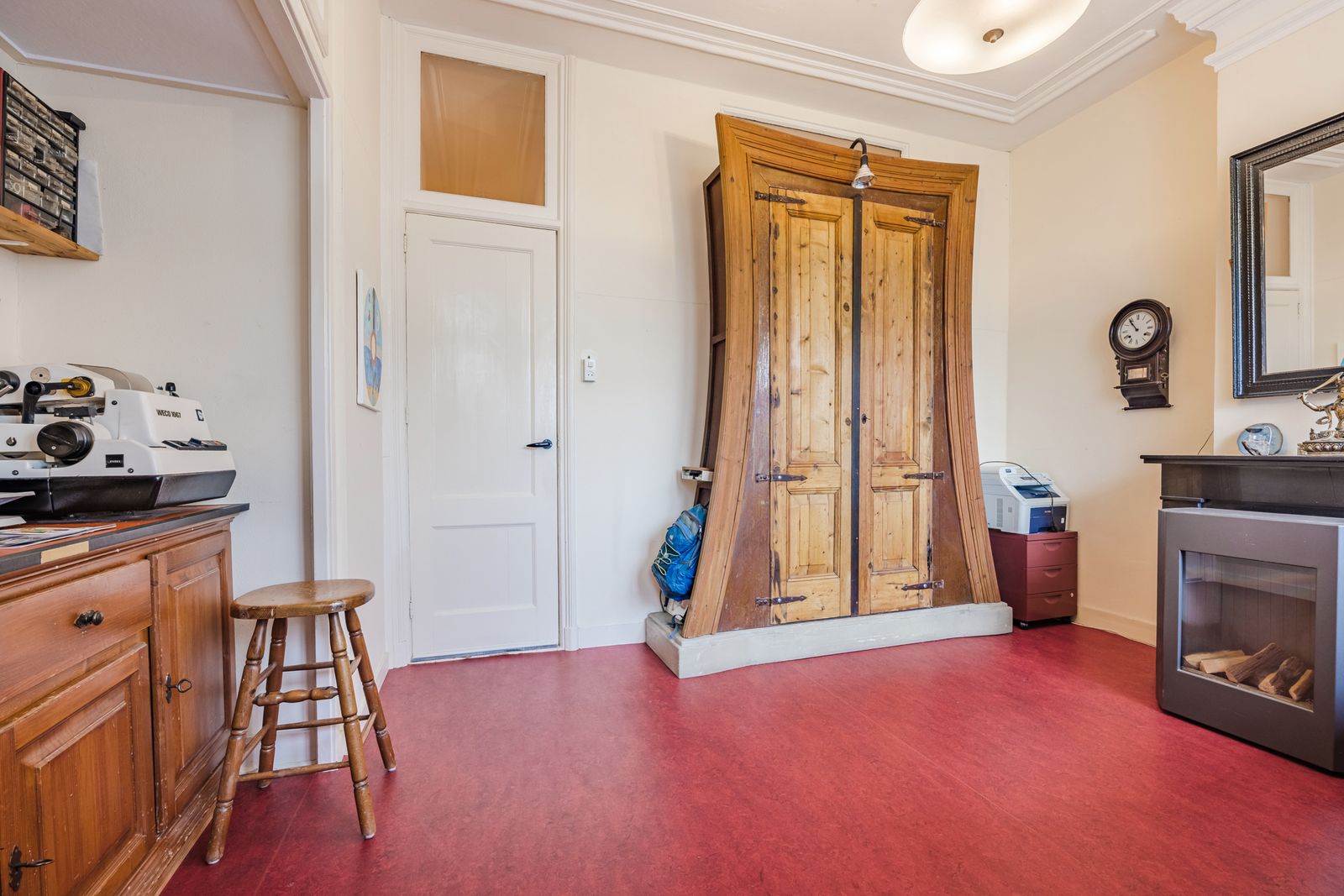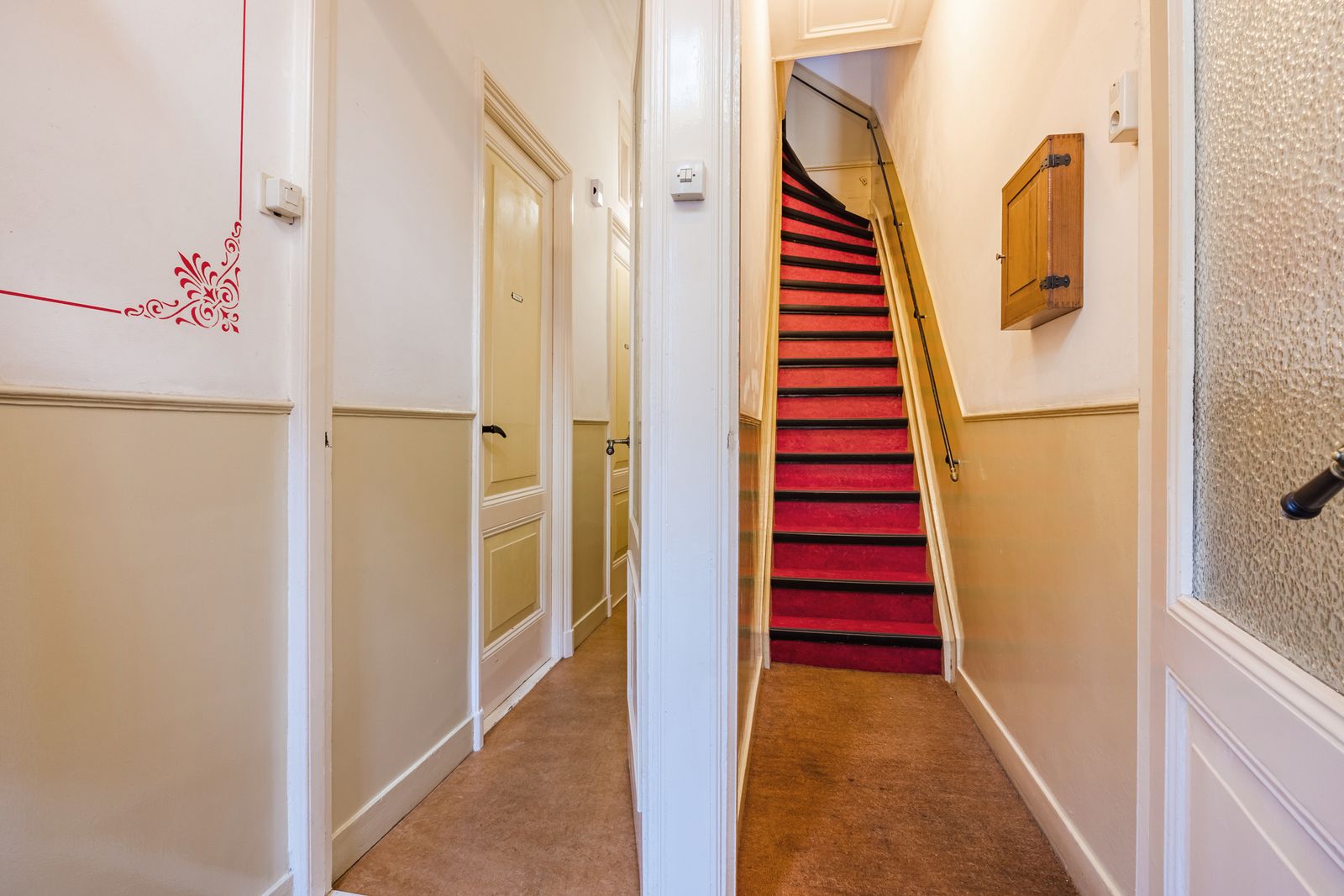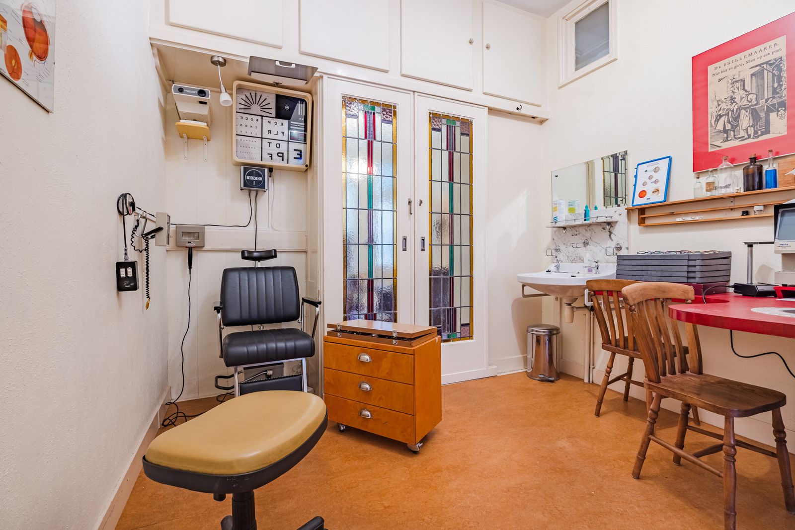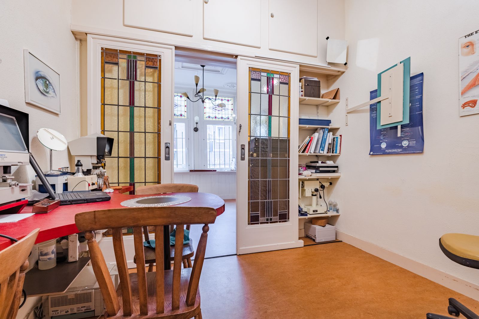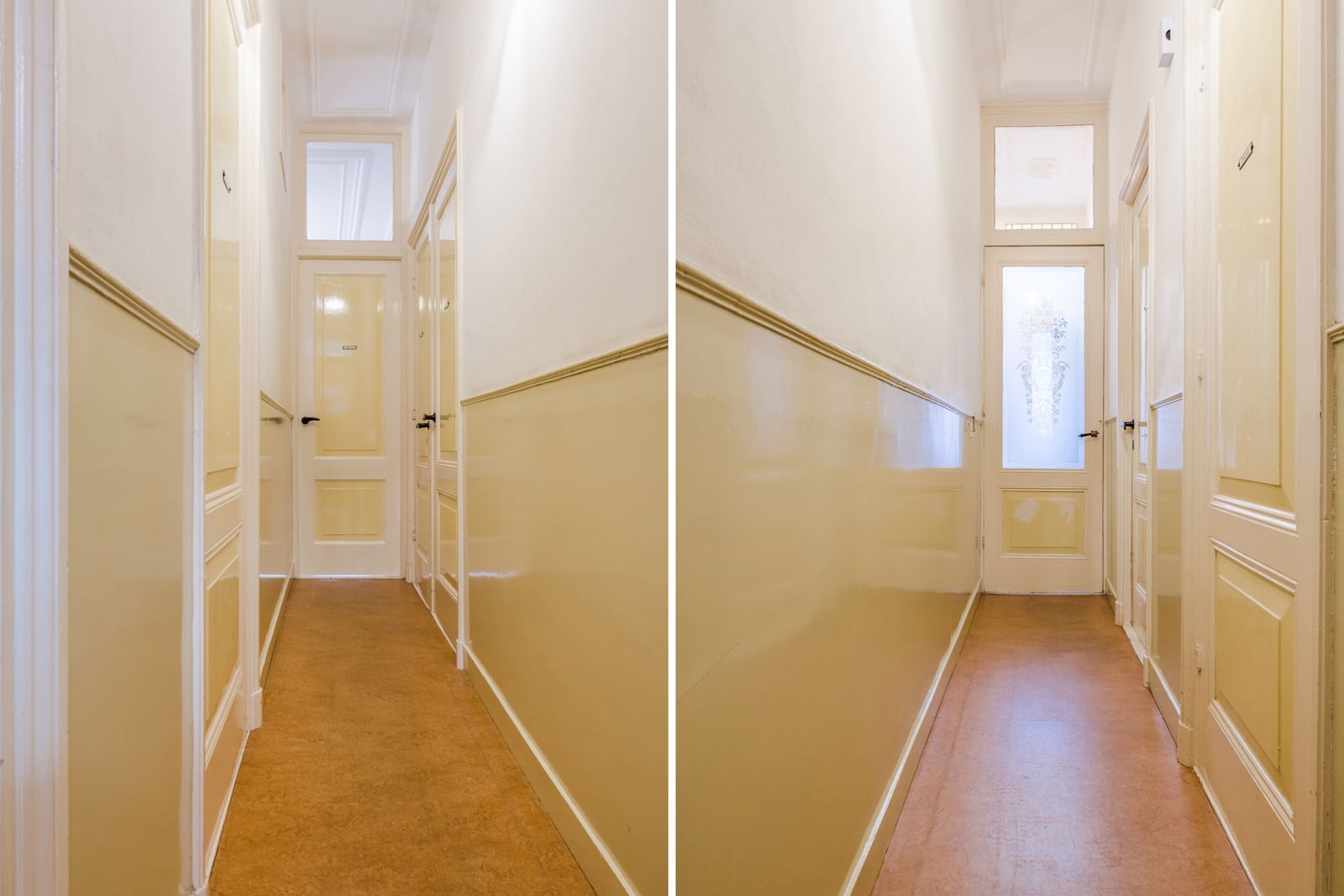 Bij binnenkomst betreed je de entreehal, die via originele tussendeuren toegang geeft tot wat ooit de benedenwoning was, evenals tot de trapopgang richting de bovenverdieping. Vanuit de hal leidt een lange, karaktervolle gang naar de voor- en tussenkamer (momenteel in gebruik als praktijkruimte), het toilet, een garderobekast en de royale achter-/woonkamer met openslaande deuren naar het balkon.