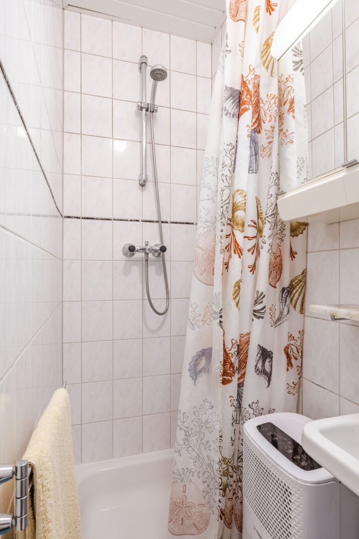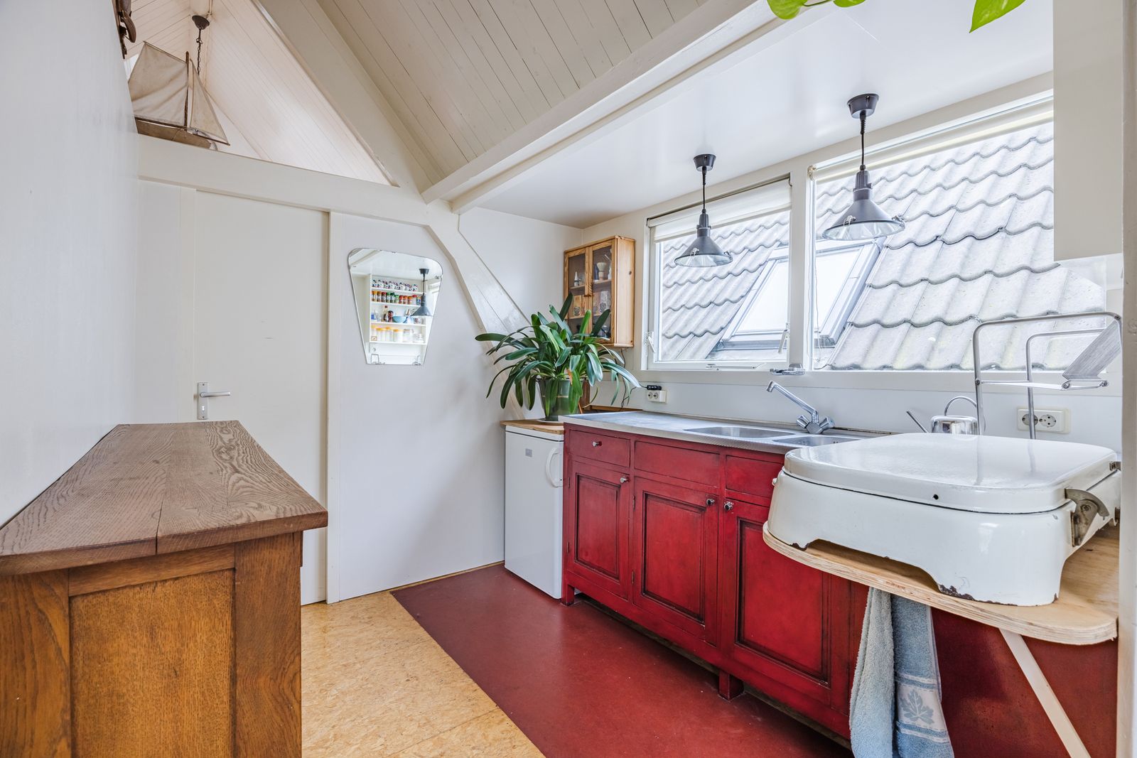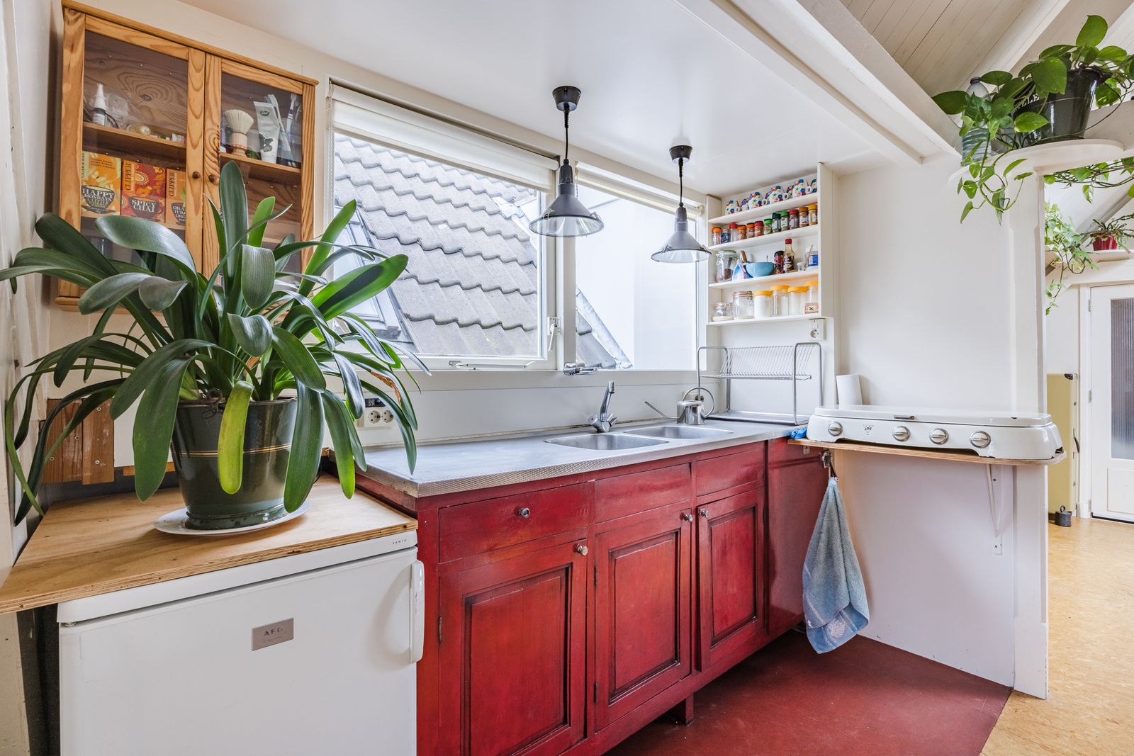 In de middenkamer bevindt zich een praktisch keukenblok met twee spoelbakken en een karaktervol geëmailleerd gaststel. De zolderverdieping wordt verwarmd door twee gaskachels en een houtkachel, wat deze etage een warme en huiselijke sfeer geeft.