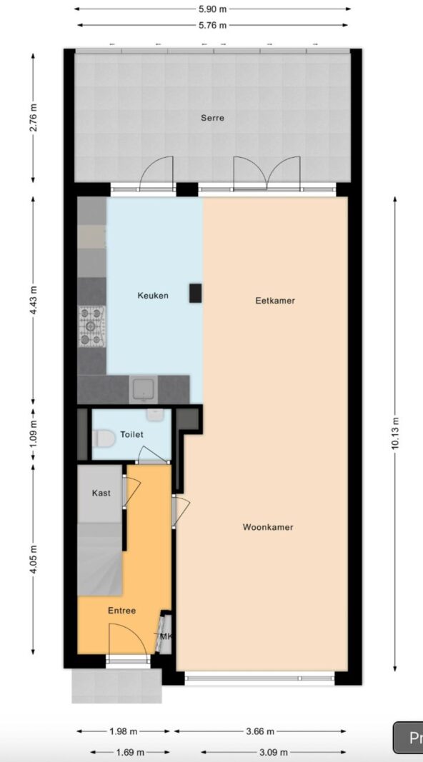 De begane grond beschikt over een entree met hal, trapopgang en separaat toilet. Vanuit de hal bereikt u de ruime woonkamer aan de voorzijde, die overgaat in de open keuken aan de achterzijde. De keuken geeft direct toegang tot de veranda en de tuin met aparte berging.