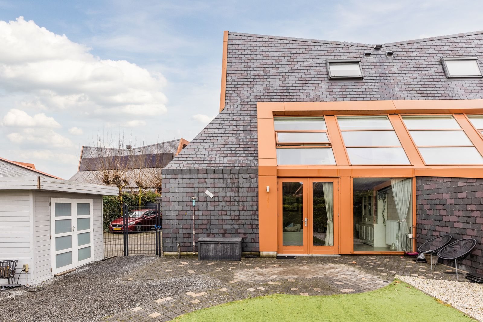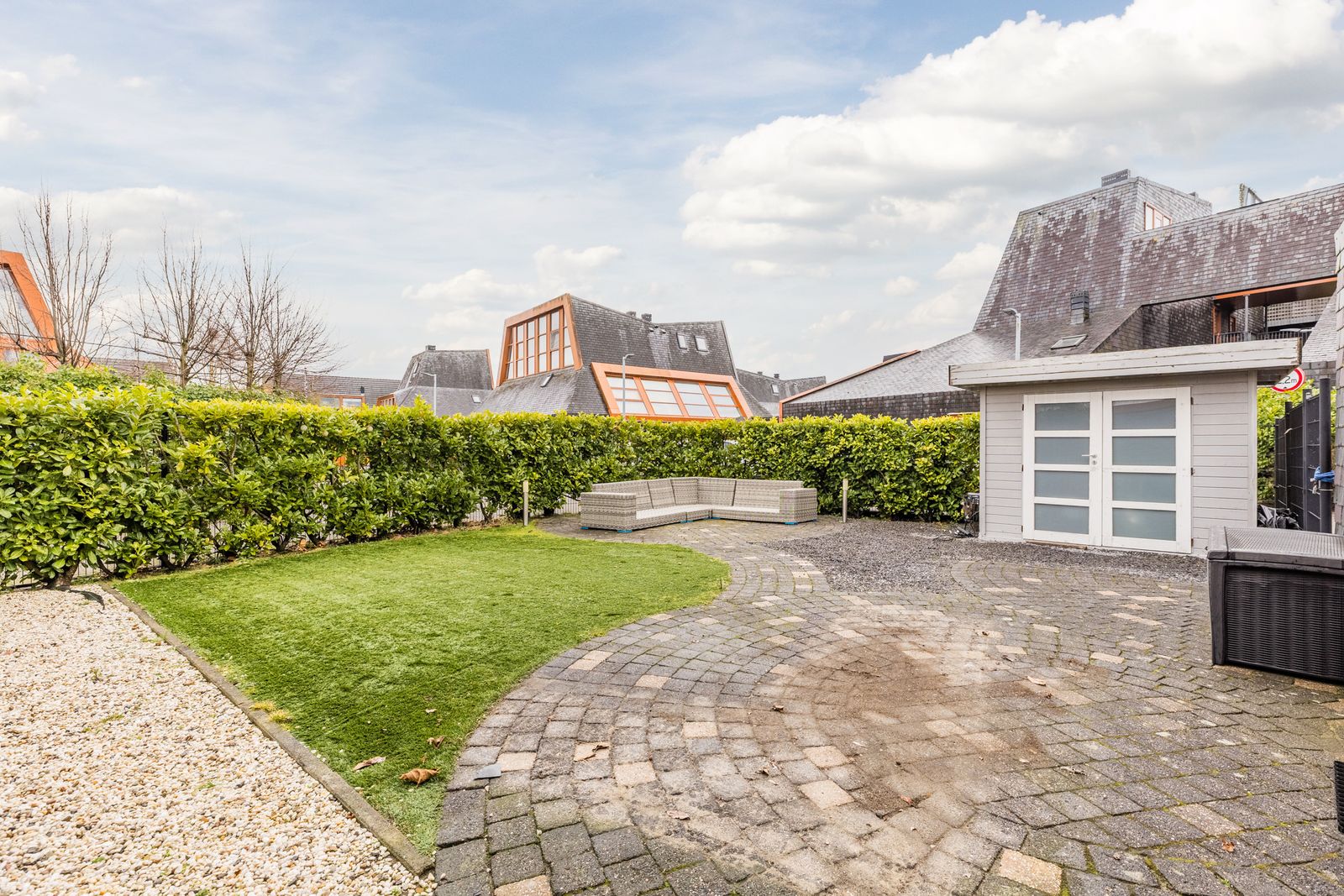 De tuin is rondom de woning gelegen en met zorg aangelegd. Je vindt er een fijn terras, altijd wel een plekje in de zon of schaduw. En extra prettig: je parkeert je auto gewoon op je eigen terrein. Comfortabel én praktisch.