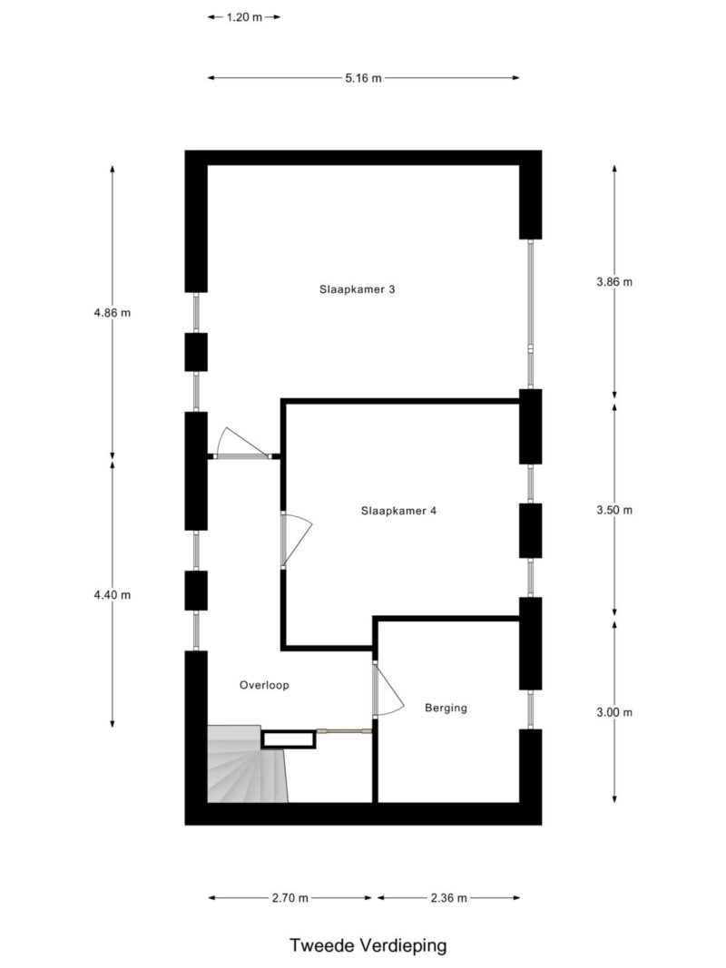 Overloop met toegang tot twee slaapkamers en de berging/technische ruimte.