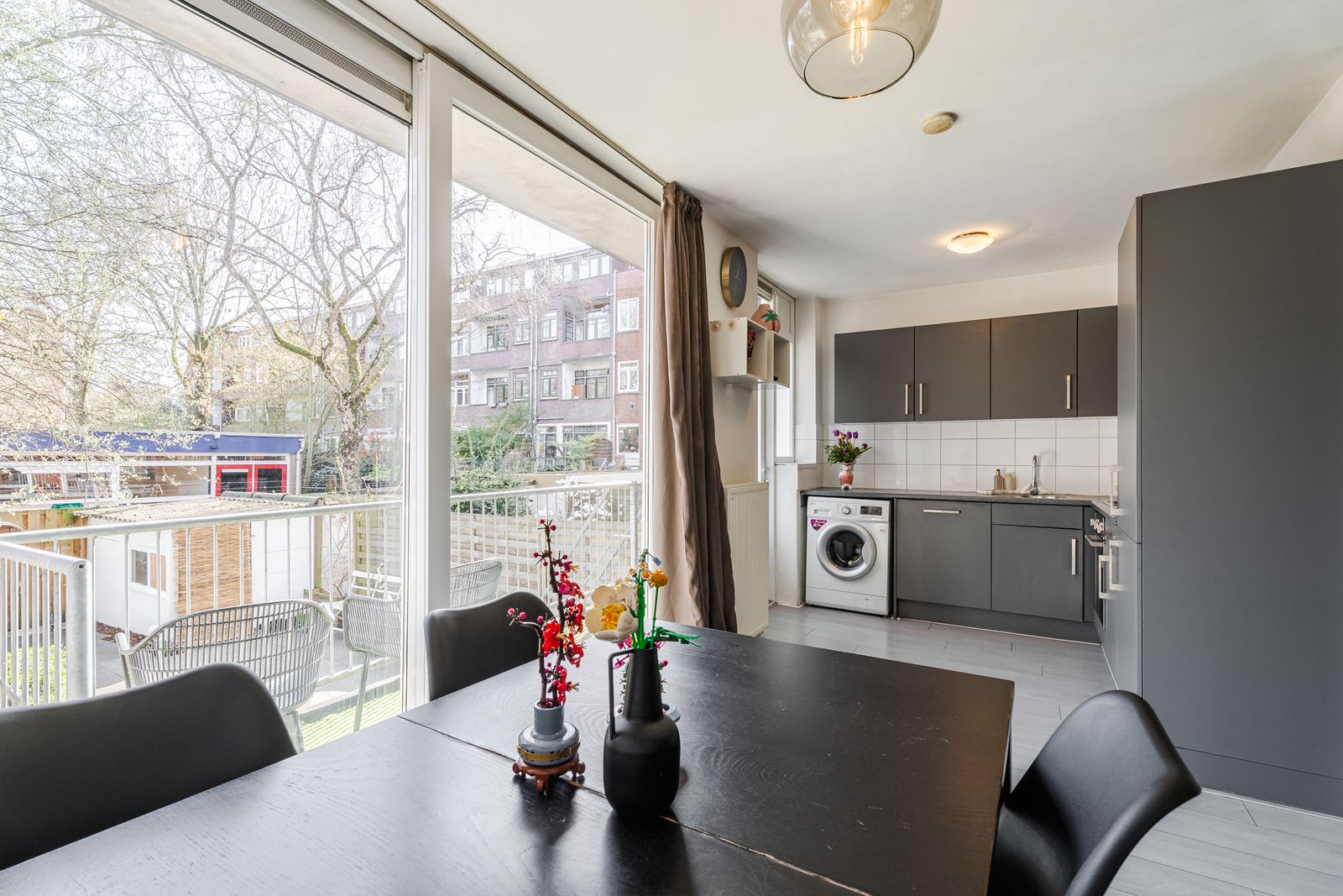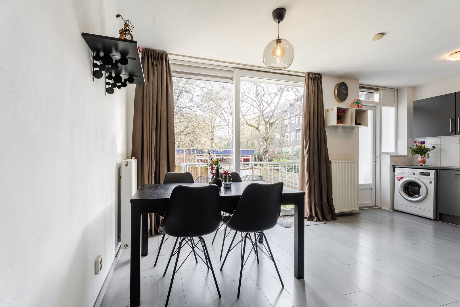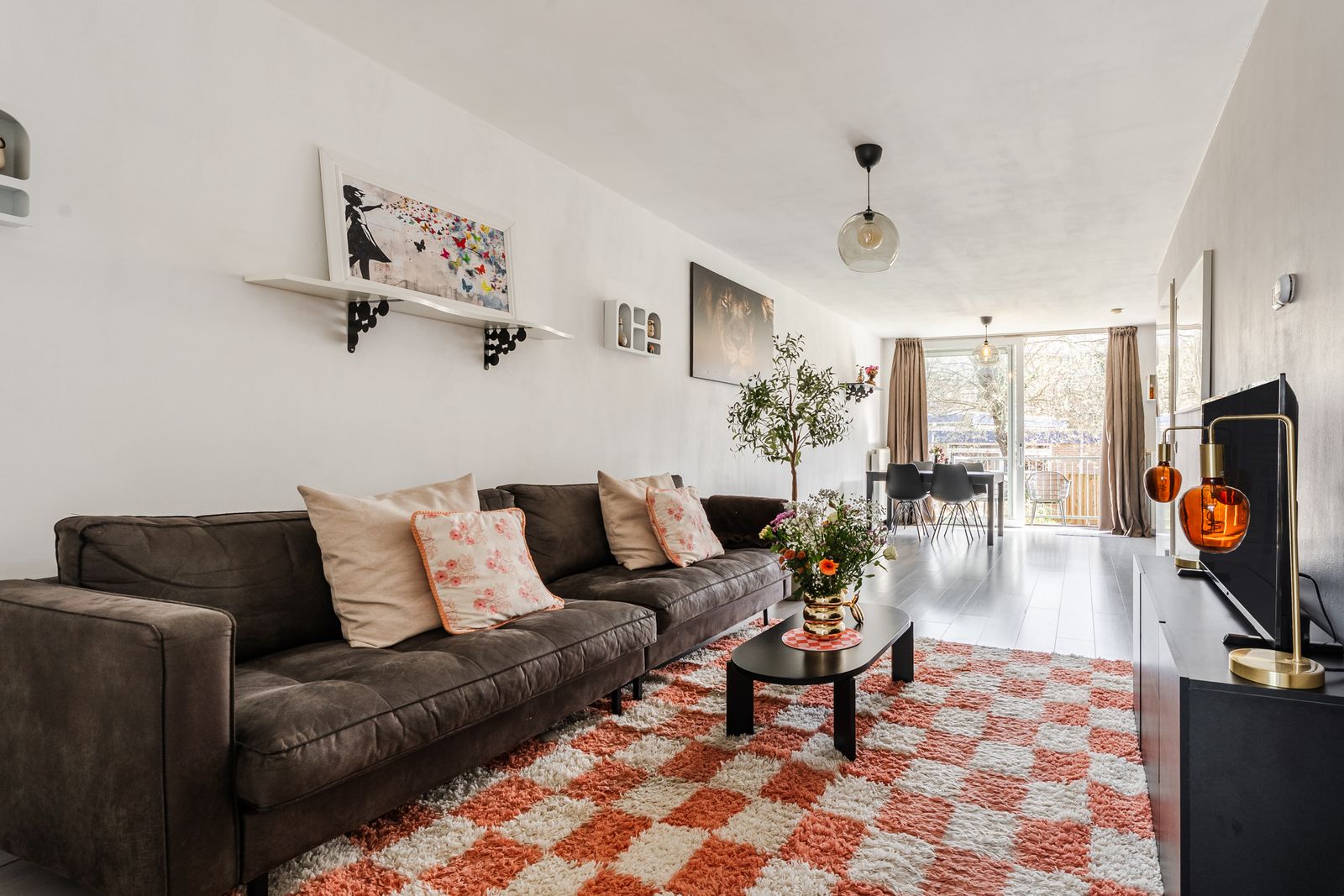 Aan de achterzijde ligt de royale woonkamer met veel lichtinval. Vanuit de woonkamer is er direct toegang tot het balkon en de daarachter gelegen achtertuin, wat zorgt voor een sterke verbinding tussen binnen en buiten.