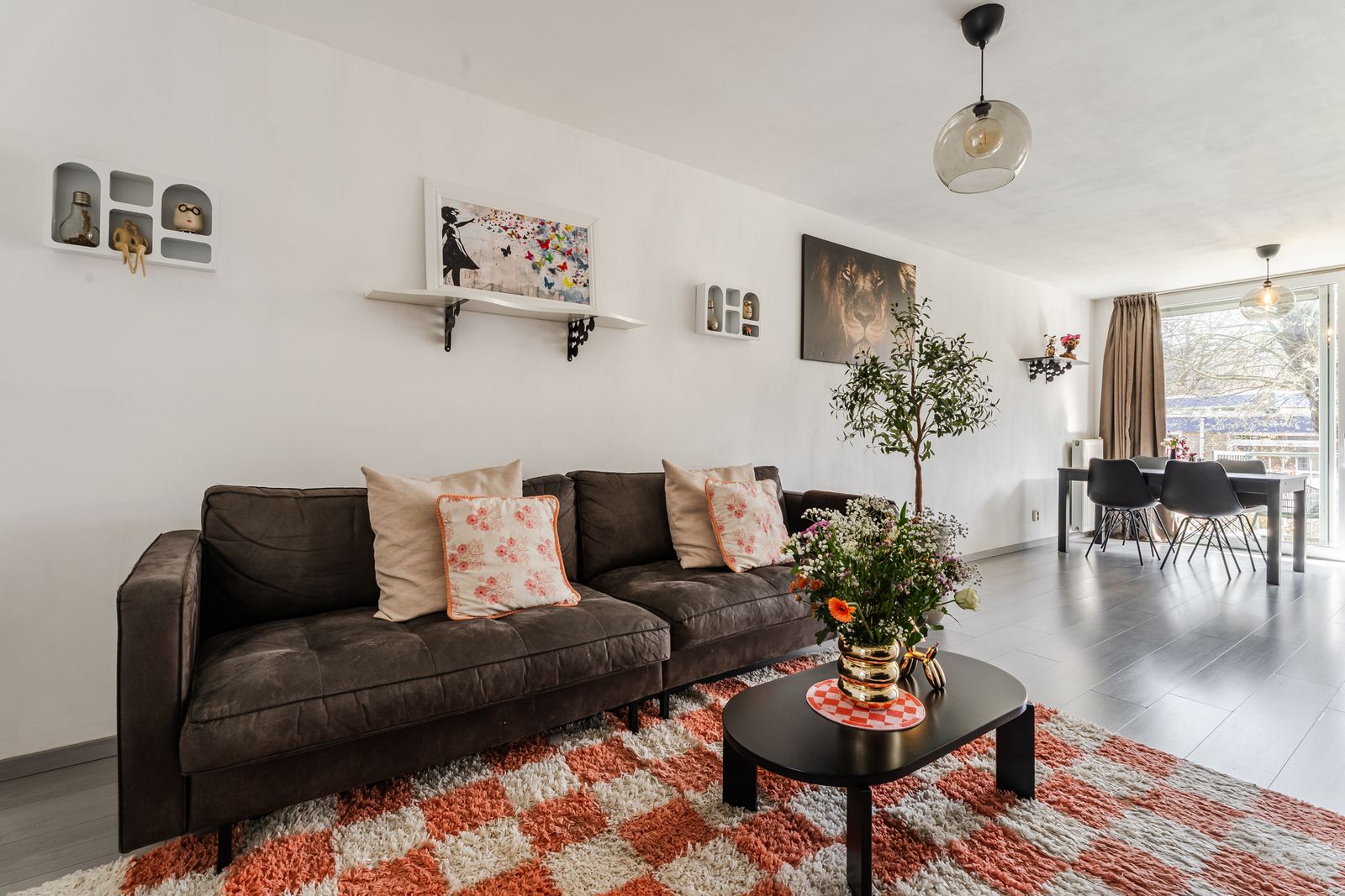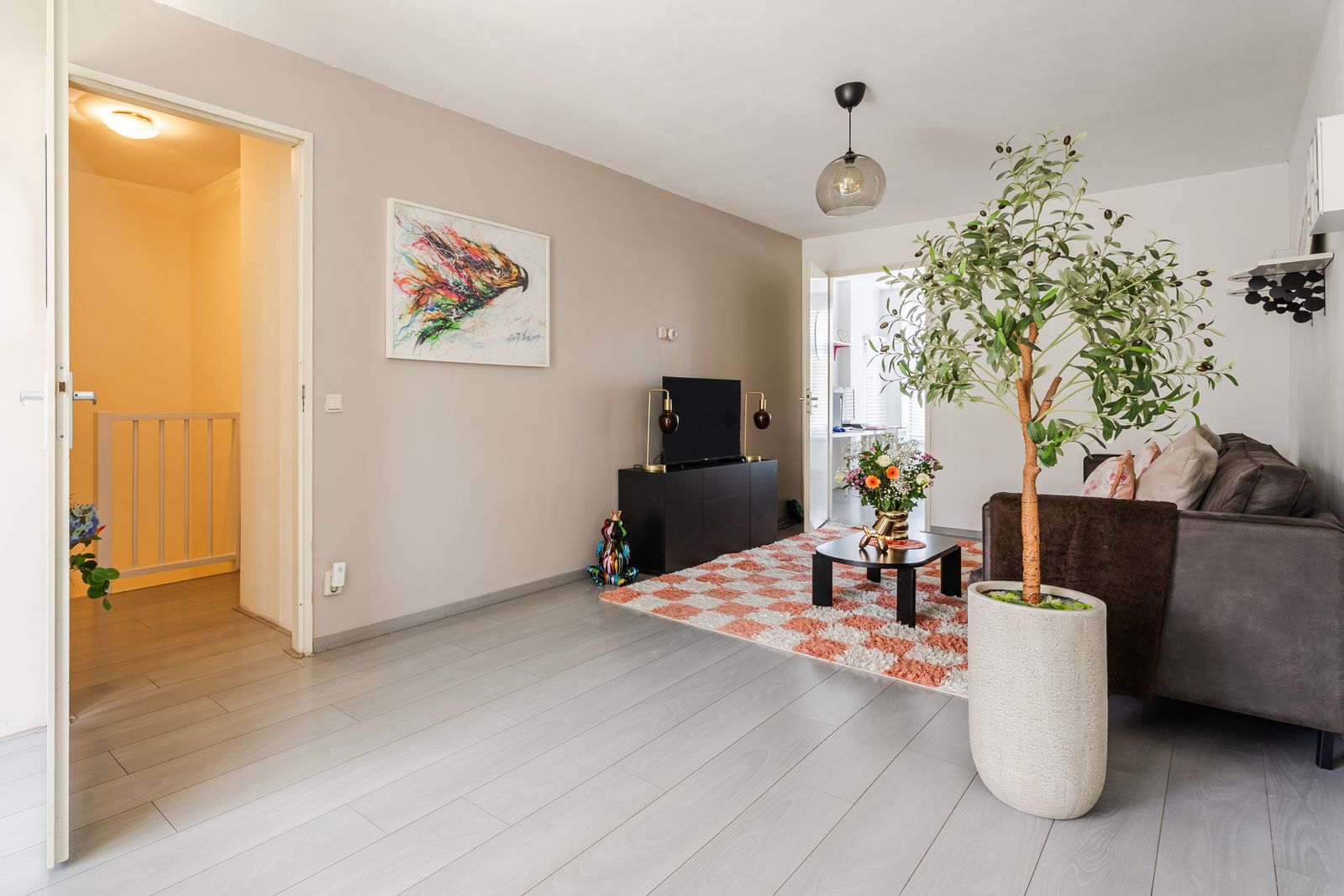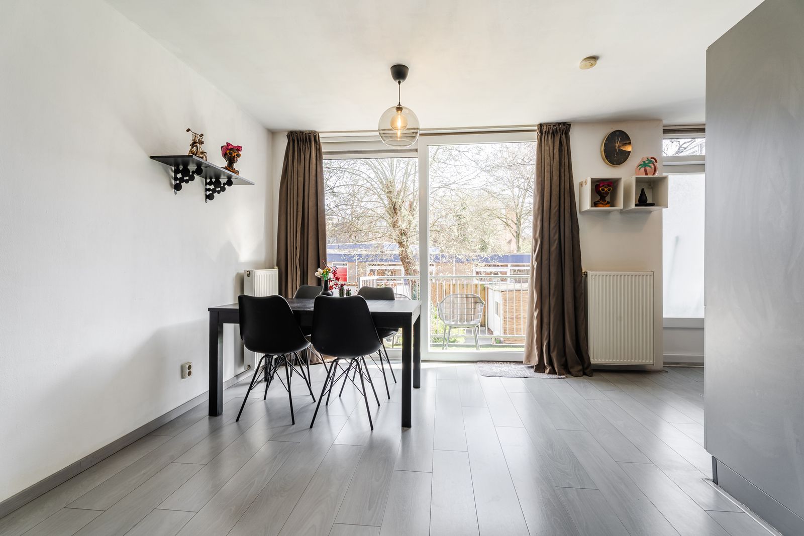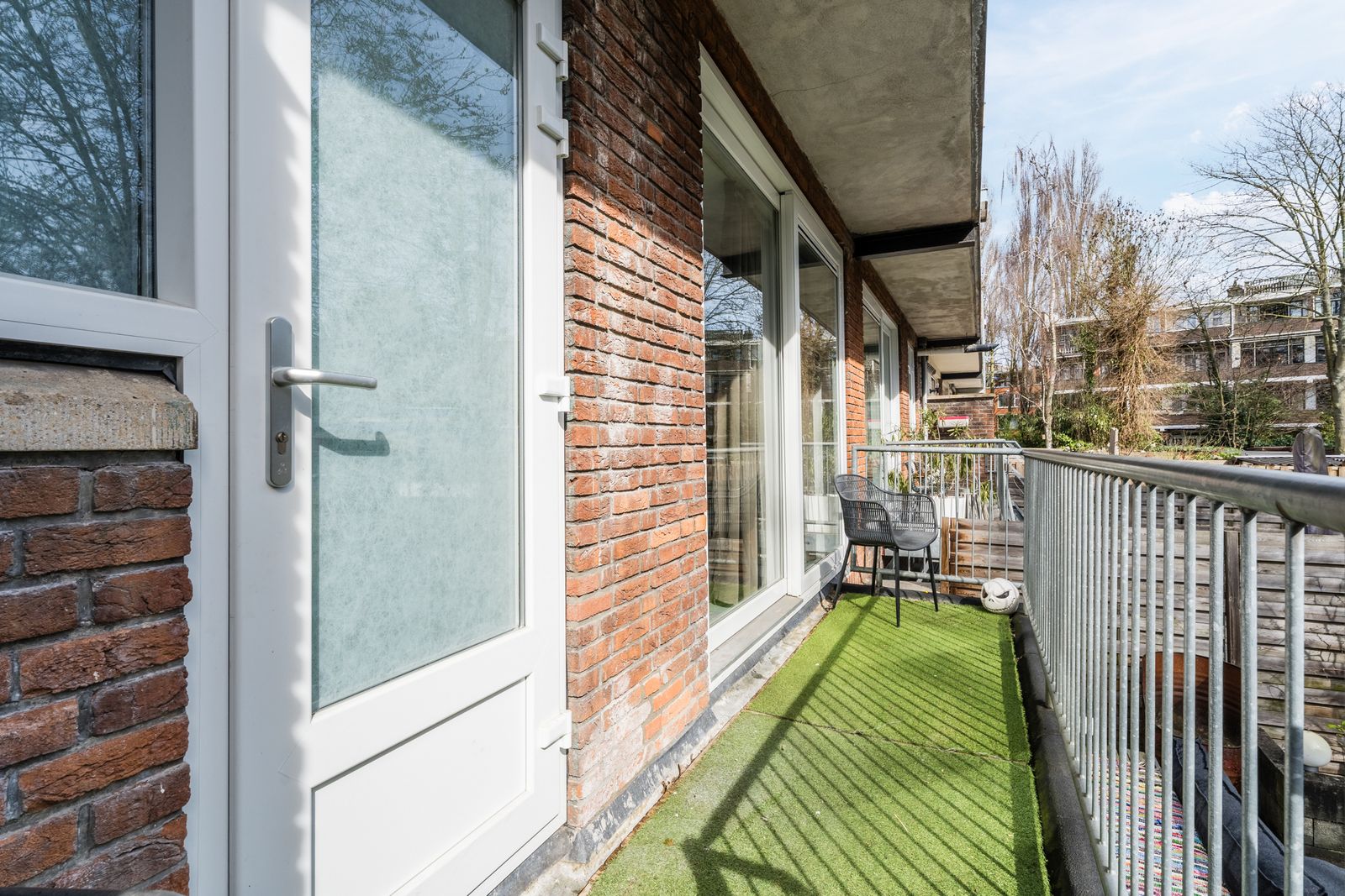 Aan de achterzijde ligt de royale woonkamer met veel lichtinval. Vanuit de woonkamer is er direct toegang tot het balkon en de daarachter gelegen achtertuin, wat zorgt voor een sterke verbinding tussen binnen en buiten.