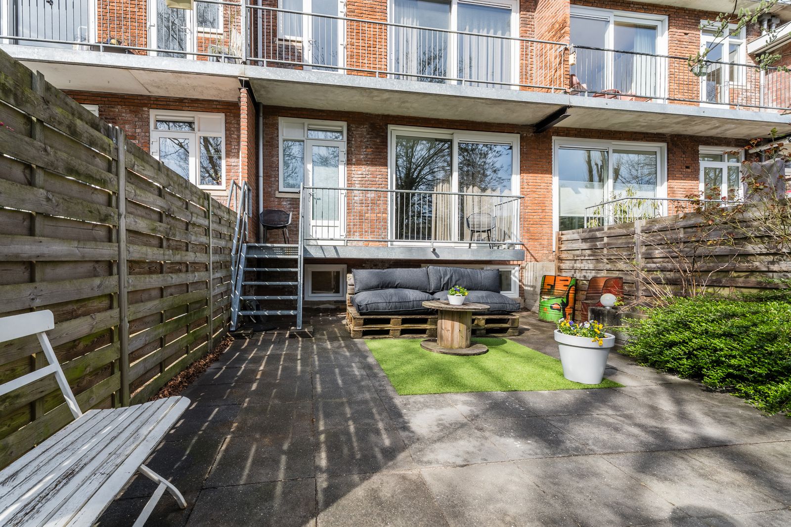 De woning beschikt over een diepe achtertuin van circa 60 m², bereikbaar via het balkon op de begane grond.