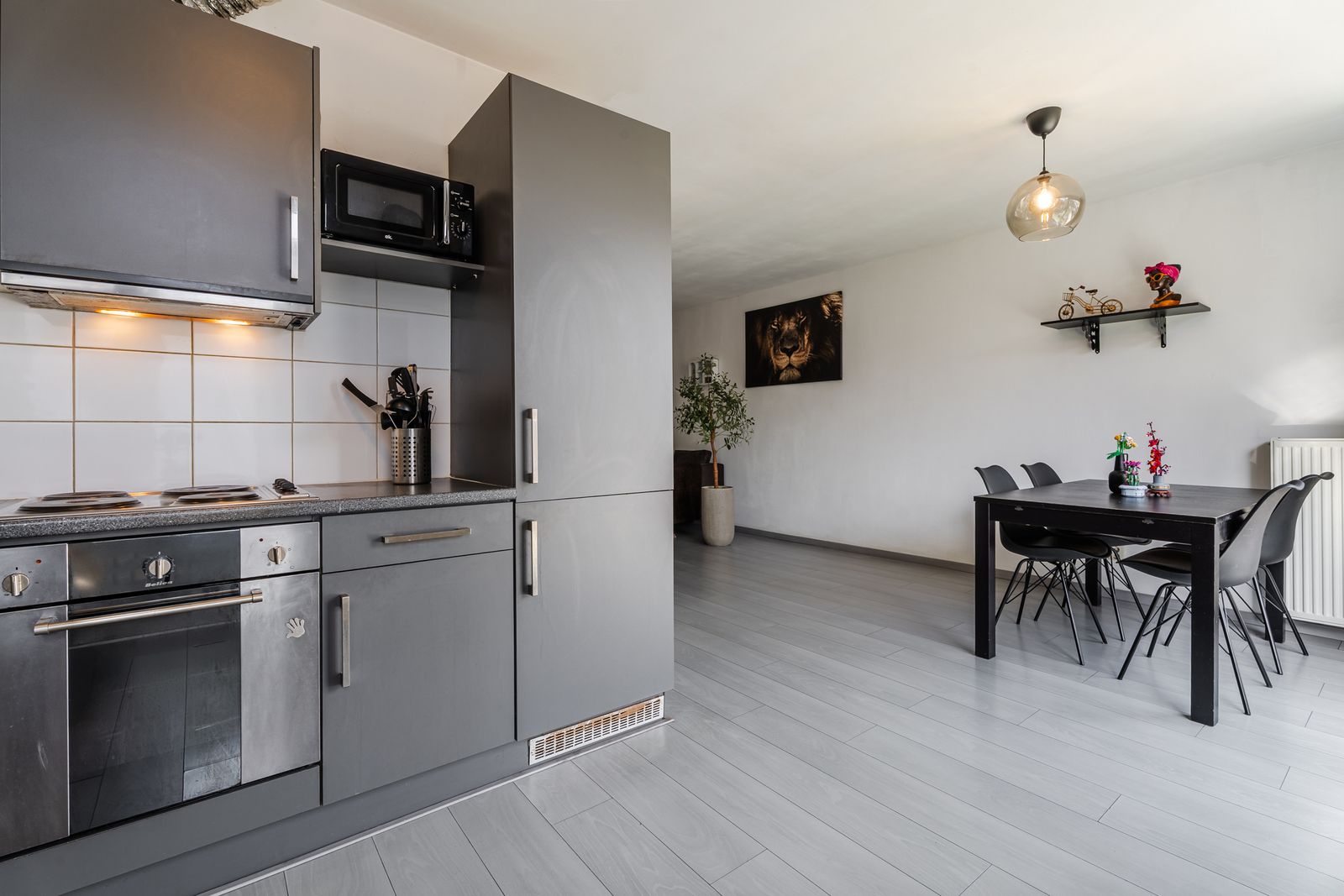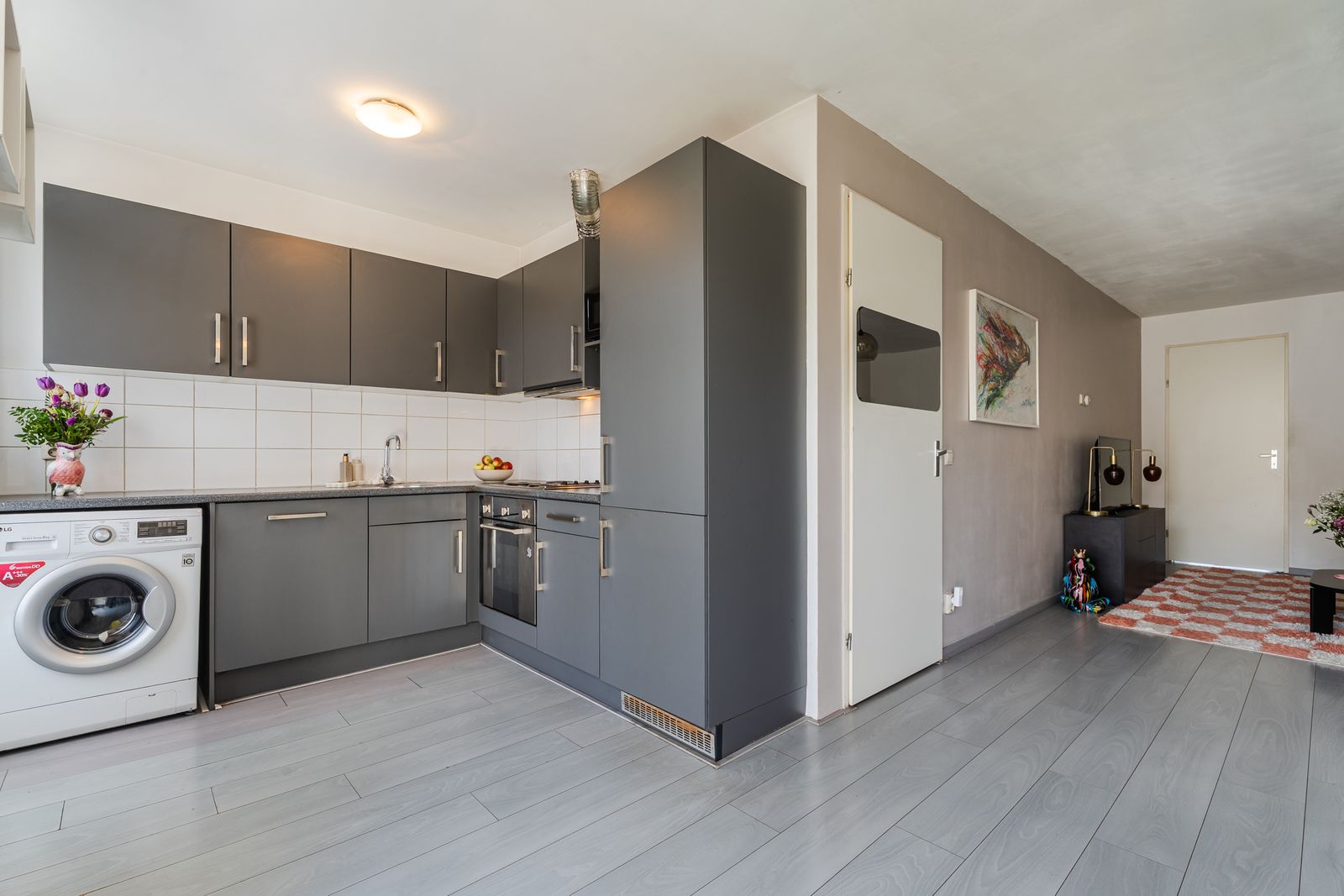 De keuken is centraal op deze woonlaag gesitueerd en grenst aan het balkon. De keuken is functioneel ingericht met inbouwapparatuur en biedt eveneens toegang tot buiten.