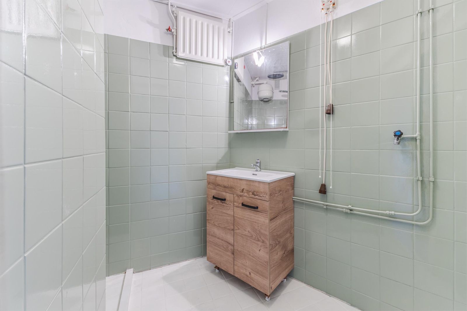 De woning heeft een ruime zonnige woonkamer met grote ramen en centrale verwarming, keuken met inductiekookplaat en koelkast, wc en badkamer met regendouche en nieuw badkamermeubel. Beneden een berging voor de fietsen.