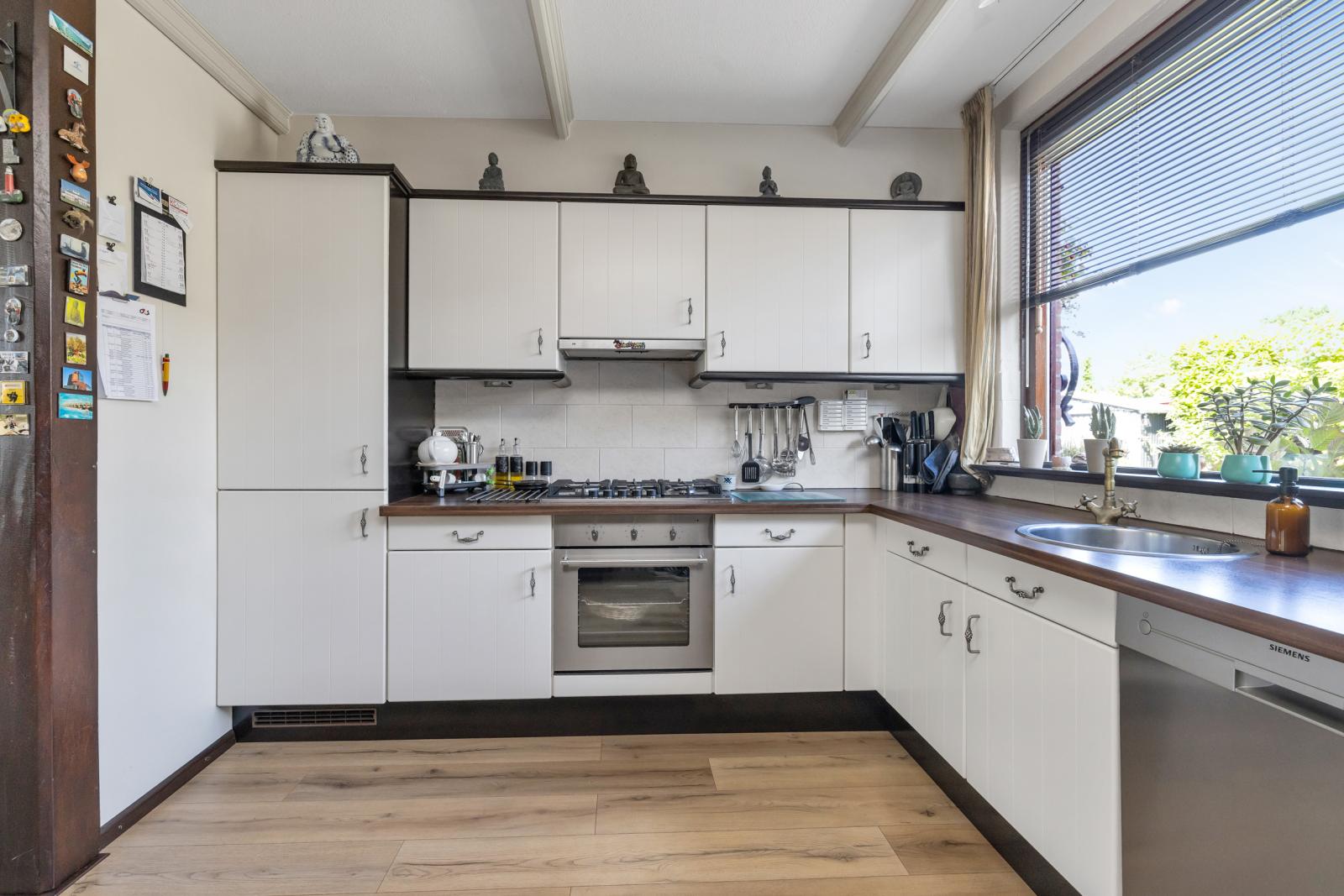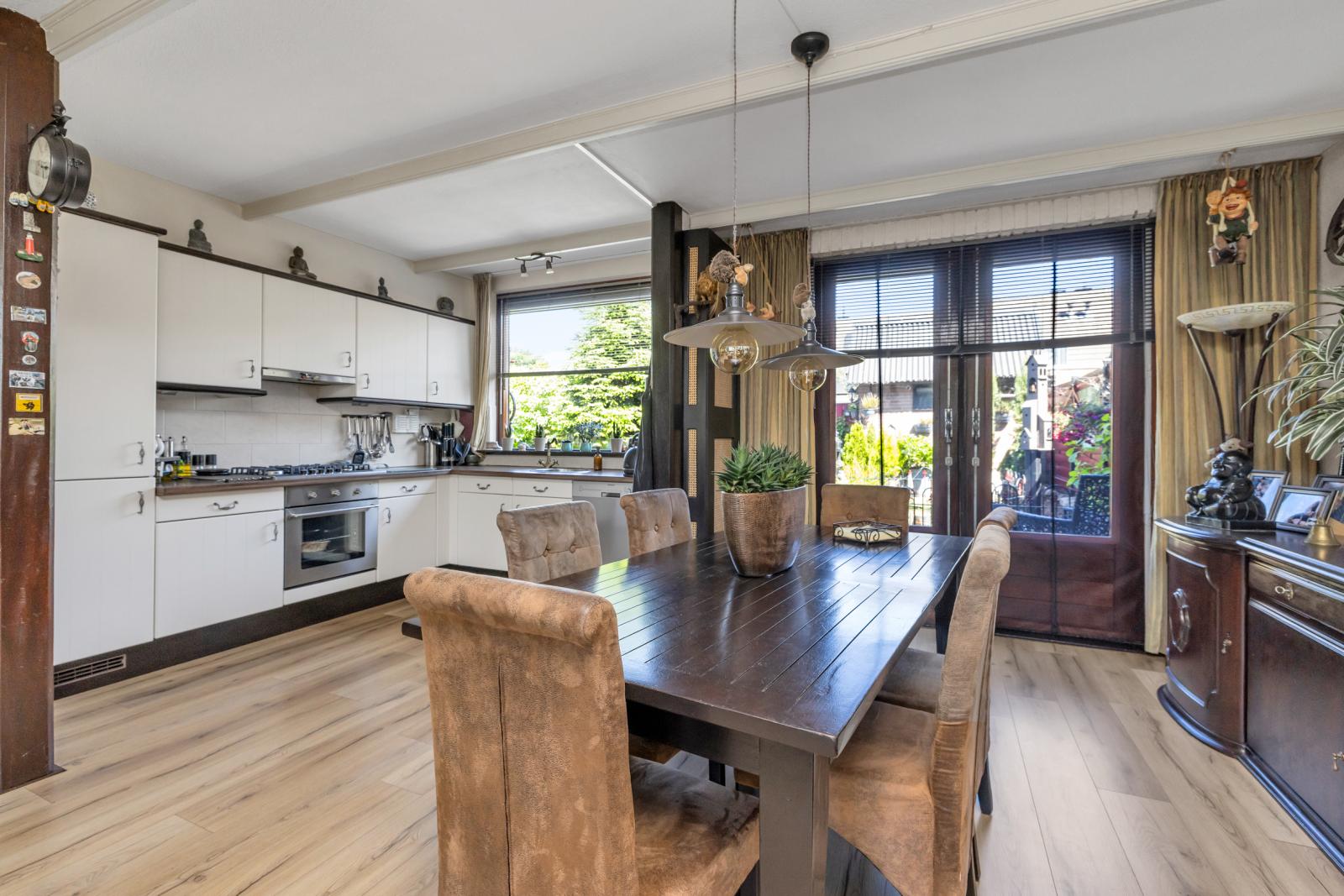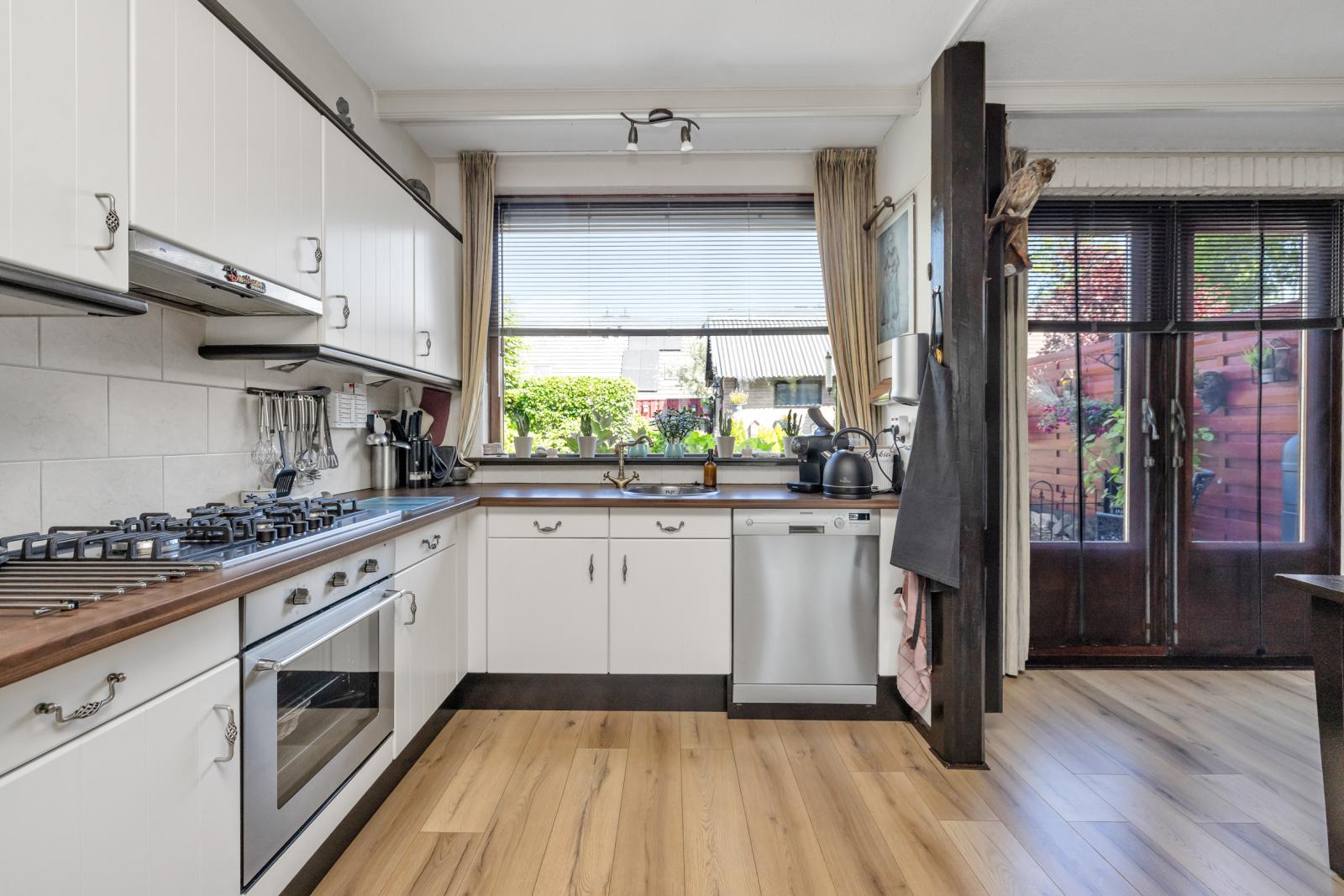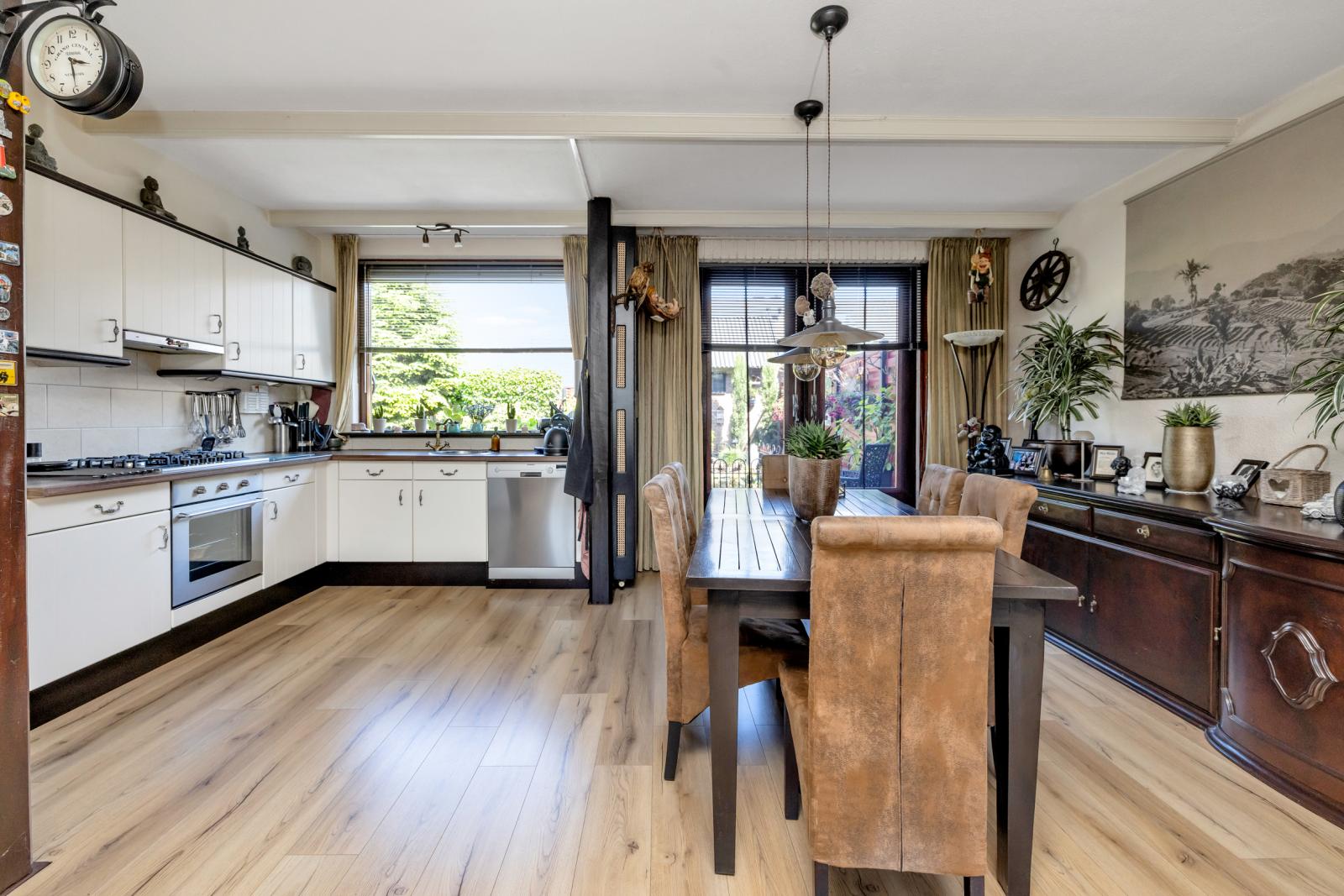 Entree, garderobe, meterkast (glasvezel aanwezig), toiletruimte met hangtoilet en fonteintje, doorgang naar de woonkamer en de royale leefkeuken met dubbele deuren naar de op het oosten gelegen tuin. De tuingerichte leefkeuken is voorzien van een combi oven, 5 pits gaskookplaat, afzuigkap, vaatwasser en een koel/vriescombinatie. Aan de zijkant van de woning bevindt zich de uitbouw met daarin de wasmachine en droger aansluiting, 2e keukenblok en deur naar de achtertuin. In de tuin bevinden zich twee bergingen, een achterom en parkeren kan op eigen terrein aan de voorzijde van de woning.