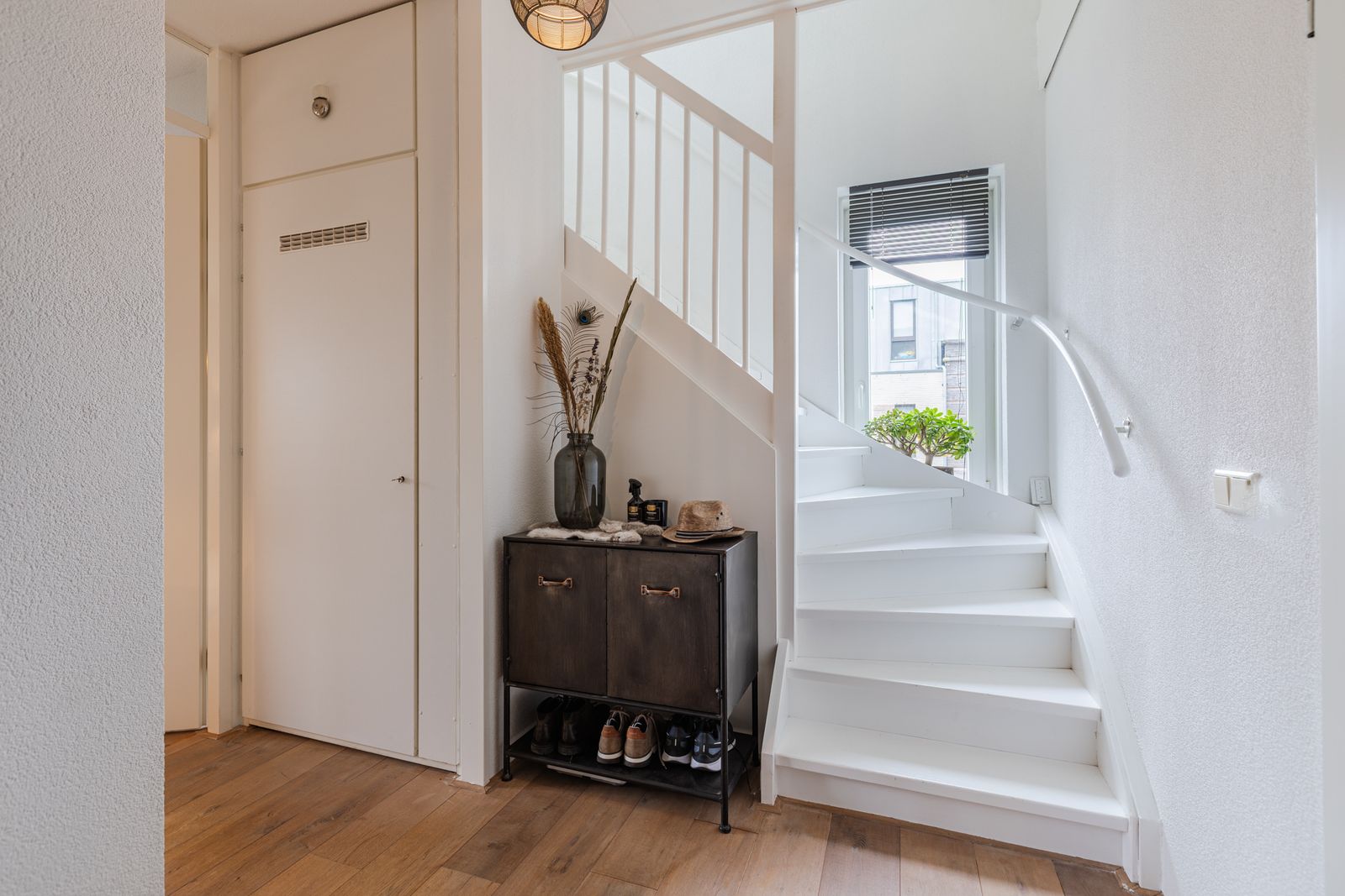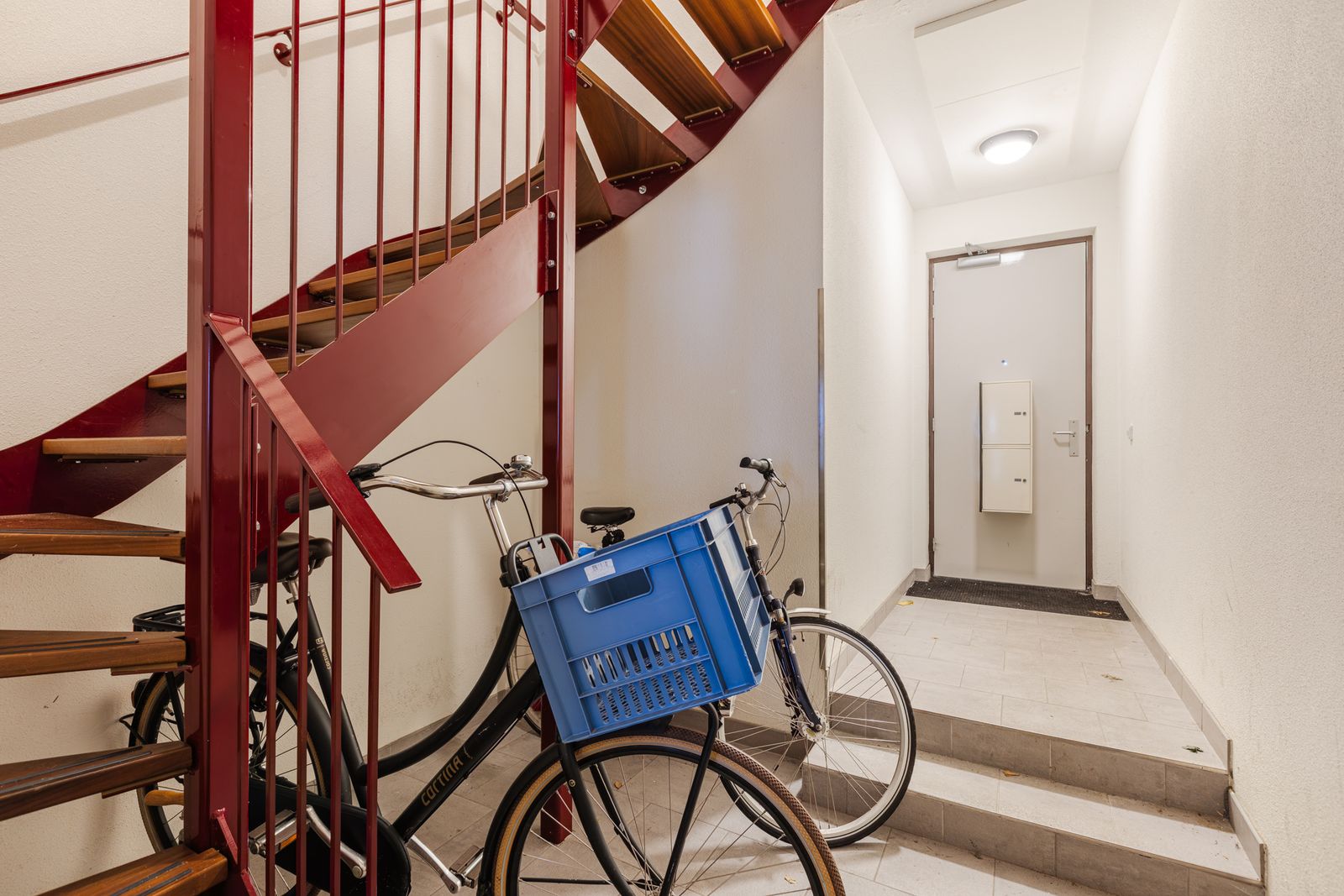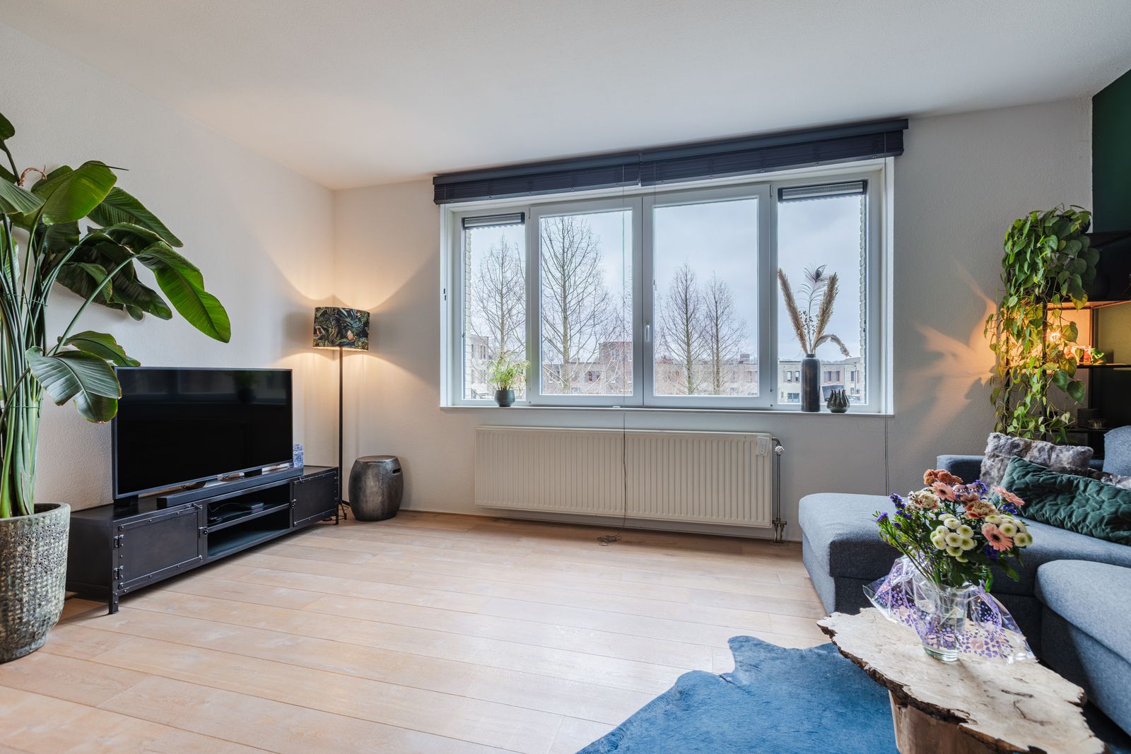 De maisonnette ligt op de tweede en derde (/bovenste) woonlaag en voelt direct ruim en licht bij binnenkomst. De woonlaag heeft een eiken-houten vloer (white-wash) en net afgewerkte wanden. Aan de linkerzijde van de entree bevindt zich de royale woonkamer, met grote ramen (HR++) die zorgen voor een fijne lichtinval en een aangename, open sfeer met uitzicht op de groene binnentuin. Met gemak kun je hier een gezellige zithoek creëren én bijvoorbeeld een werkplek of eettafel plaatsen om lange avonden te tafelen met vrienden of familie.