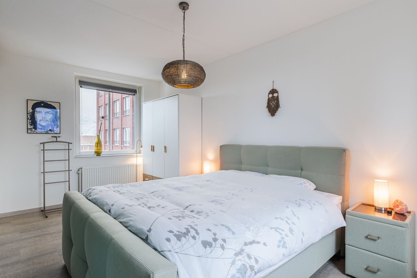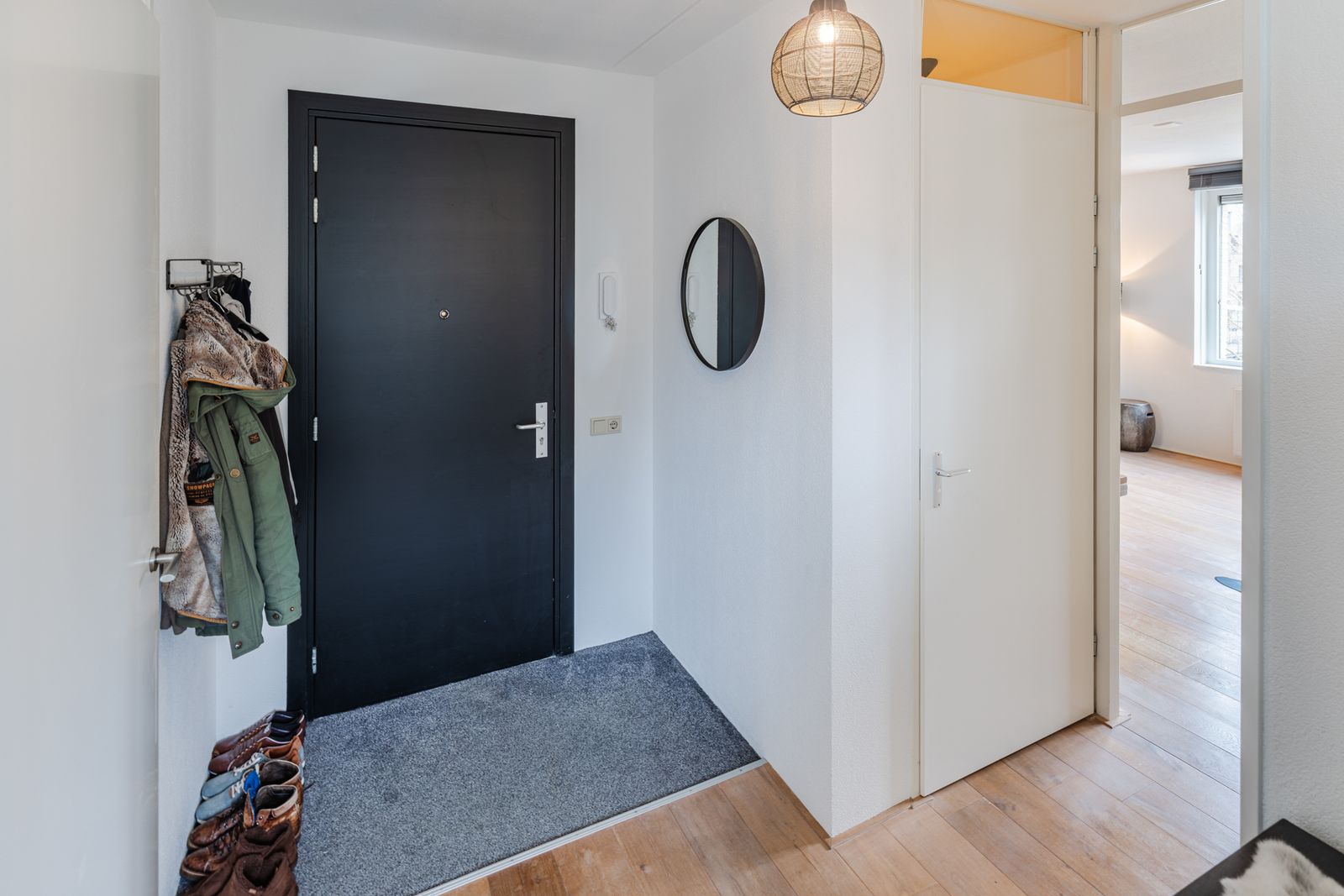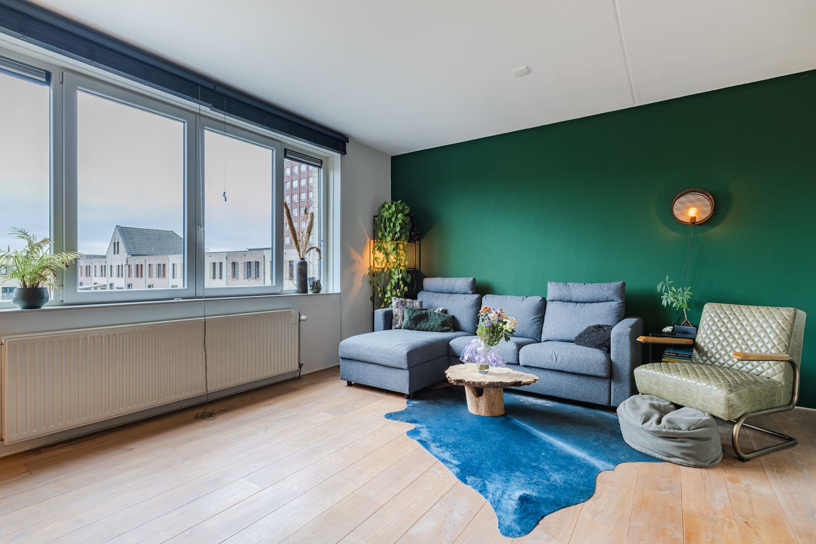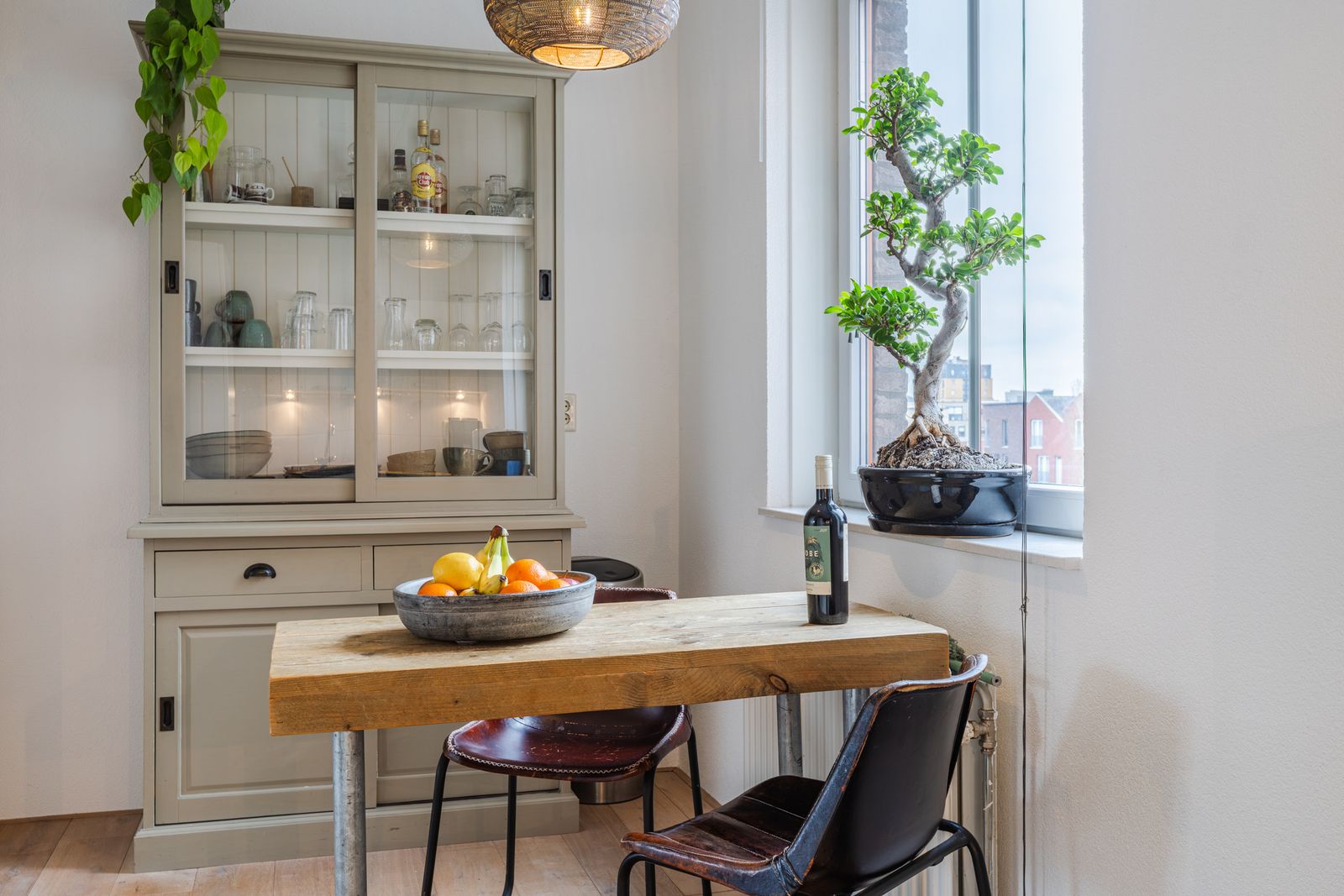 De maisonnette ligt op de tweede en derde (/bovenste) woonlaag en voelt direct ruim en licht bij binnenkomst. De woonlaag heeft een eiken-houten vloer (white-wash) en net afgewerkte wanden. Aan de linkerzijde van de entree bevindt zich de royale woonkamer, met grote ramen (HR++) die zorgen voor een fijne lichtinval en een aangename, open sfeer met uitzicht op de groene binnentuin. Met gemak kun je hier een gezellige zithoek creëren én bijvoorbeeld een werkplek of eettafel plaatsen om lange avonden te tafelen met vrienden of familie.