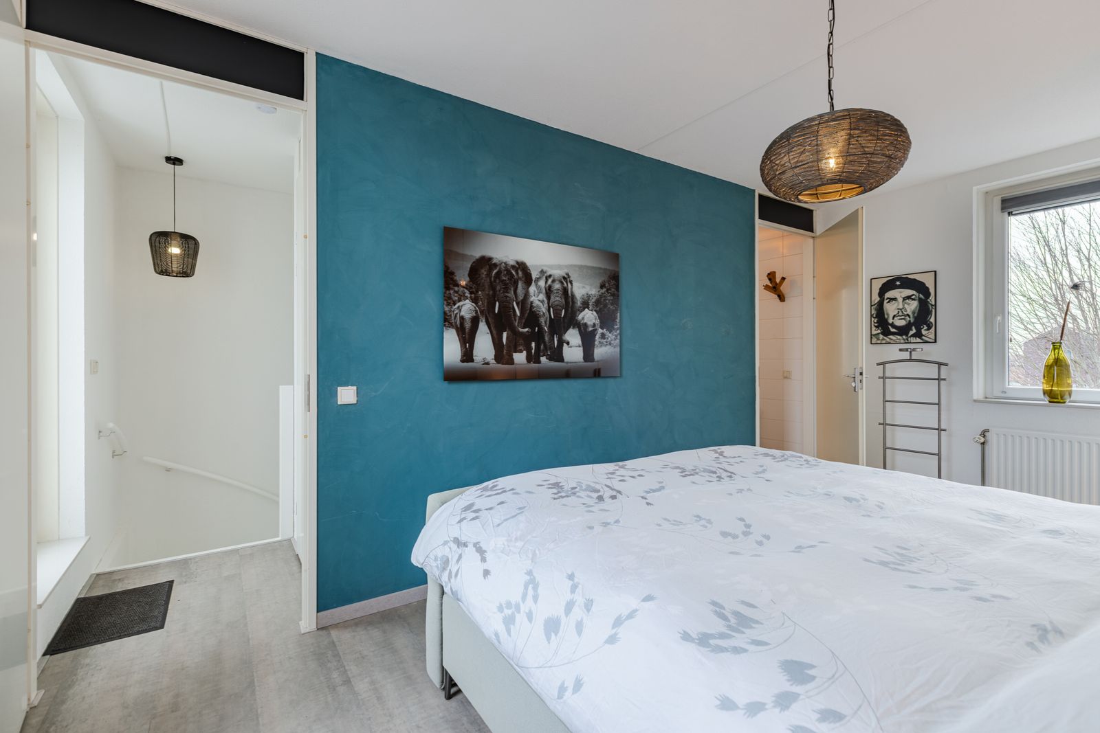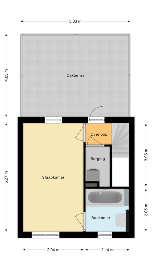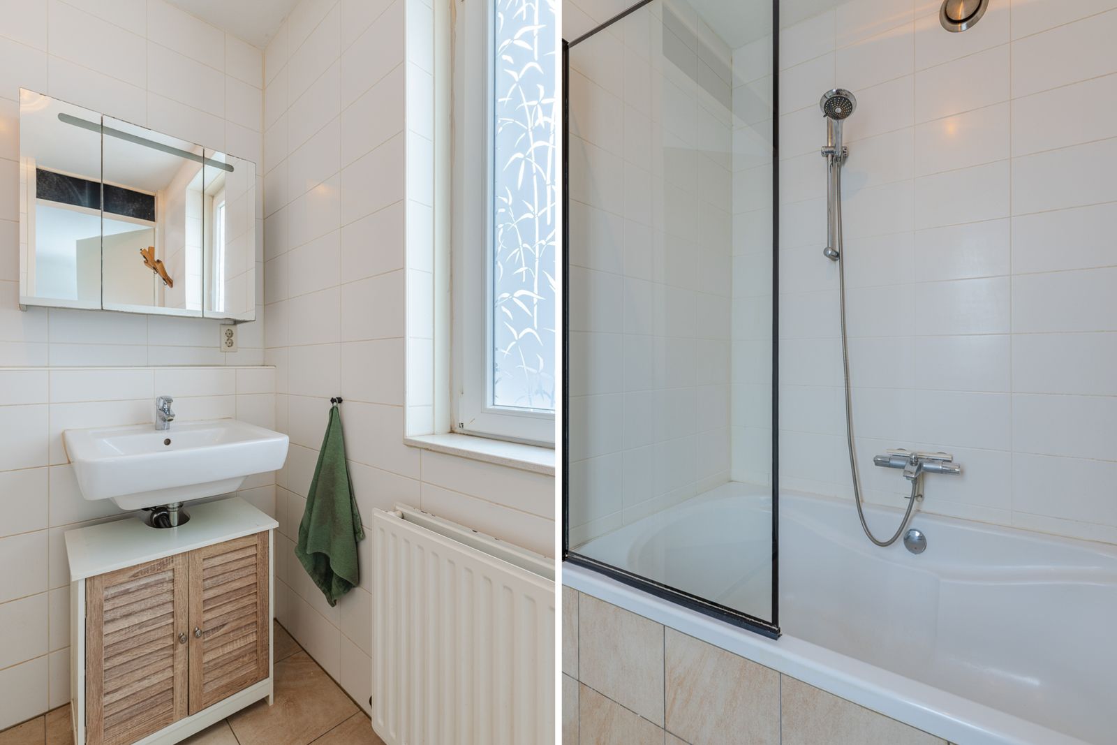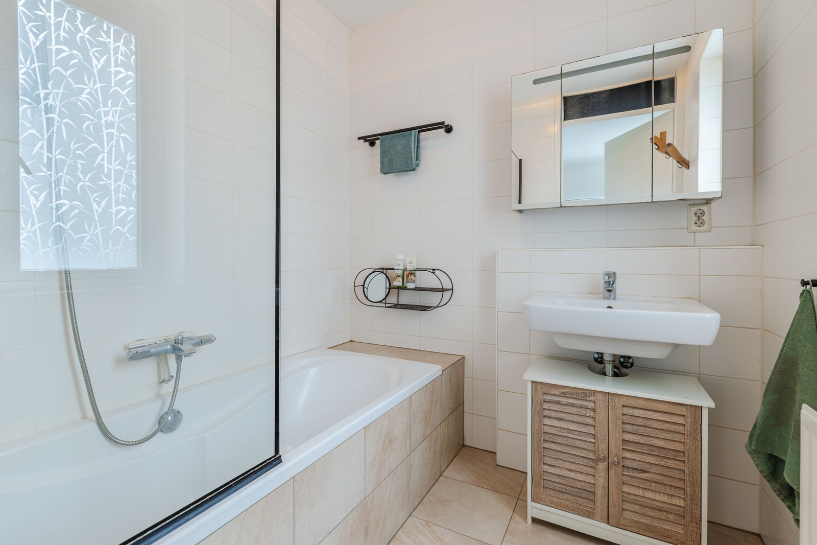 Op de bovenste woonlaag, v.v. click-pvc vloer (met iso), bevindt zich de ruime slaapkamer en toegang tot het dakterras. De slaapkamer kijkt aan beide zijden ook vrij uit, of laat zich door de Veneta-raambekleding verduisteren. De badkamer is netjes afgewerkt, volledig betegeld met een duo-ligbad&douche en wastafelmeubel.
