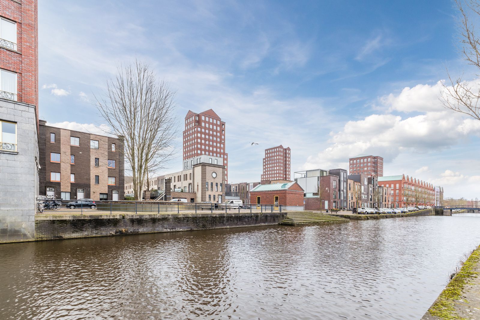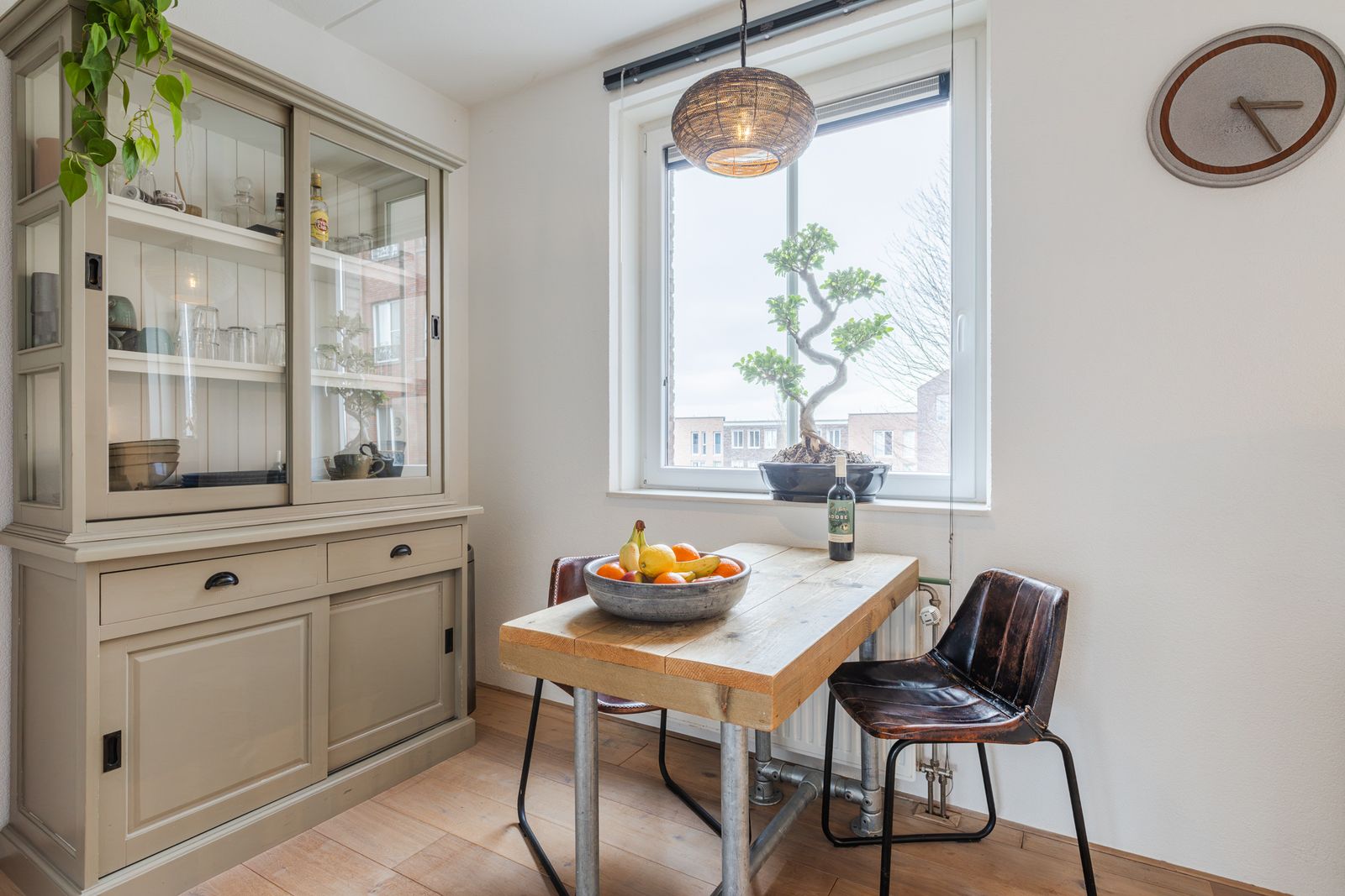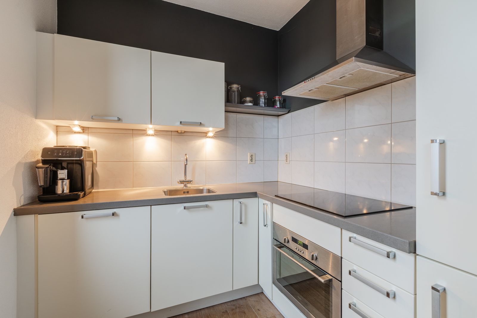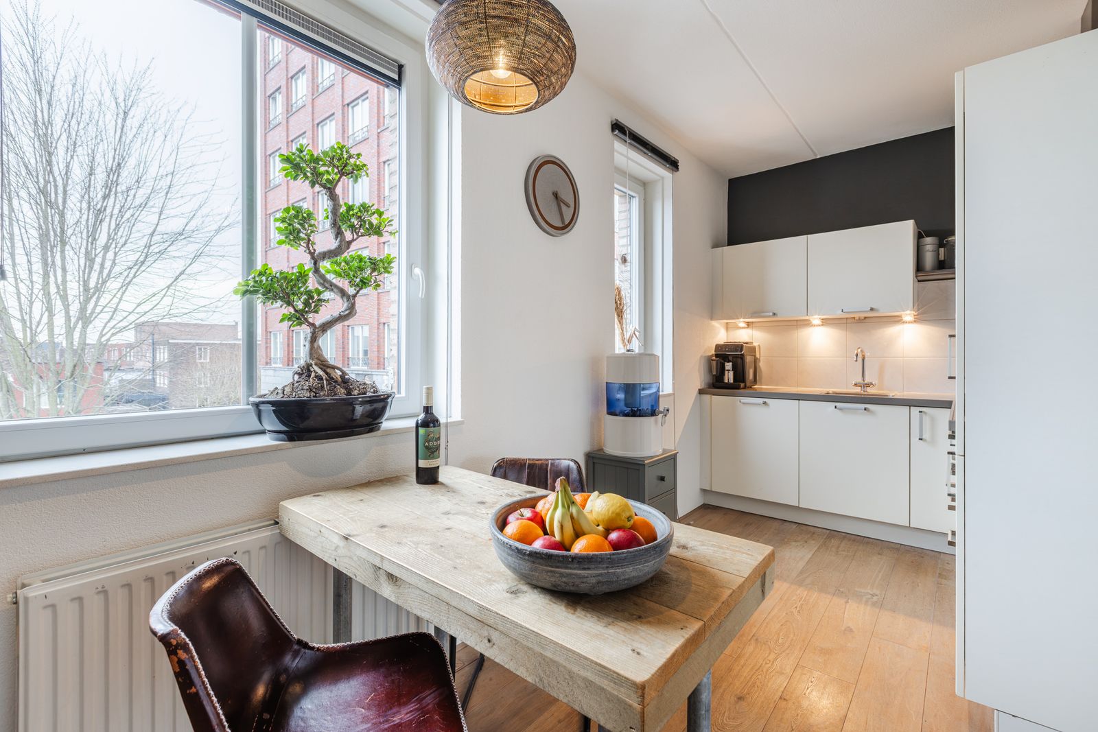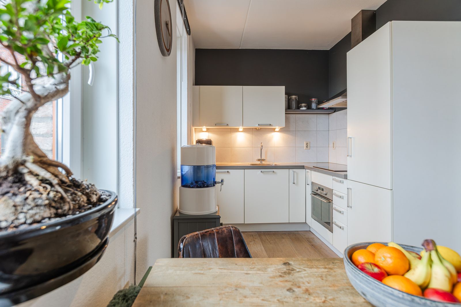 Aan de andere kant van de verdieping bevindt zich de keuken met een net keukenblok voorzien van inbouwapparatuur (vaatwasser, combi magnetron/oven, inductiekookplaat en koel/vriescombinatie), afgewerkt met een natuur stenen aanrechtblad. De keuken is praktisch ingedeeld met genoeg ruimte voor een mooie eetgelegenheid met vrij uitzicht op de Laak en ondergaande zon.